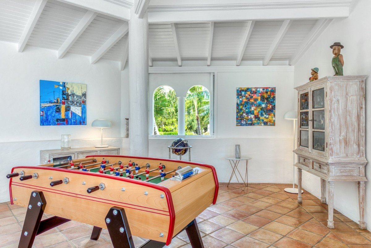 The villa Belle Fontaine offers an expansive deck featuring a stunning double pool. The larger pool is complemented by a smaller pool with a tiled table inset, creating a unique and inviting space for relaxation. Adjacent to the pool area, a spacious gazebo provides ample seating for lounging and dining, along with a built-in BBQ for outdoor cooking.