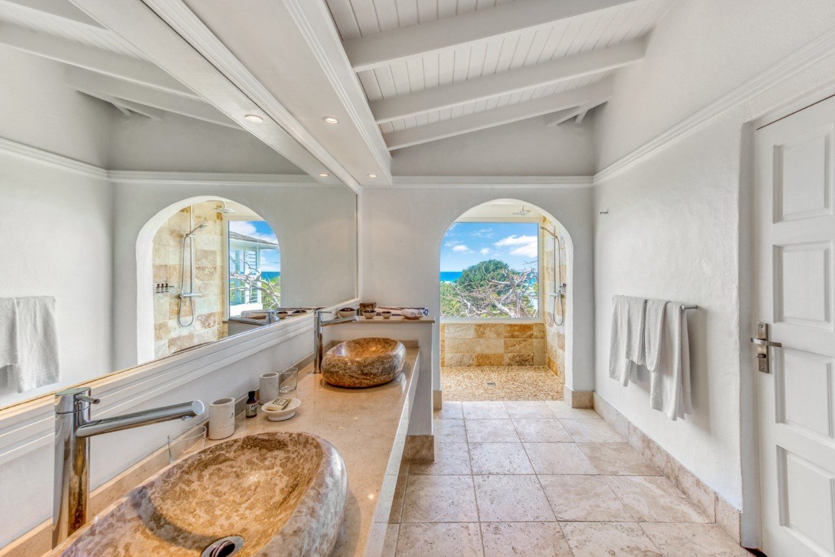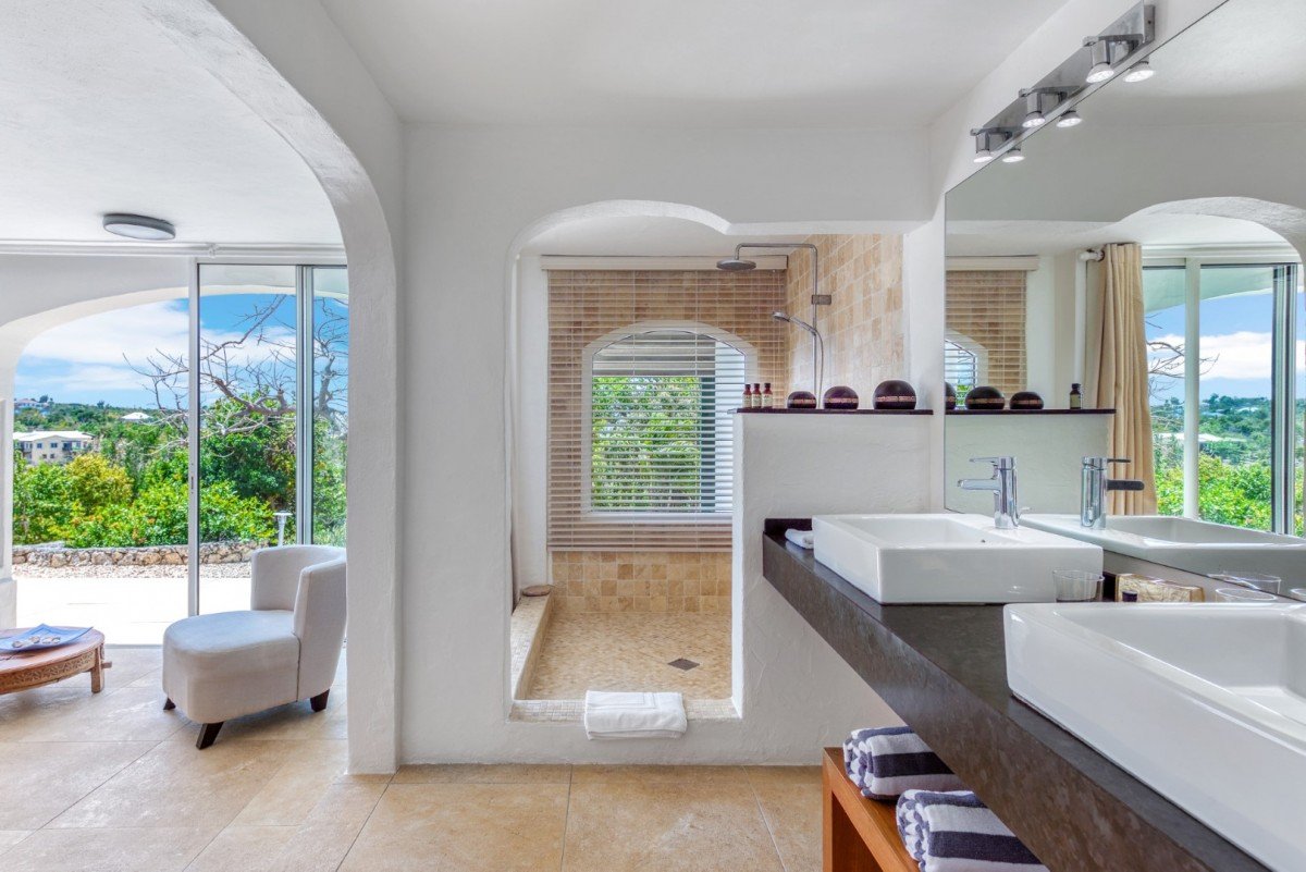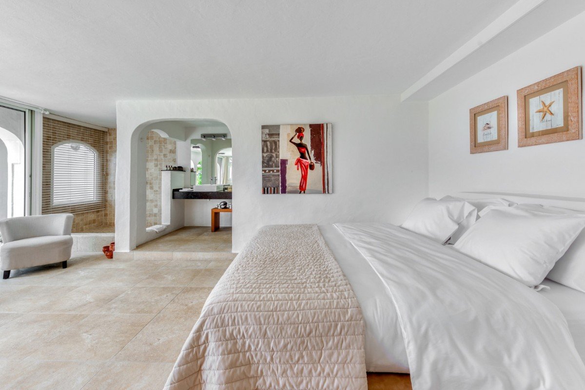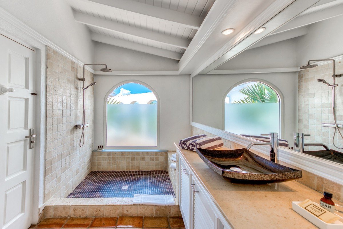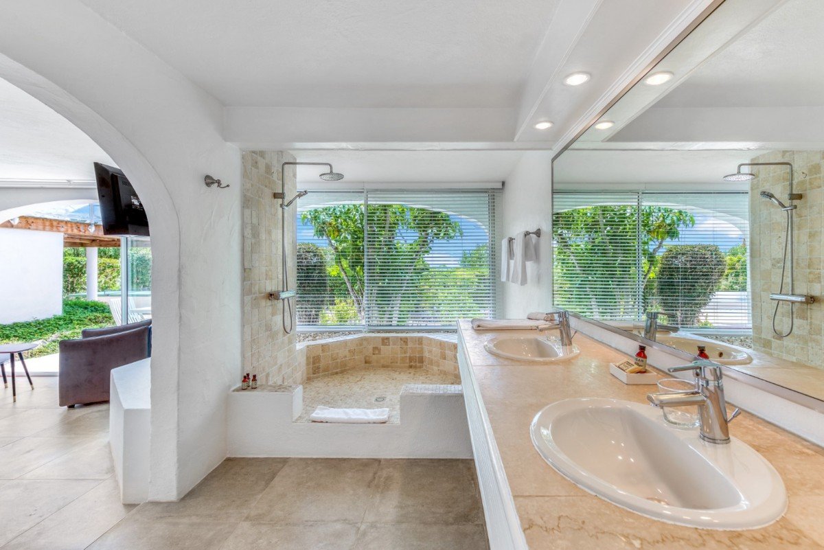 Villa Belle Fontaine includes five spacious bedrooms of equal size. Three offer sea views, while the other two overlook the garden. The spa-style bathrooms are beautifully designed, featuring luxurious fixtures and large walk-in showers with views of the sea or garden. One bathroom also includes a private outdoor patio.