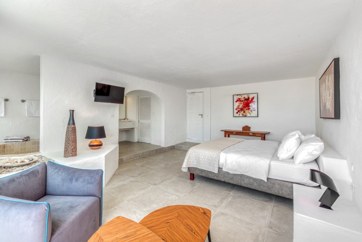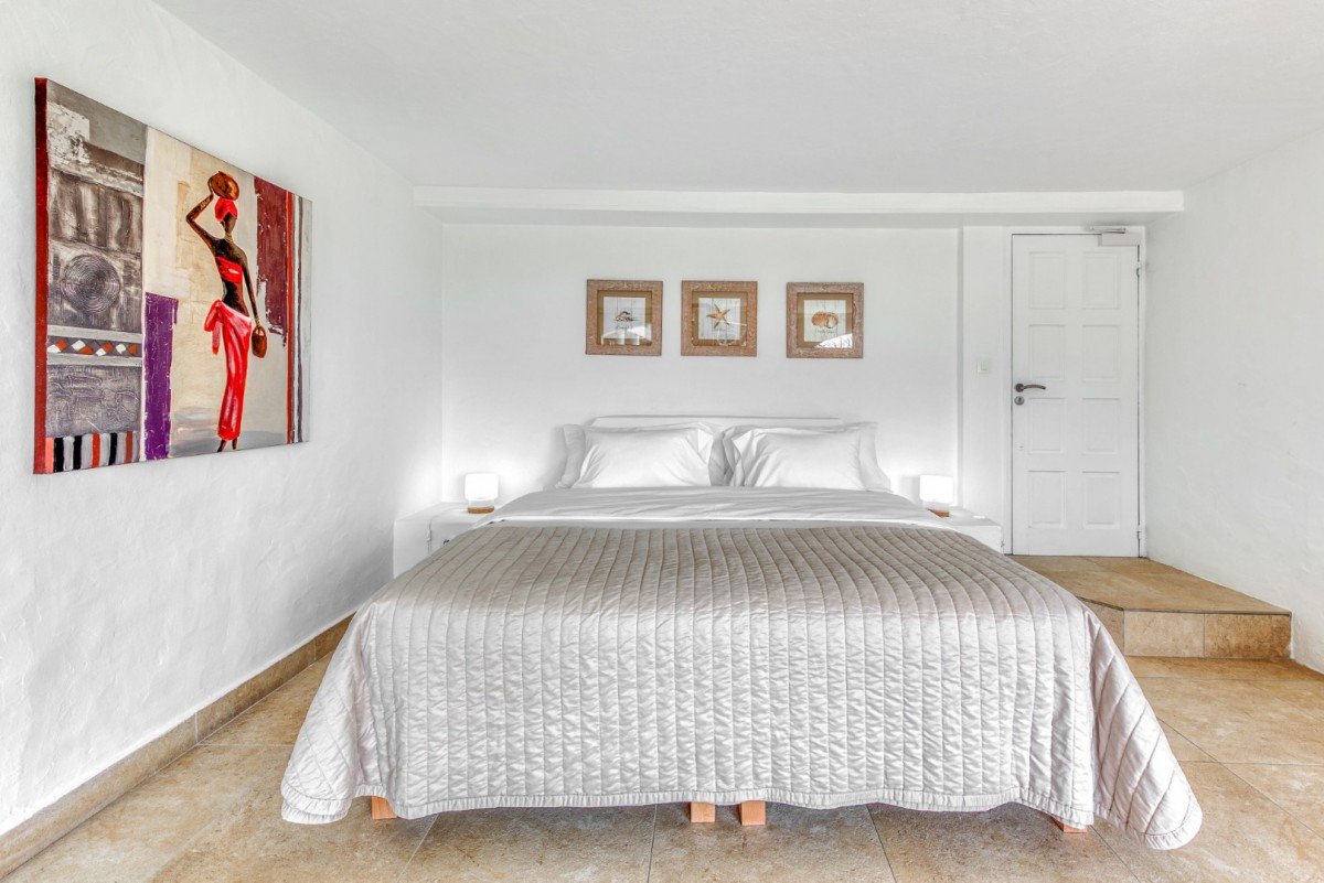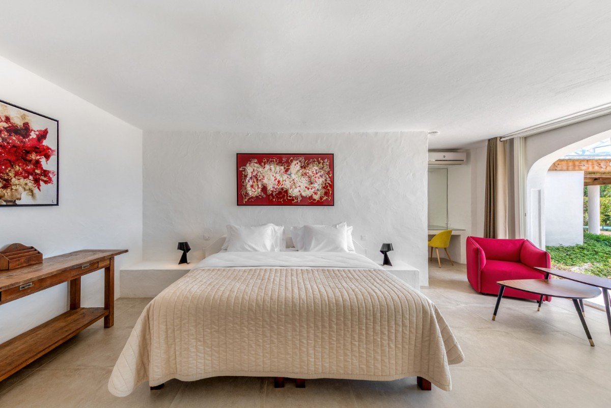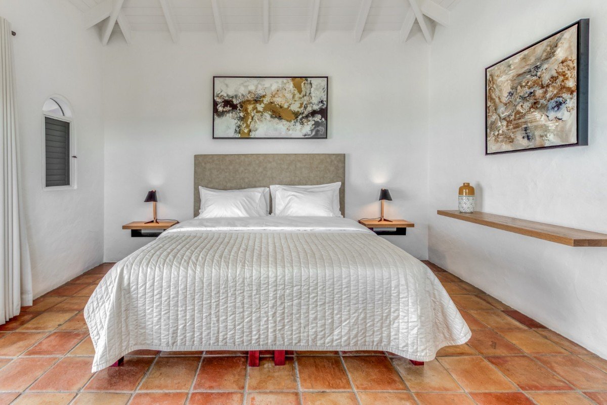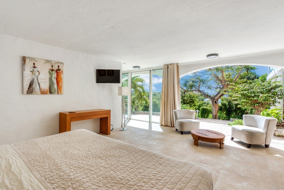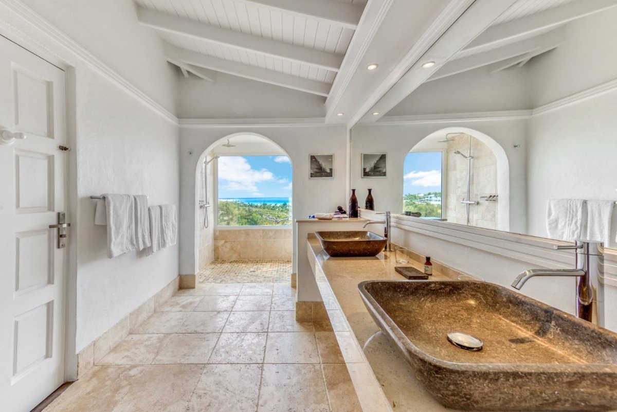 Villa Belle Fontaine includes five spacious bedrooms of equal size. Three offer sea views, while the other two overlook the garden. The spa-style bathrooms are beautifully designed, featuring luxurious fixtures and large walk-in showers with views of the sea or garden. One bathroom also includes a private outdoor patio.