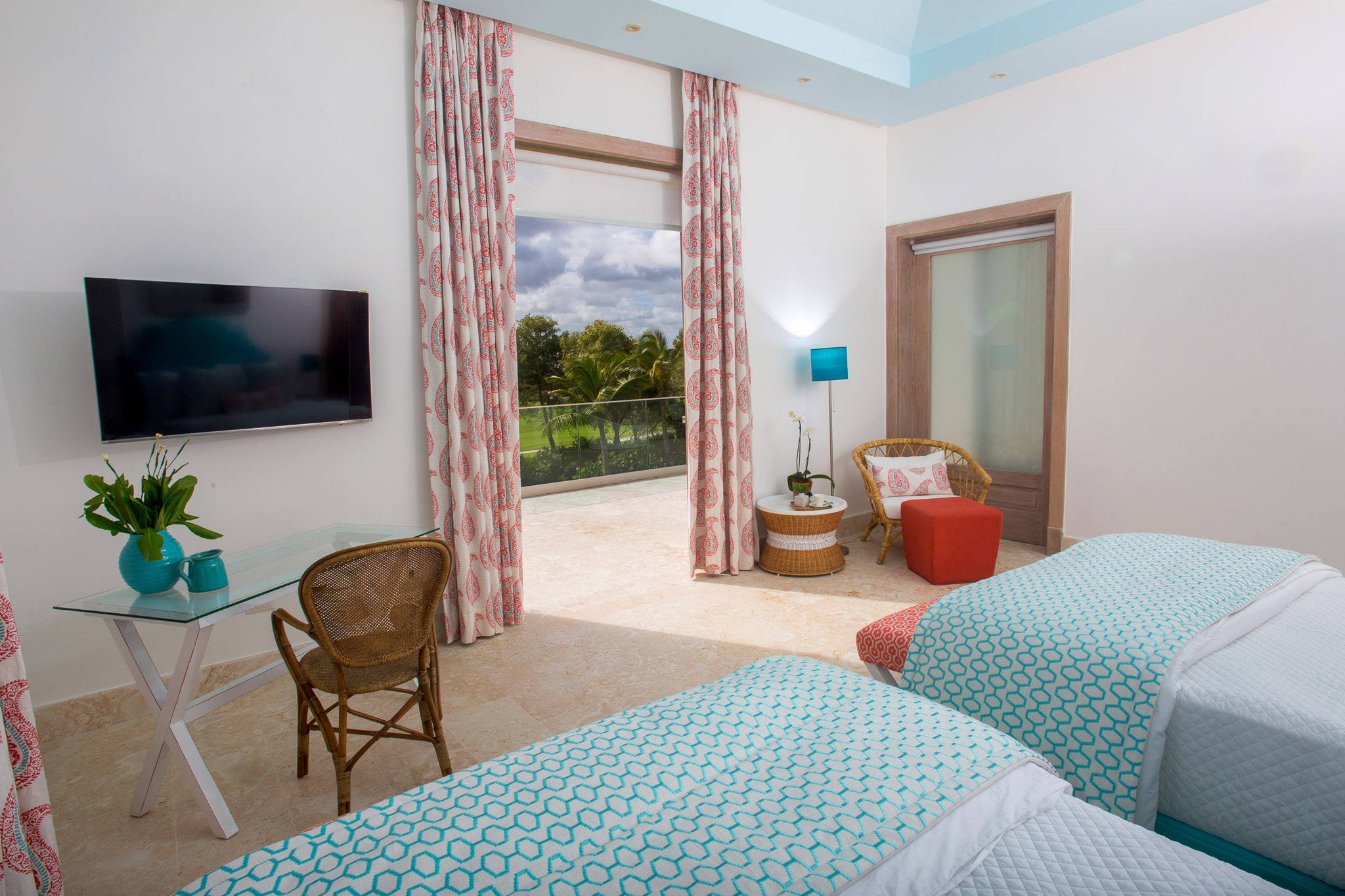 Inside, the home comfortably accommodates up to ten guests. Four bedrooms each with their own ensuite bathroom deliver both privacy and comfort. Two of the bedrooms are masters, featuring king-size beds, walk-in closets, and their own special vantage points—one on the ground floor with easy access to the terrace and pool, the other upstairs with a balcony that frames sweeping golf-course views. The two remaining bedrooms — each with two full beds — offer generous space and their own bath, ideal for family or friends.