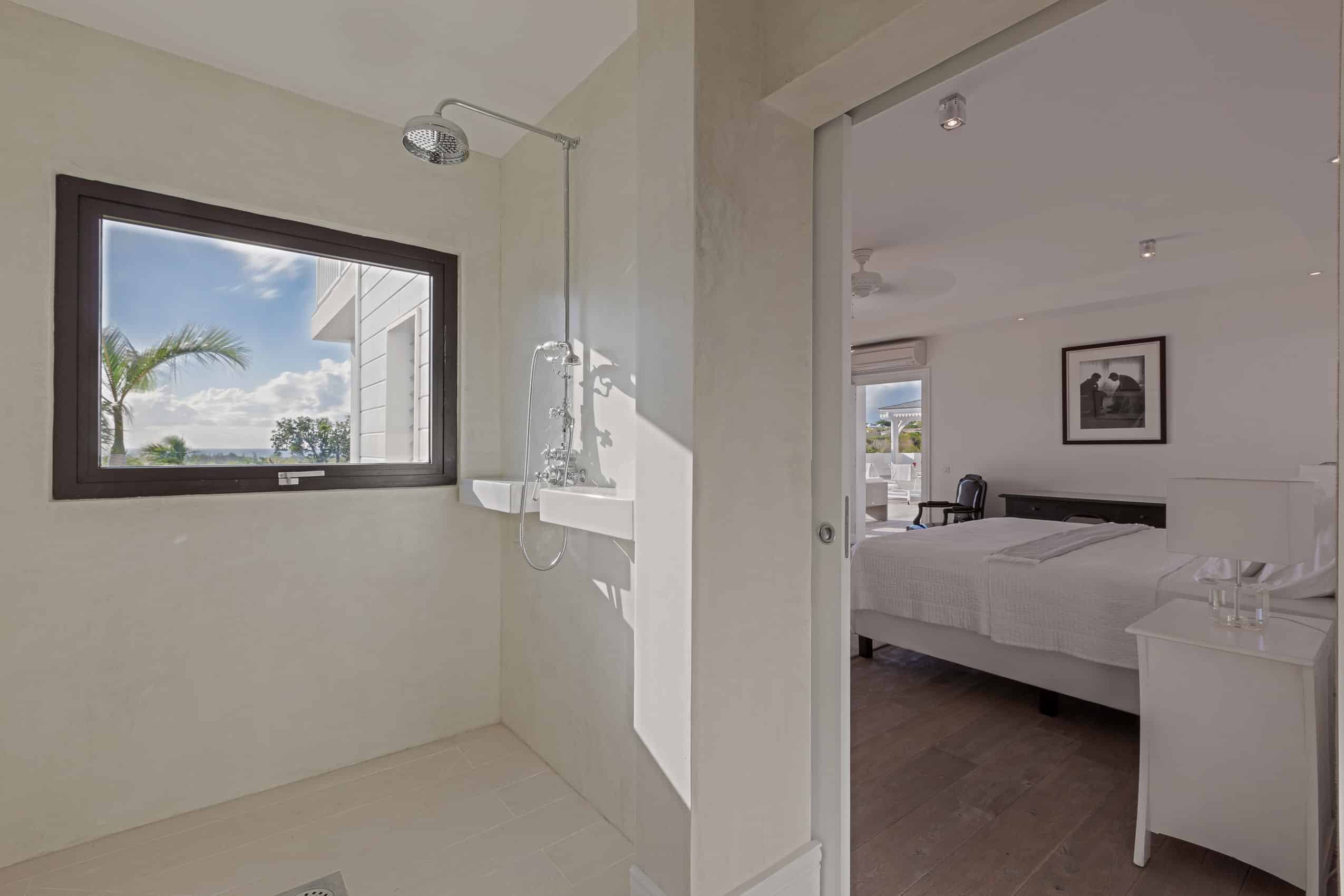 Built on two levels, the villa offers four king-size bedrooms. Two are located on the same level as the kitchen and living area, while the remaining four open onto the terrace and infinity pool. The large open living and dining space, along with a fully equipped kitchen, overlooks the pool deck, where guests can enjoy al fresco dining under the expansive gazebo.