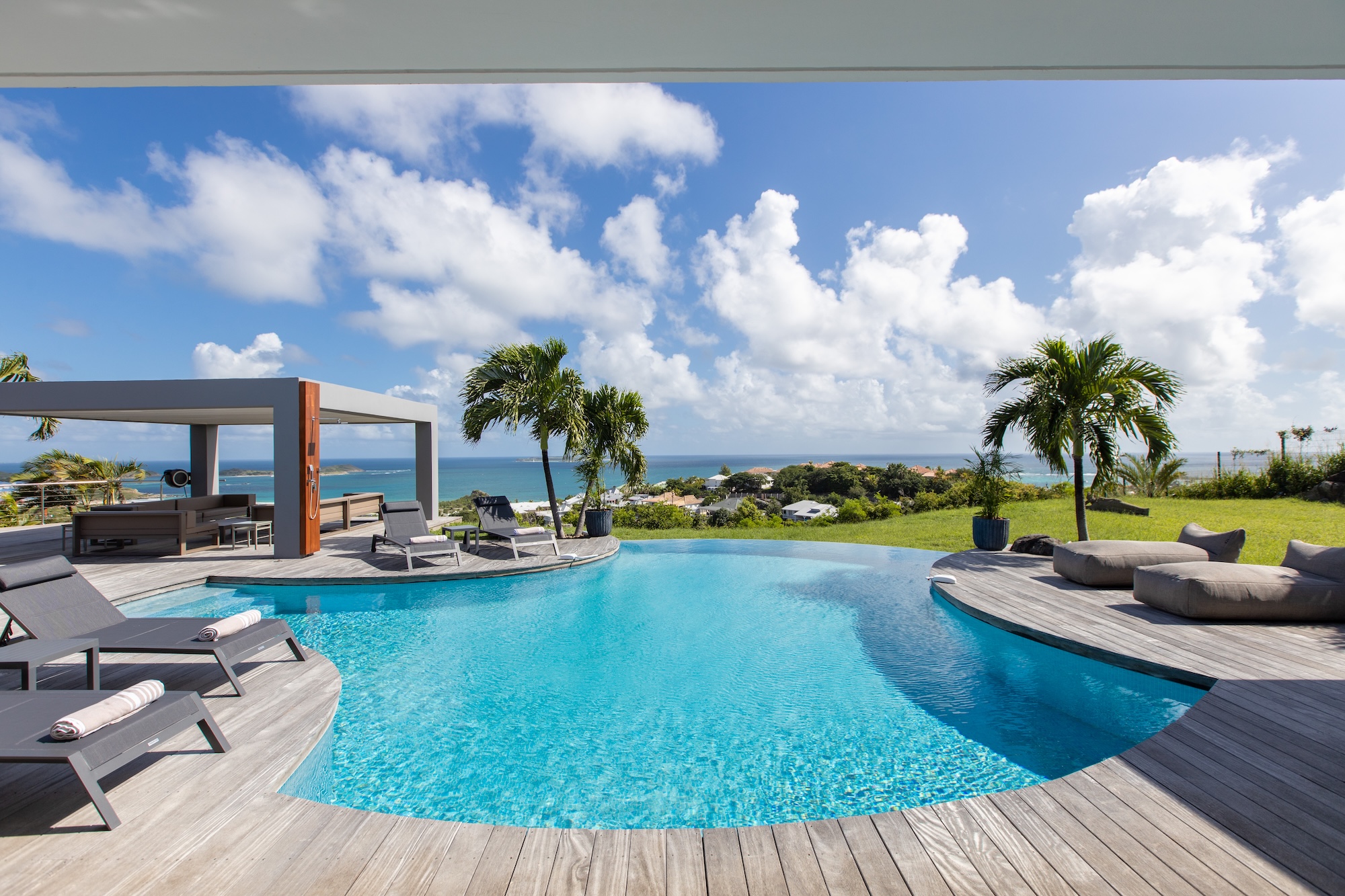 This extraordinary estate style villa enchants the moment you enter the gate. The long, palm-lined drive brings you to a large private courtyard and garden. Beyond the front door is a stunning house and one of the most dazzling oceans views on island. Panoramic vistas flow from every room and terrace. The colors are magical. An expansive stretch of sapphire sea is framed by the villa’s gardens and the rich blue sky. The large contoured pool edges overlap the lawn adding crystal blue tones to the scene.