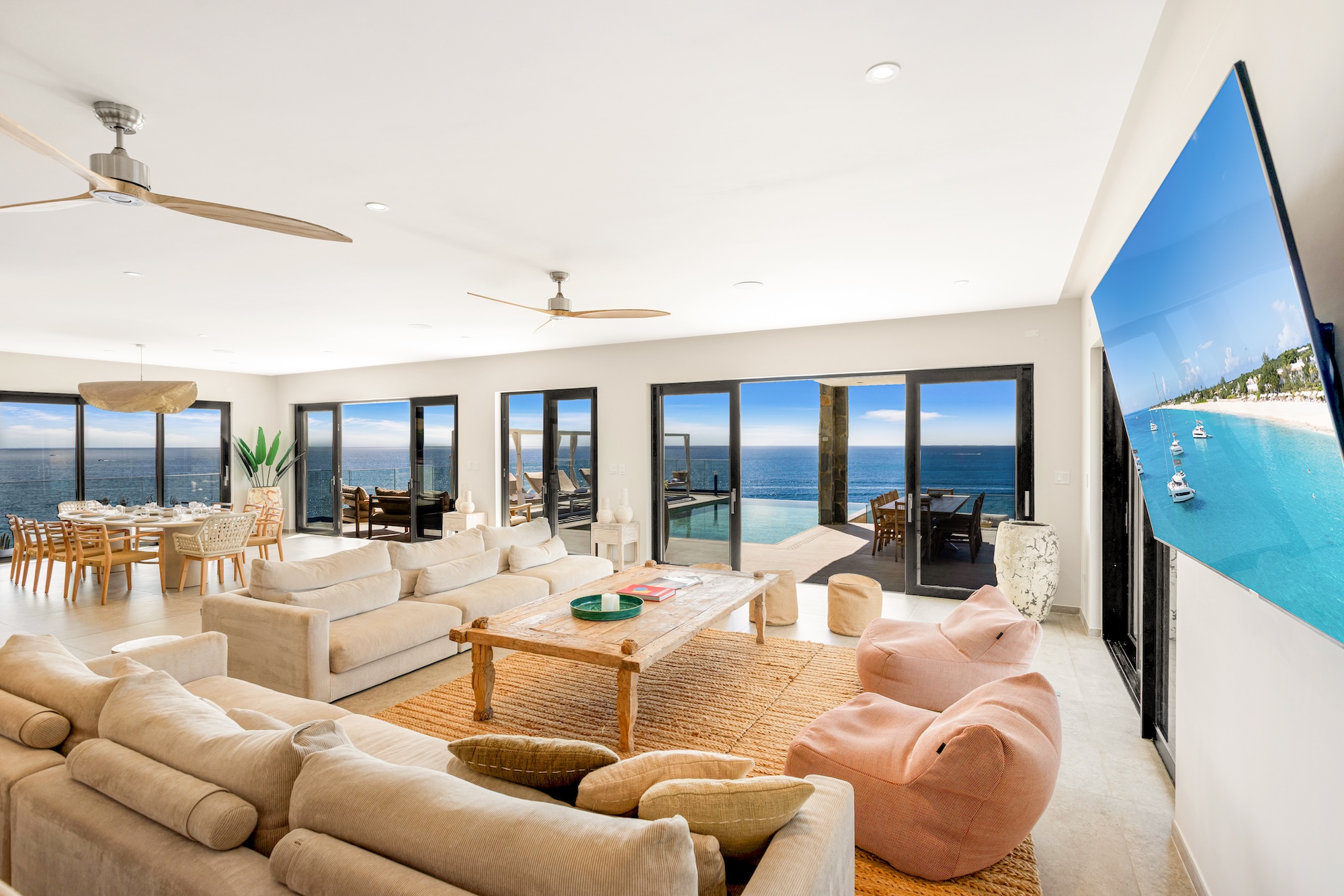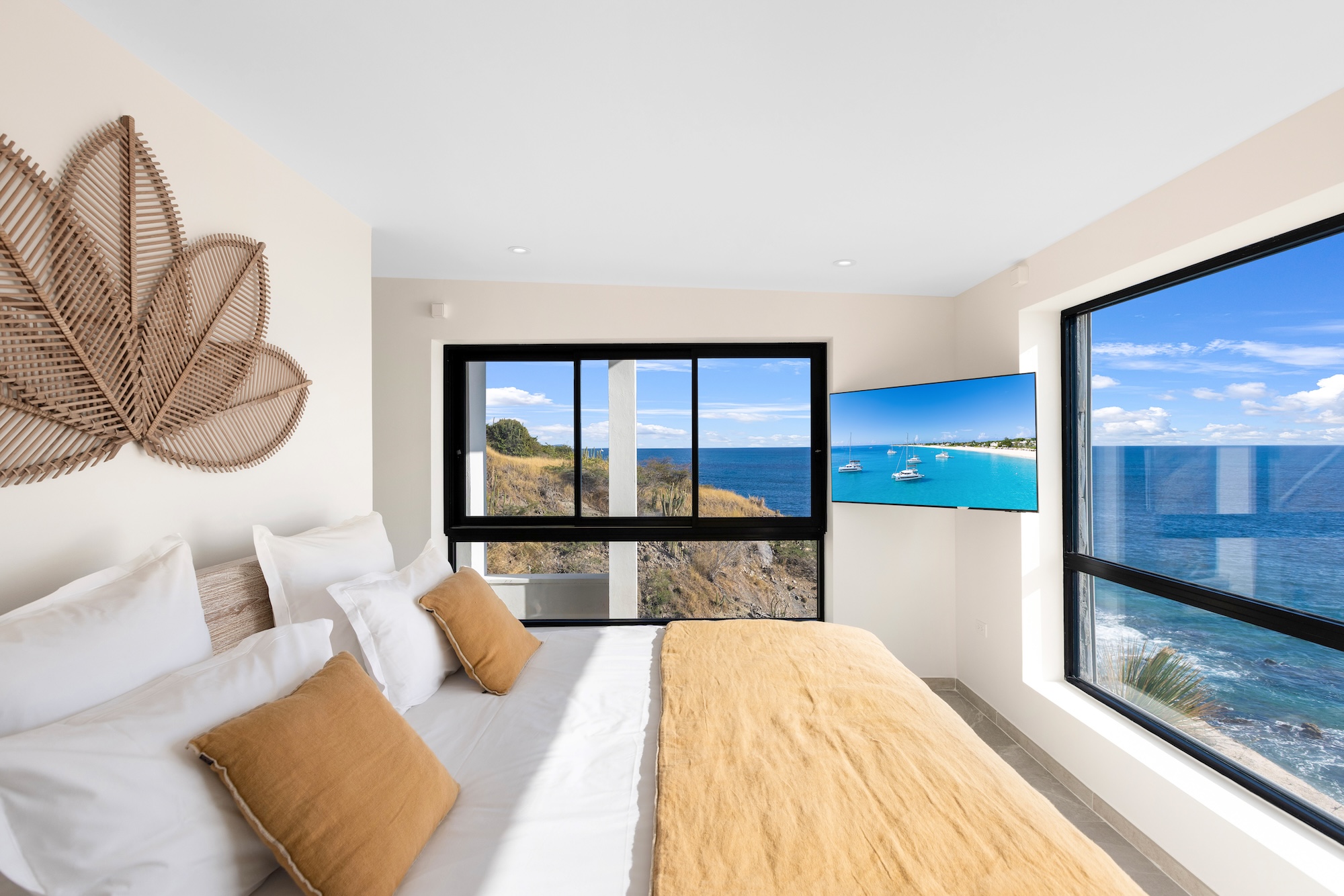 Upon entering, you’re greeted by a sense of spaciousness and luminosity. The open-concept design provides sweeping views of the azure Caribbean waters through expansive windows. The interior decor, characterized by subtle yet tasteful neutral tones and high-quality furnishings, complements the villa’s contemporary aesthetic.
