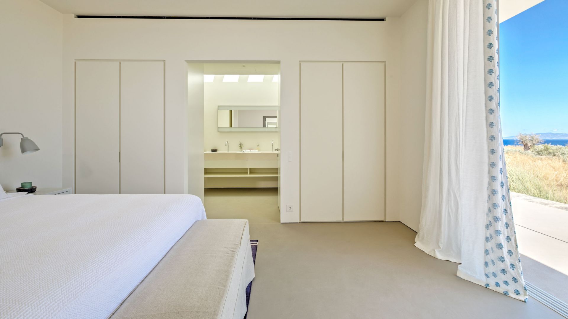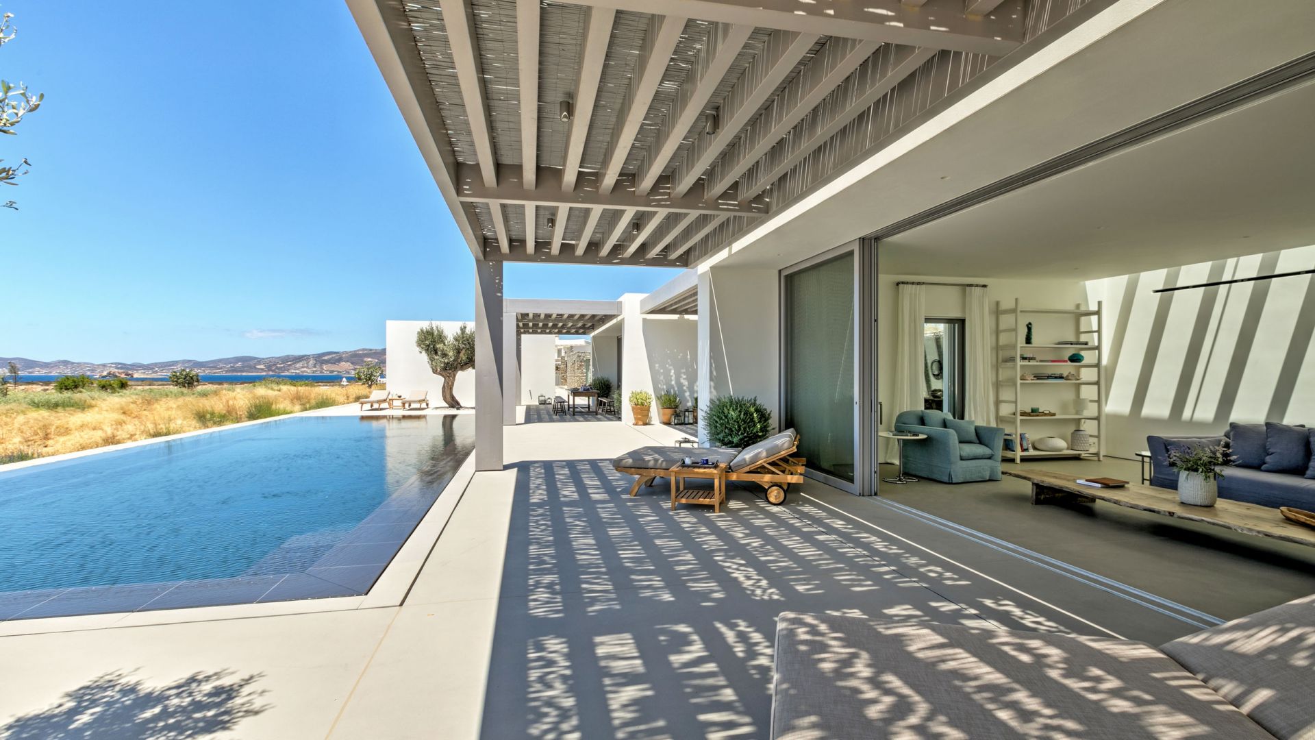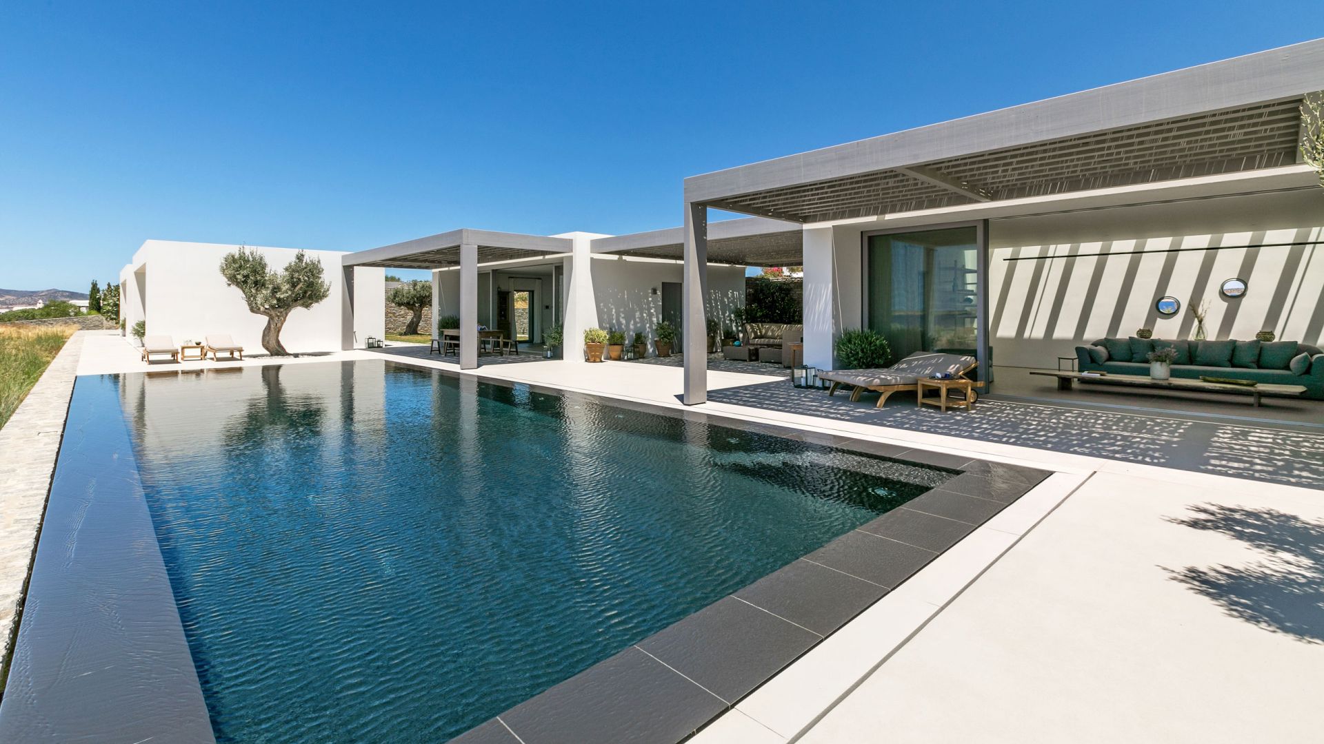 The villa boasts stunning sea views and easy access to a nearby small sandy cove, ideal for a quick swim in the Aegean blue. The contemporary architecture of the villa frames an impressive black granite pool, with deep blue waters mirroring the depths of the Aegean Sea, viewable from any point on the front terrace. Reflecting a traditional architectural trait of Paros, the villa is divided into separate units—one for the common spaces and others for the bedrooms.