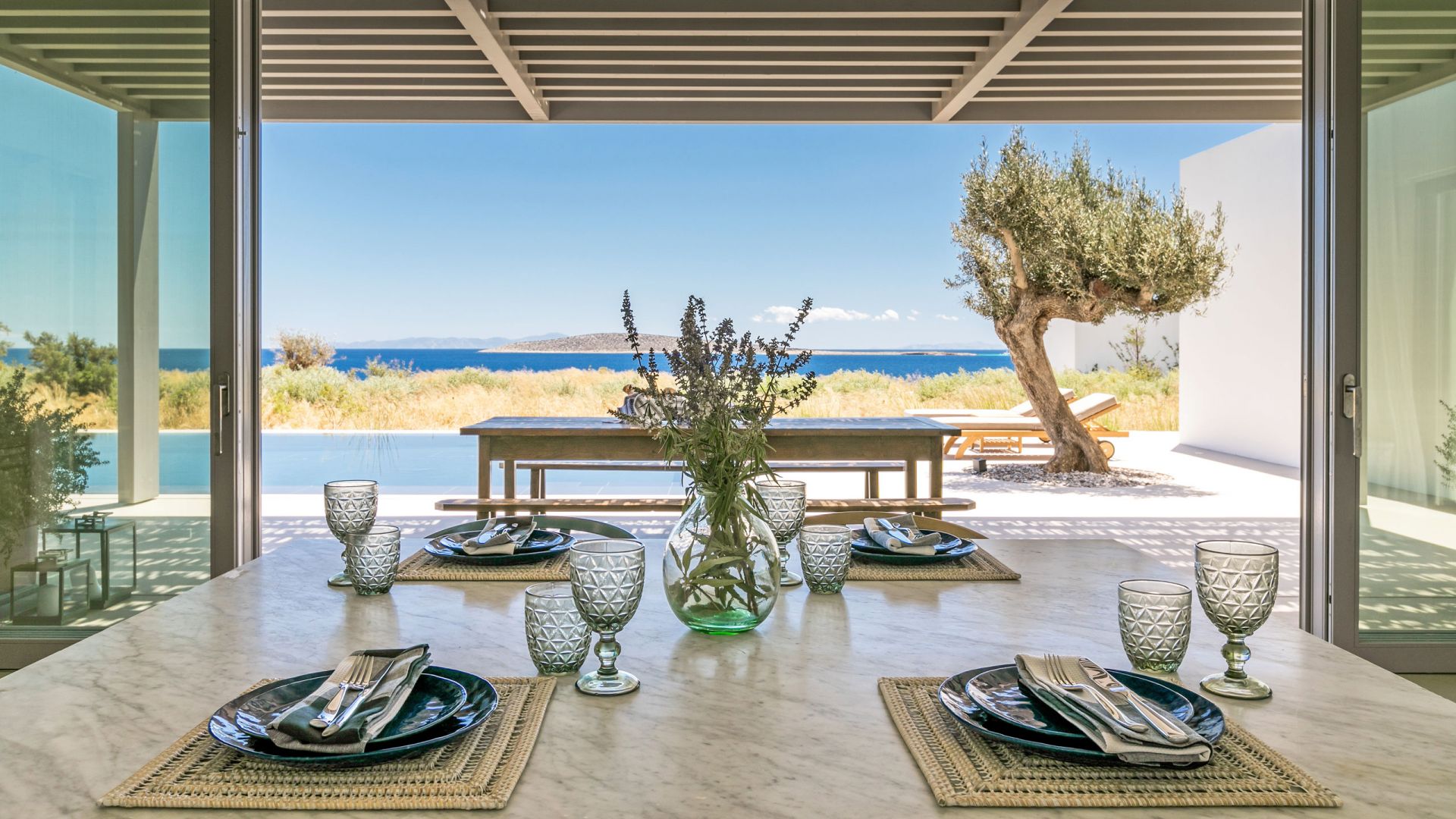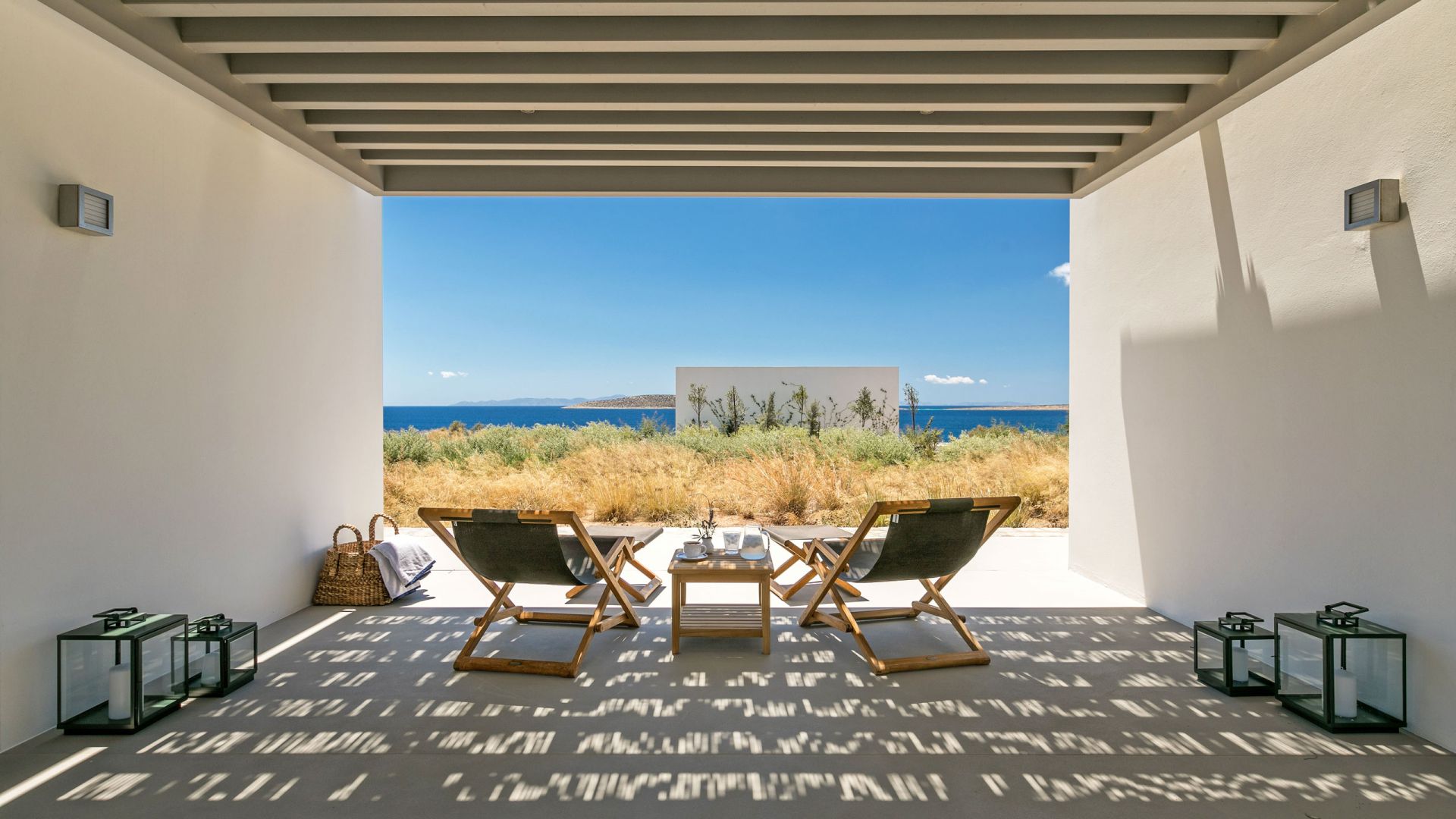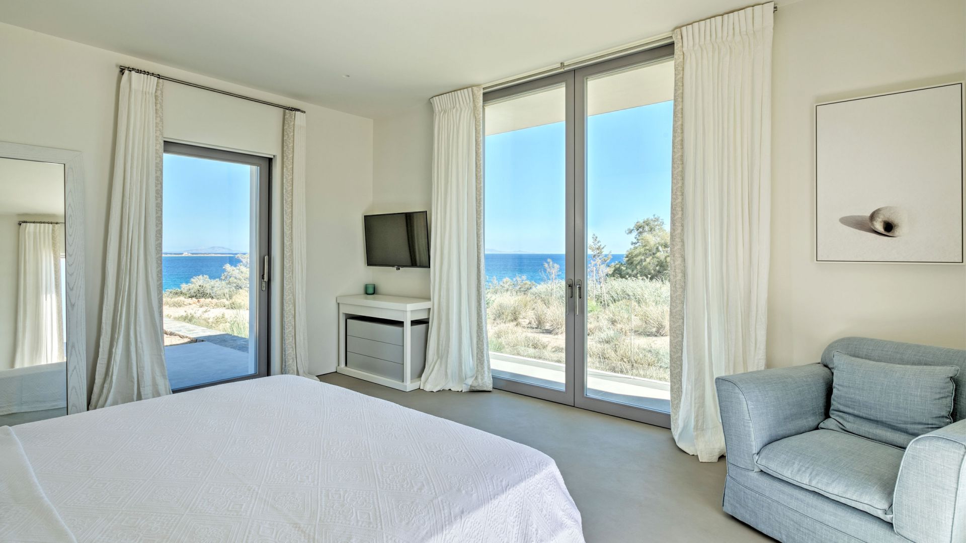 The villa boasts stunning sea views and easy access to a nearby small sandy cove, ideal for a quick swim in the Aegean blue. The contemporary architecture of the villa frames an impressive black granite pool, with deep blue waters mirroring the depths of the Aegean Sea, viewable from any point on the front terrace. Reflecting a traditional architectural trait of Paros, the villa is divided into separate units—one for the common spaces and others for the bedrooms.