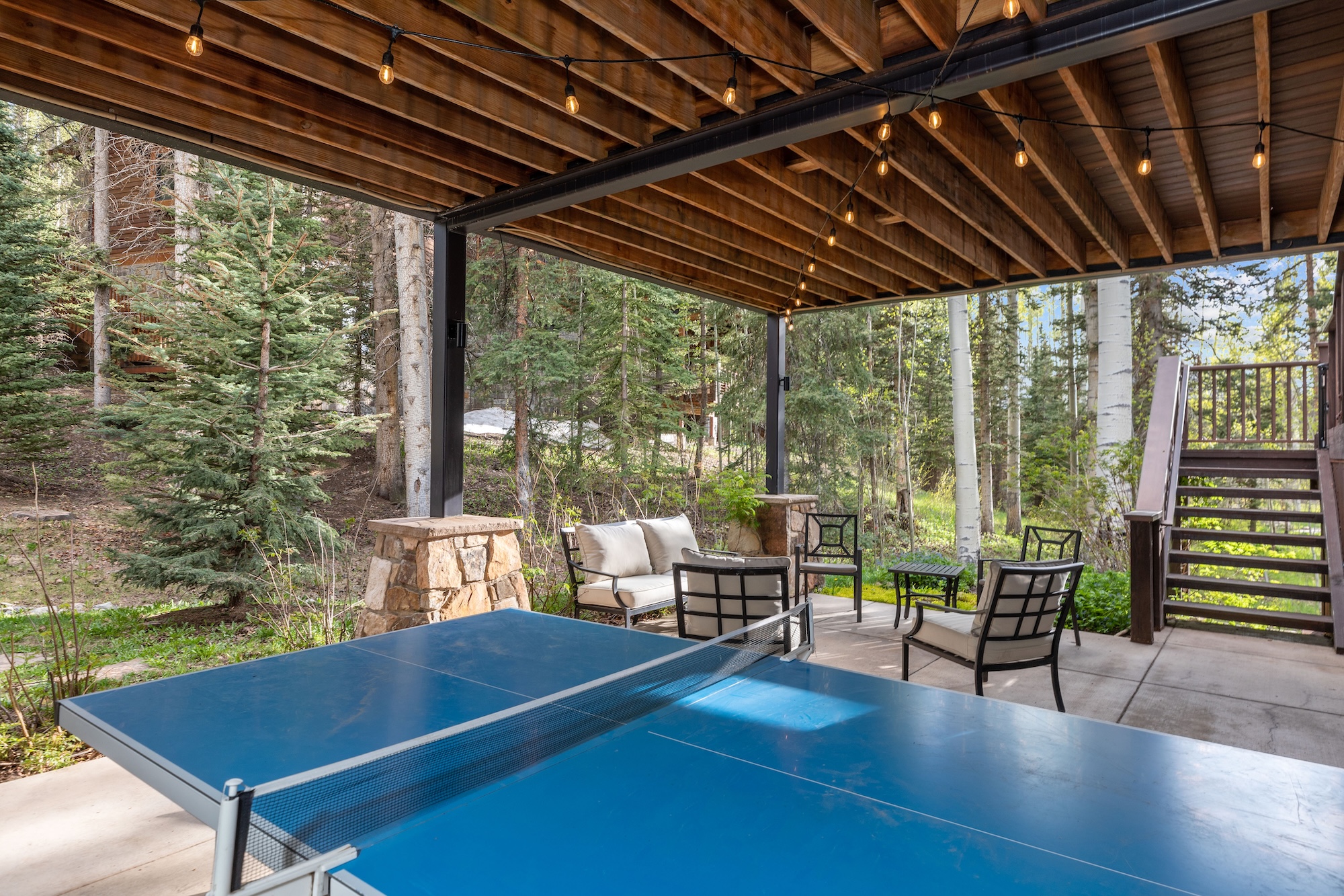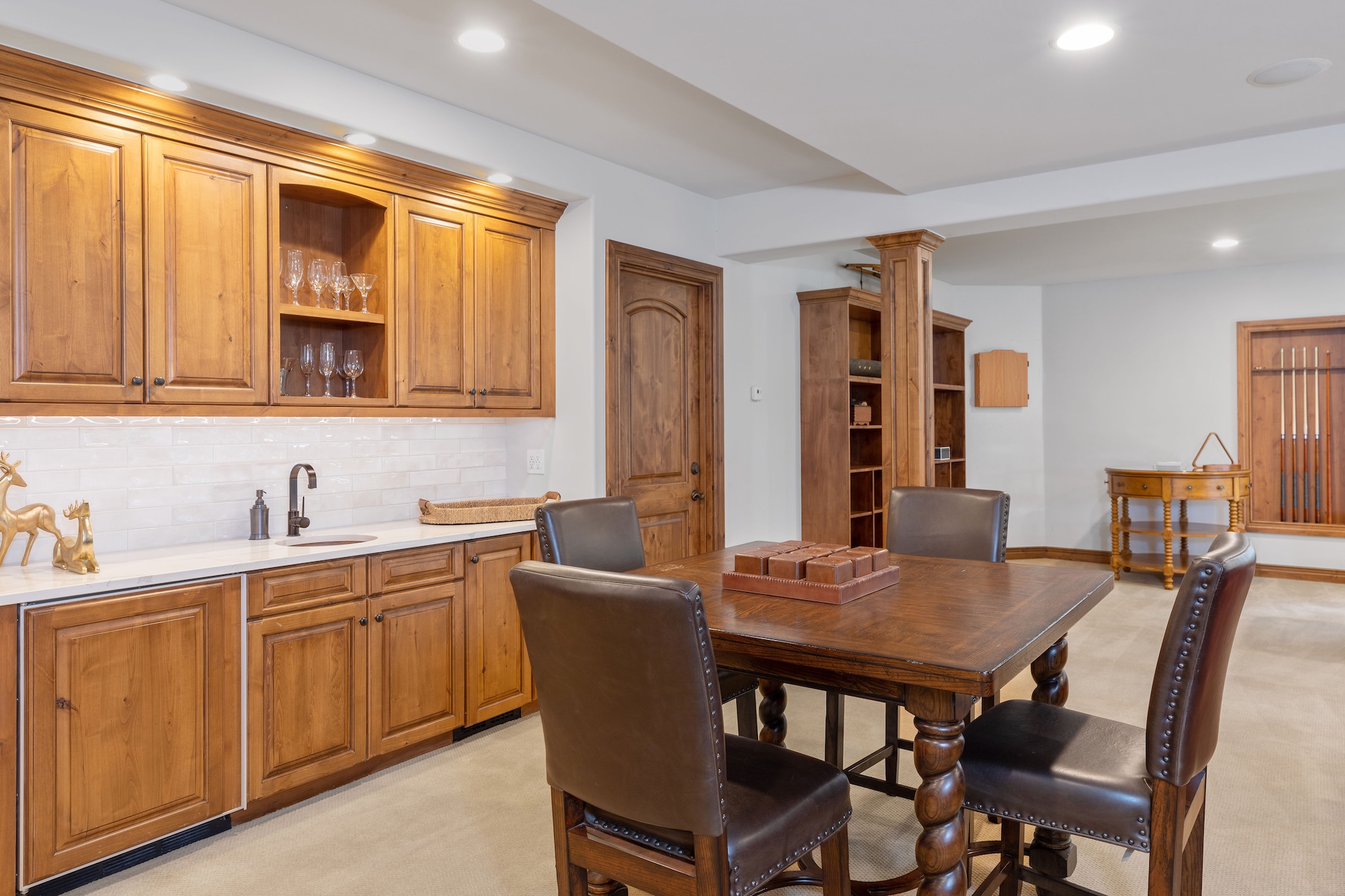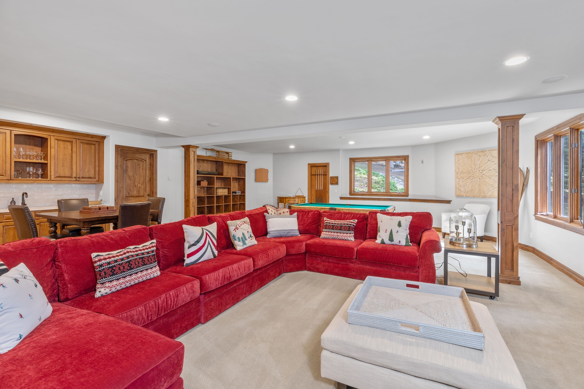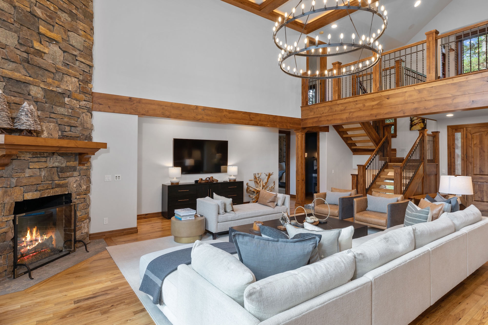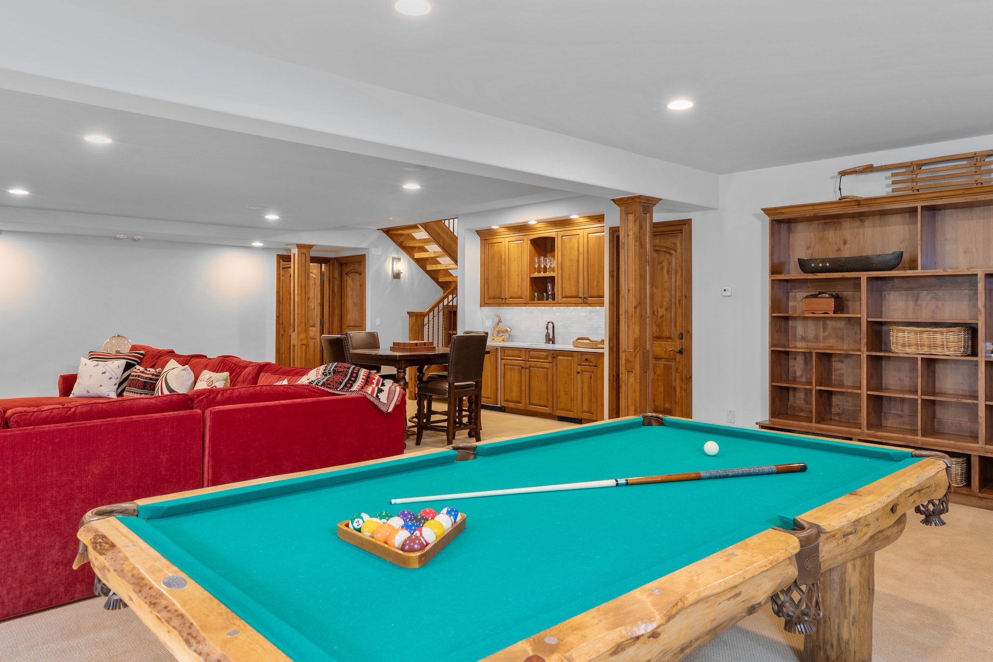 The lower level provides a more relaxed atmosphere, complete with a cozy fireplace, pool table, wet bar, and flat-screen TV—ideal for après-ski evenings with family and friends. Outside, a three-tier deck seamlessly extends the living space into the alpine air, featuring dining and shaded lounge areas, a fire pit, and a hot tub for year-round enjoyment.