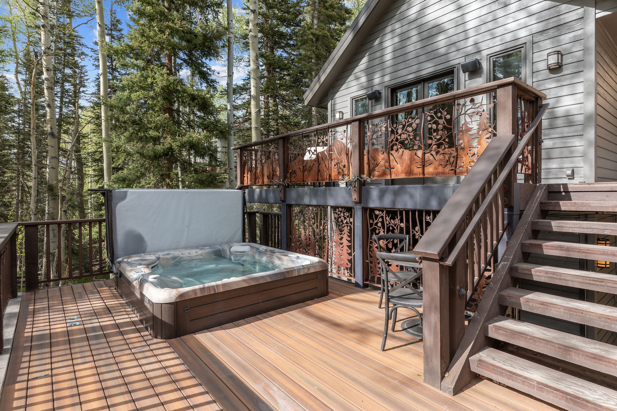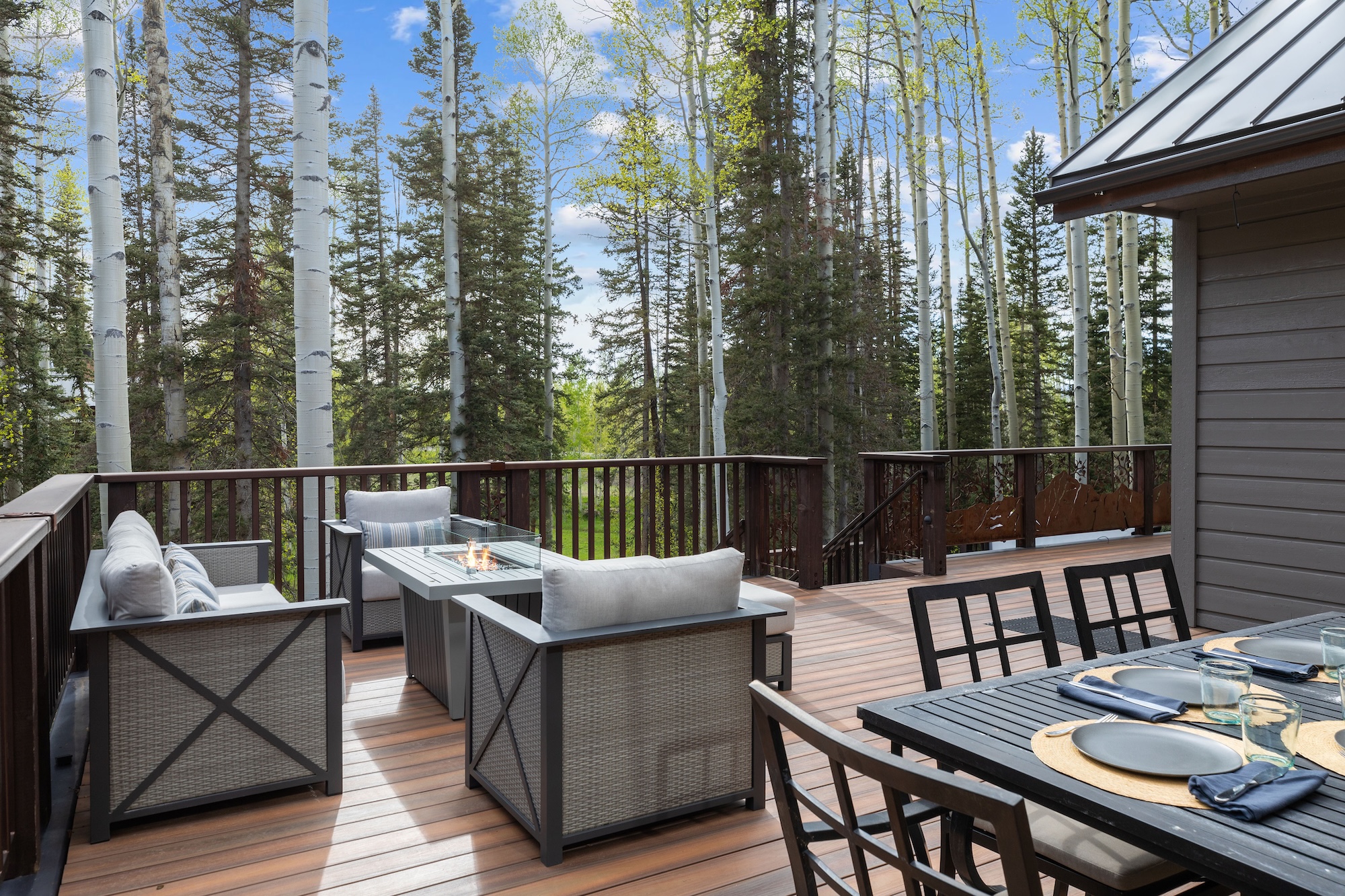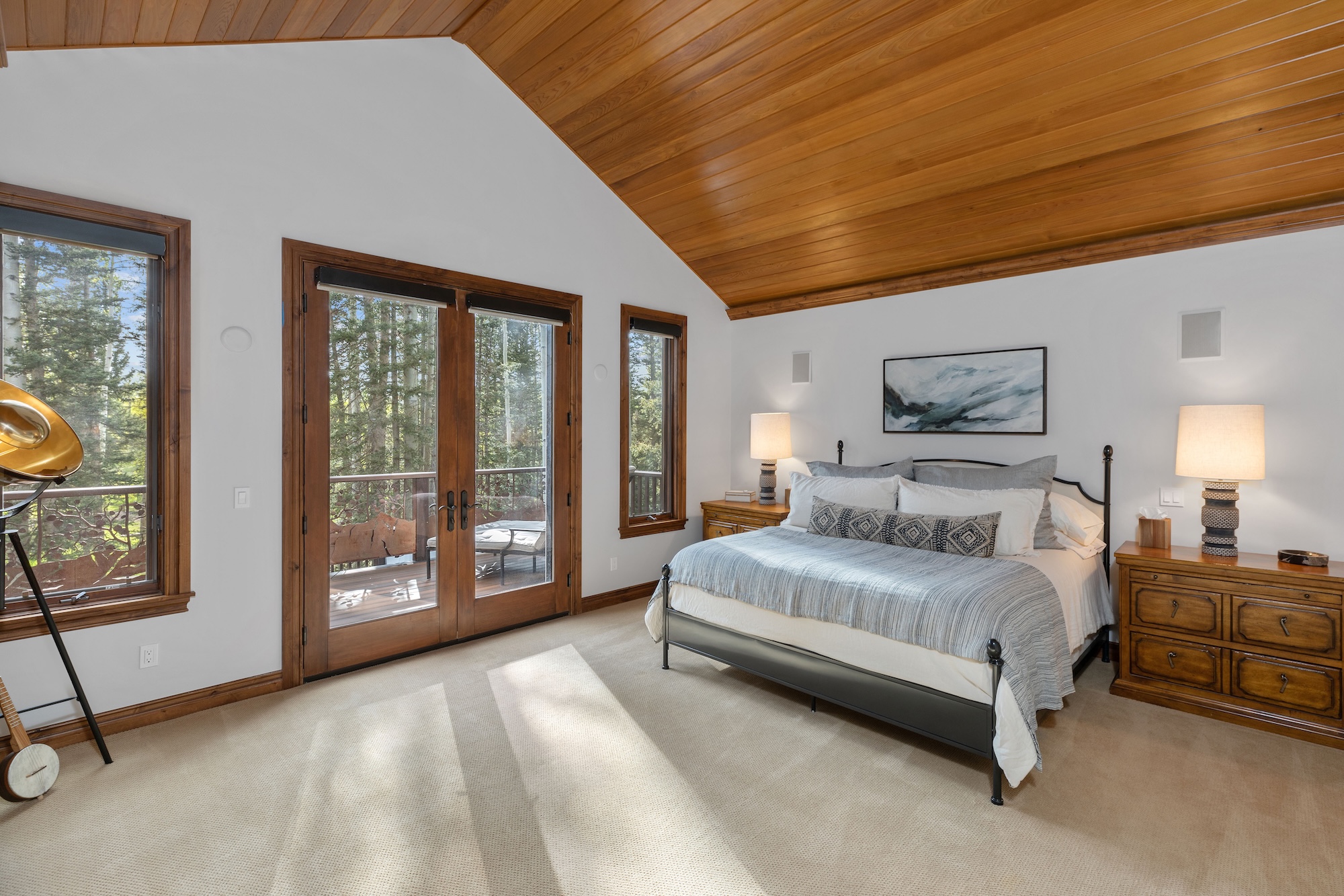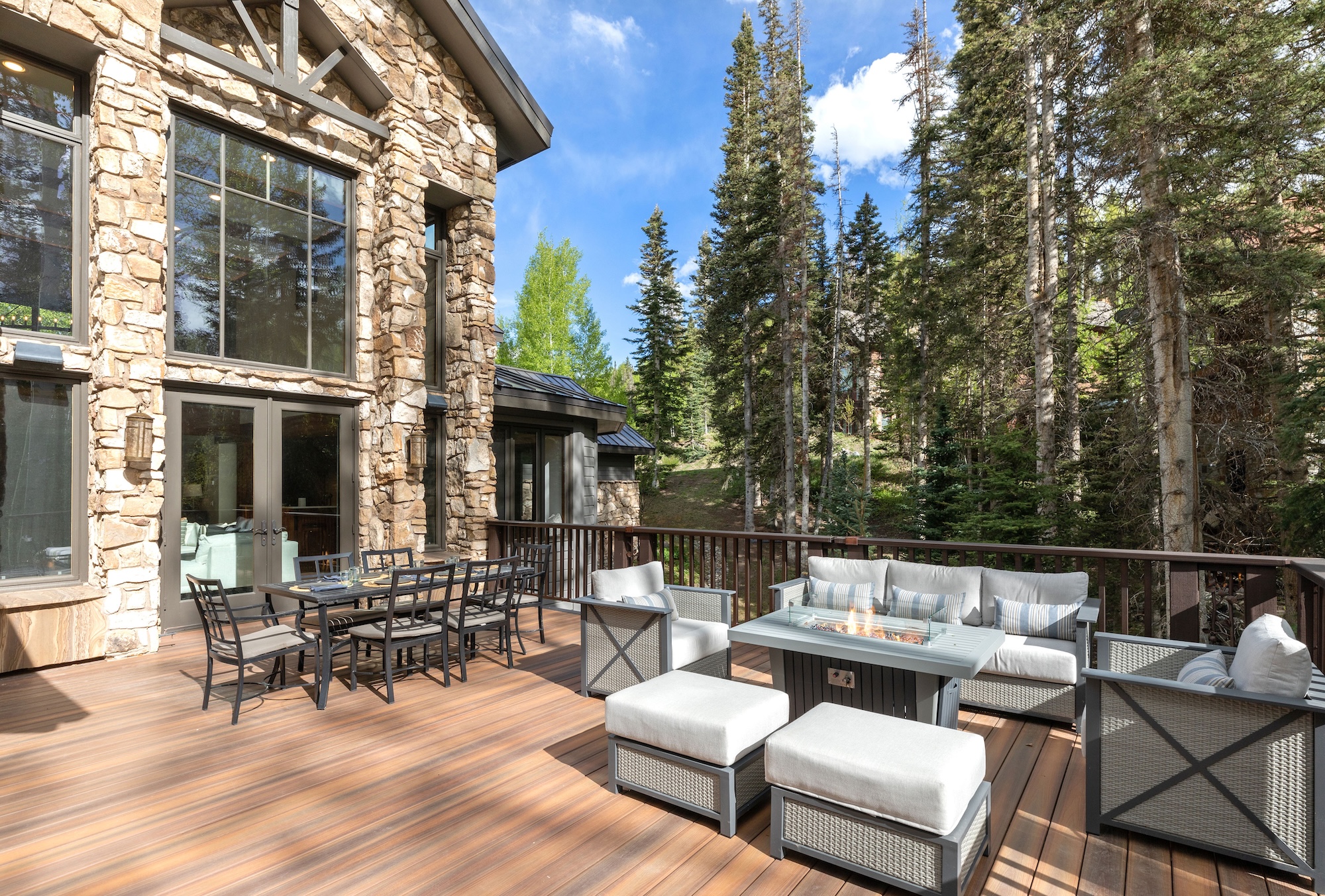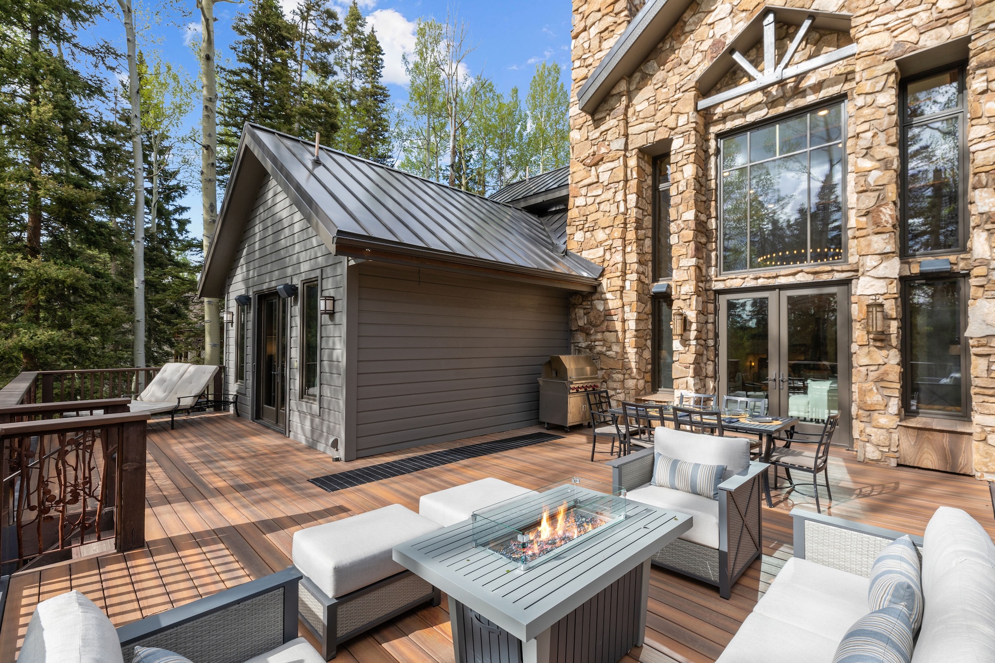 The lower level provides a more relaxed atmosphere, complete with a cozy fireplace, pool table, wet bar, and flat-screen TV—ideal for après-ski evenings with family and friends. Outside, a three-tier deck seamlessly extends the living space into the alpine air, featuring dining and shaded lounge areas, a fire pit, and a hot tub for year-round enjoyment.