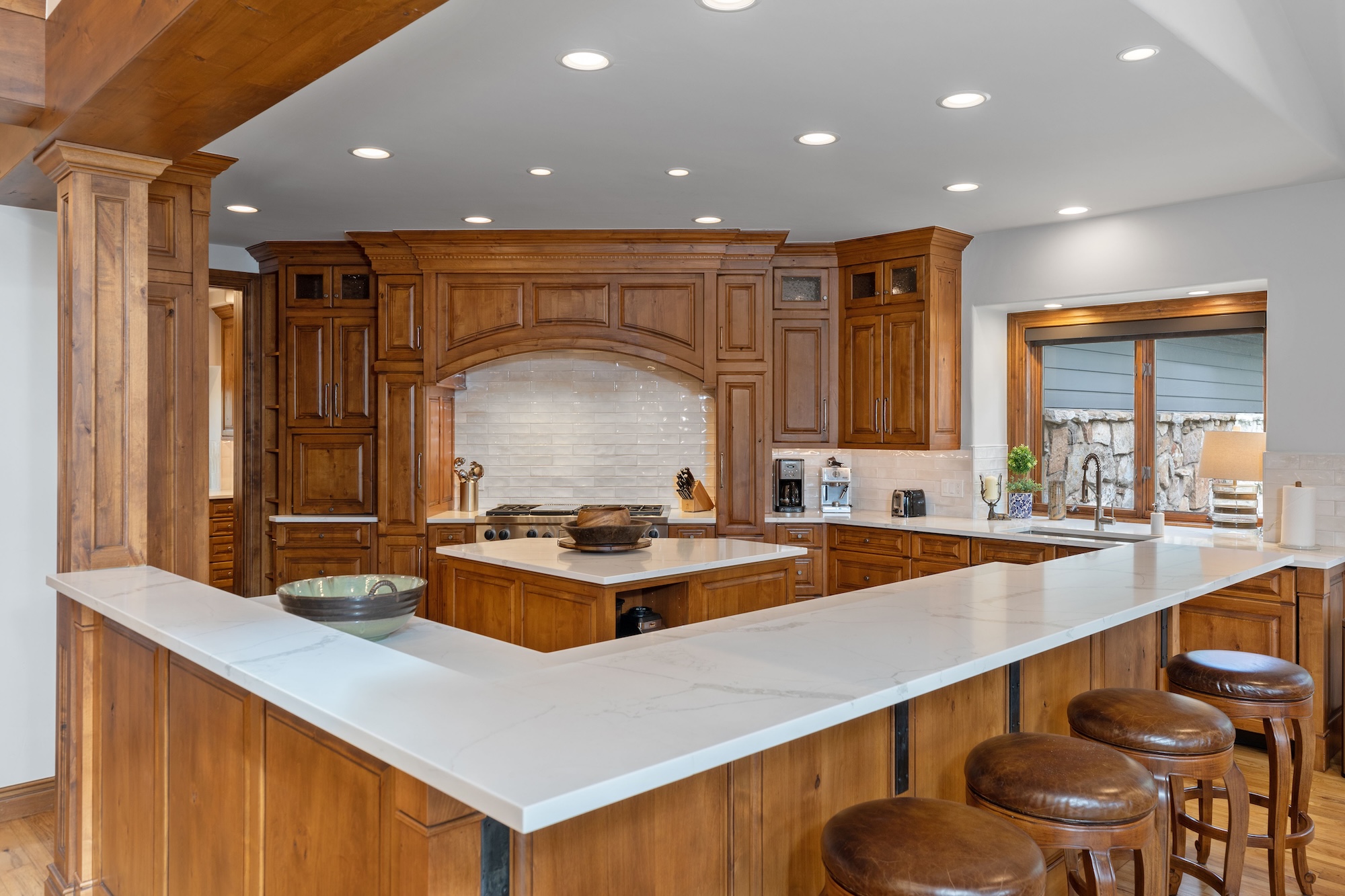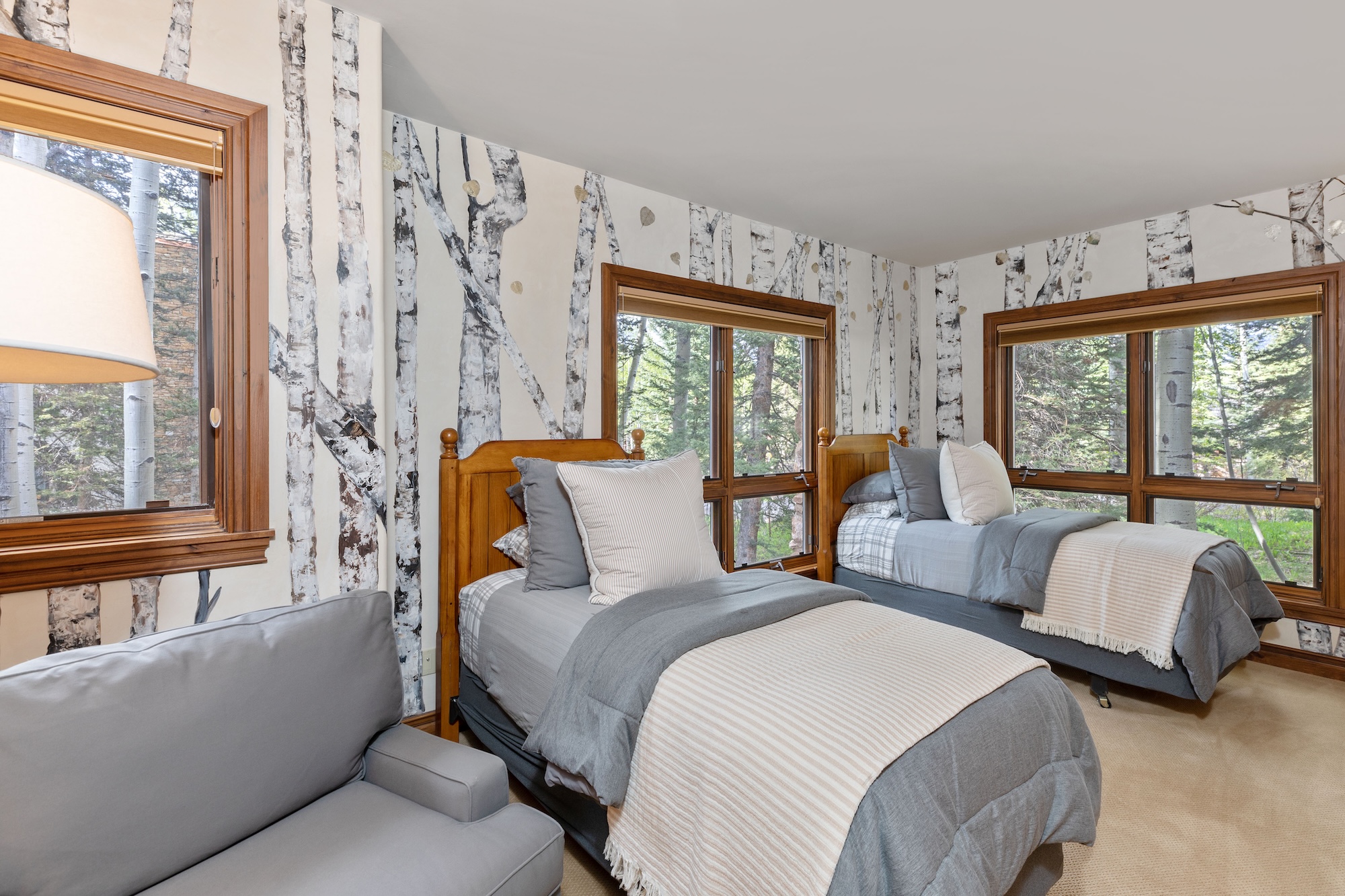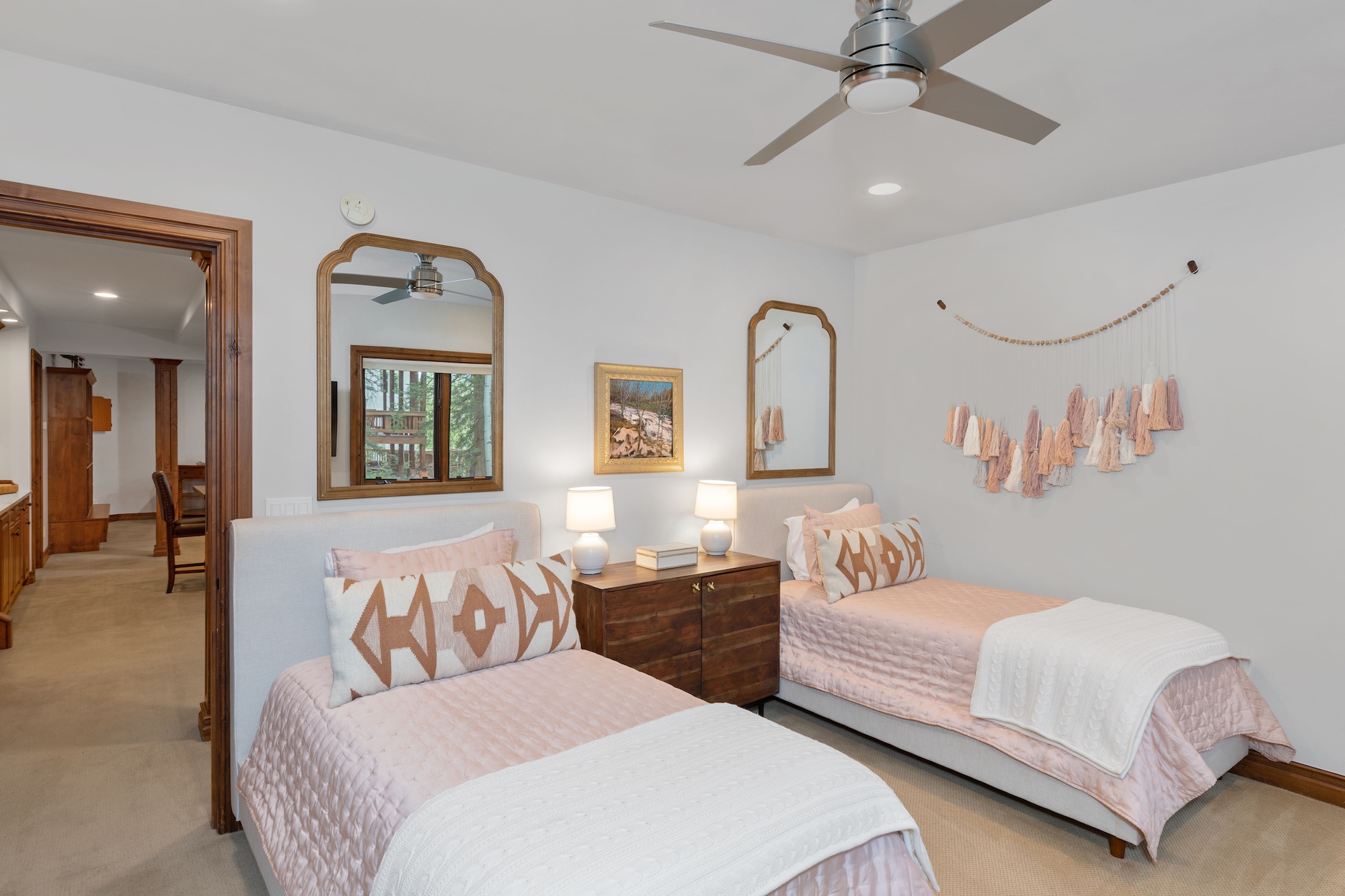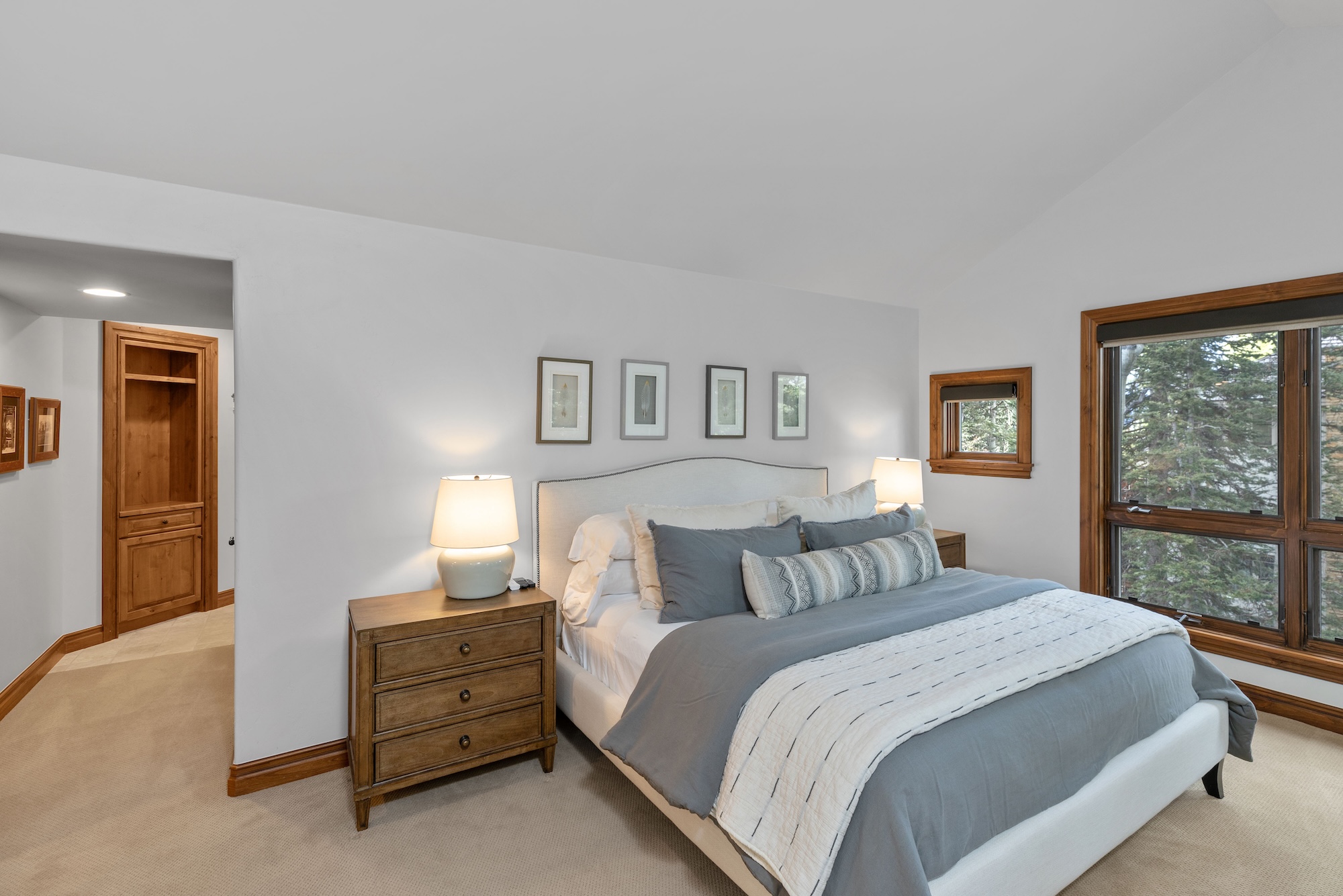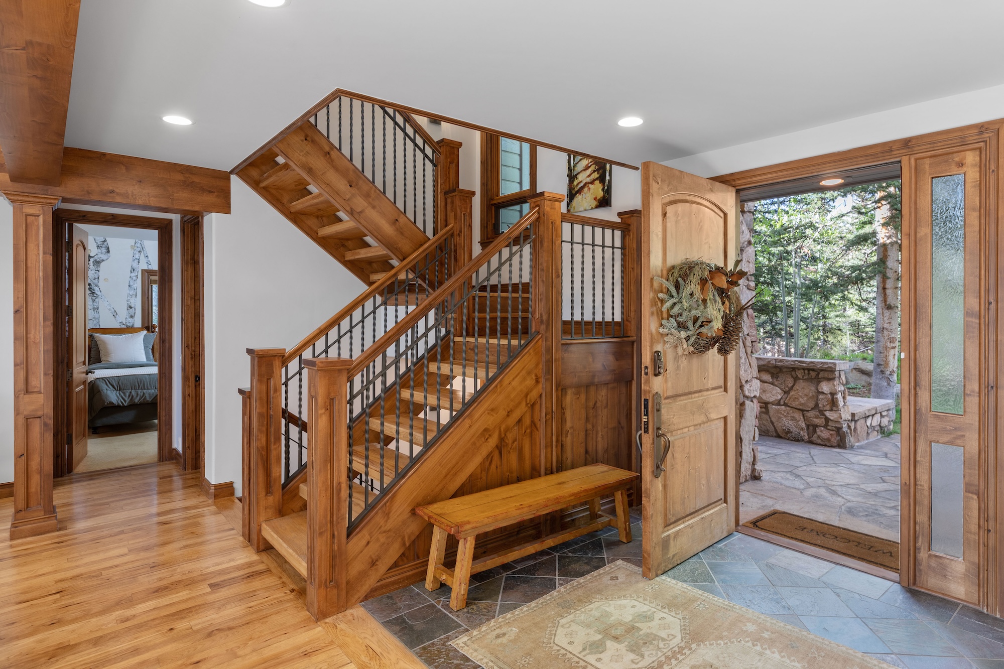 The lower level provides a more relaxed atmosphere, complete with a cozy fireplace, pool table, wet bar, and flat-screen TV—ideal for après-ski evenings with family and friends. Outside, a three-tier deck seamlessly extends the living space into the alpine air, featuring dining and shaded lounge areas, a fire pit, and a hot tub for year-round enjoyment.