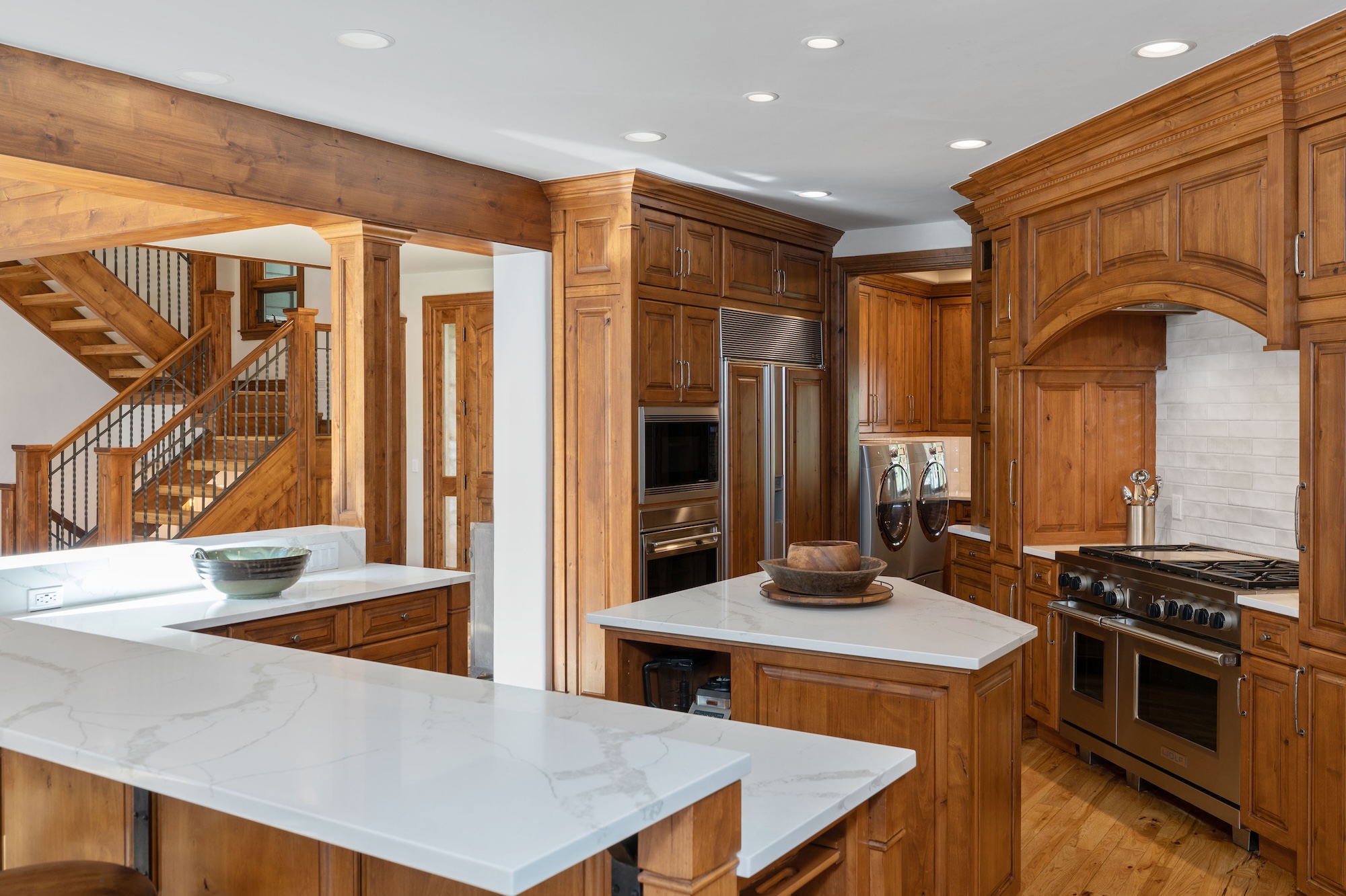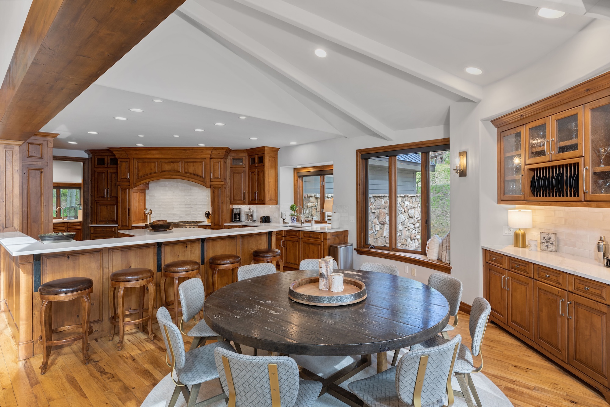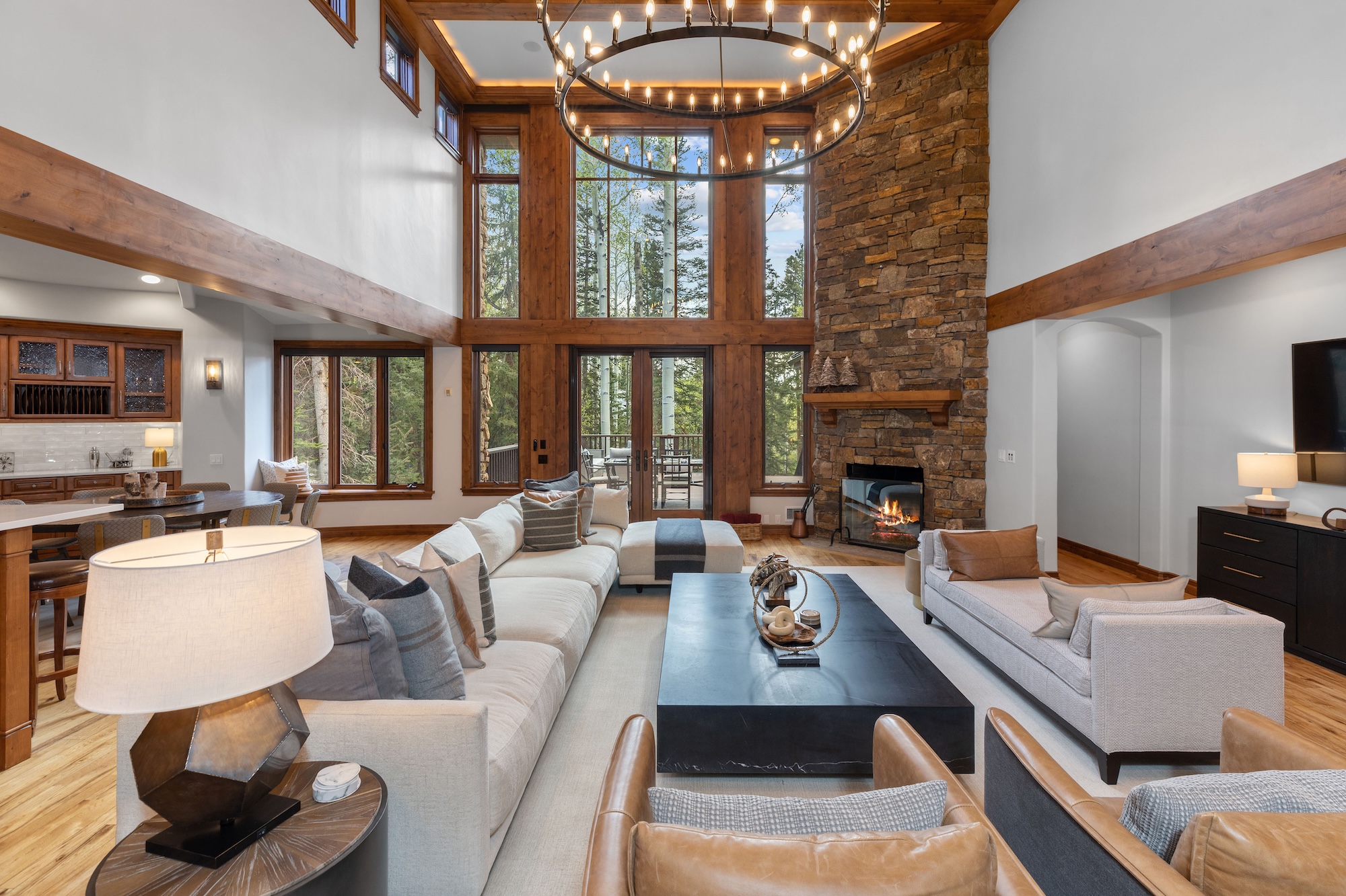 With six bedrooms, this luxurious retreat is ideal for families and groups looking for a sophisticated alpine getaway in Mountain Village. Aspen Grove captures the timeless charm of a mountain lodge with the comfort and sophistication of modern design. This chalet-style retreat features six ensuite bedrooms, soaring vaulted ceilings, and an expansive, light-filled living area where floor-to-ceiling windows frame tranquil forest views. At the heart of the home, an open-concept kitchen and dramatic great room—anchored by a stone fireplace and statement chandelier—offer the perfect setting for gathering and entertaining.