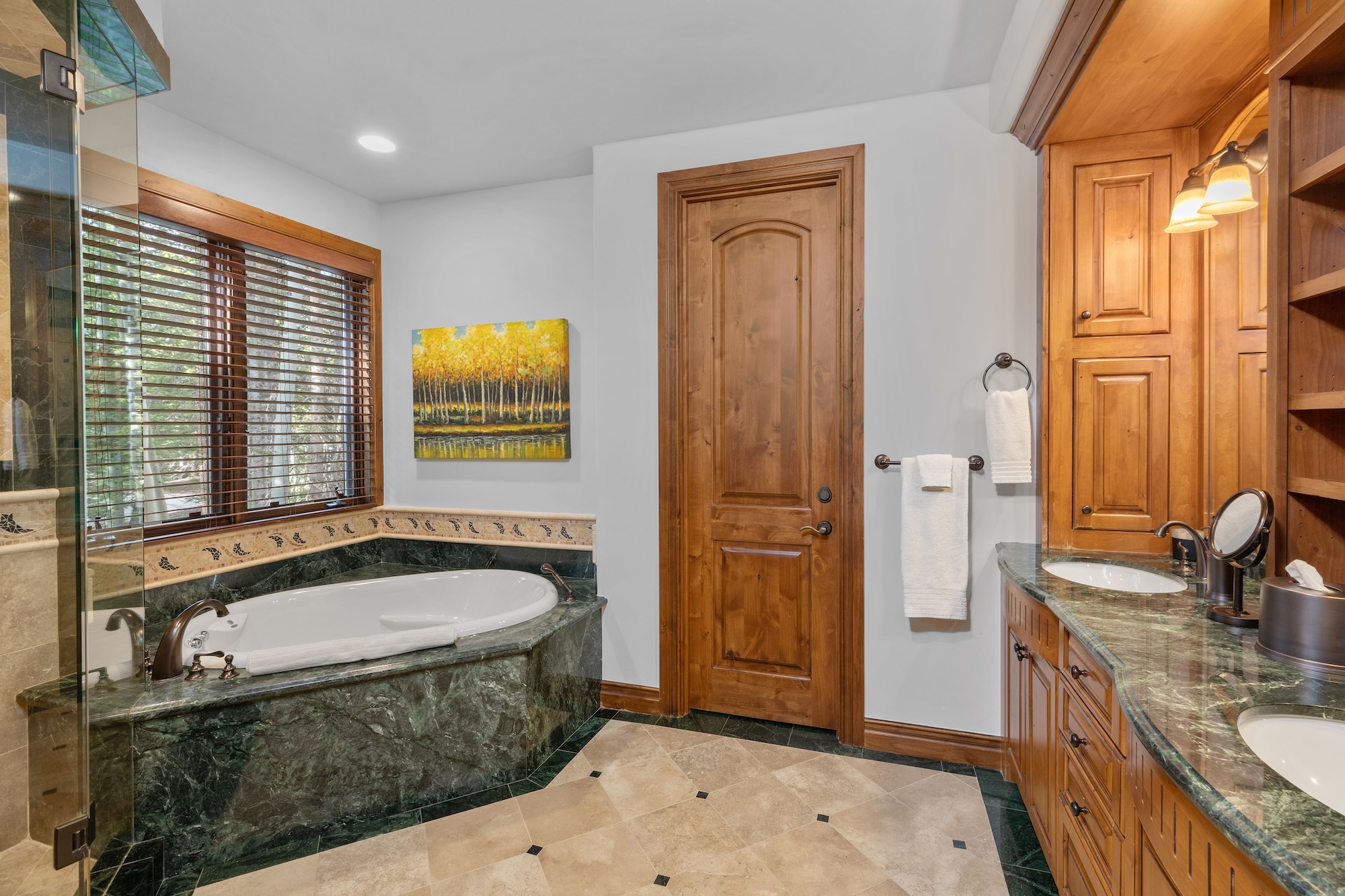 • Ensuite bath with shower, double vanity, and deep jetted tub, walk-in closet, forest view.
