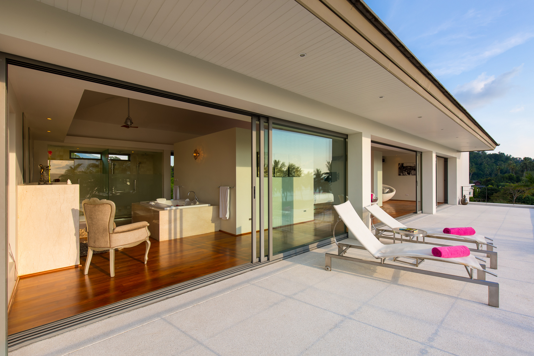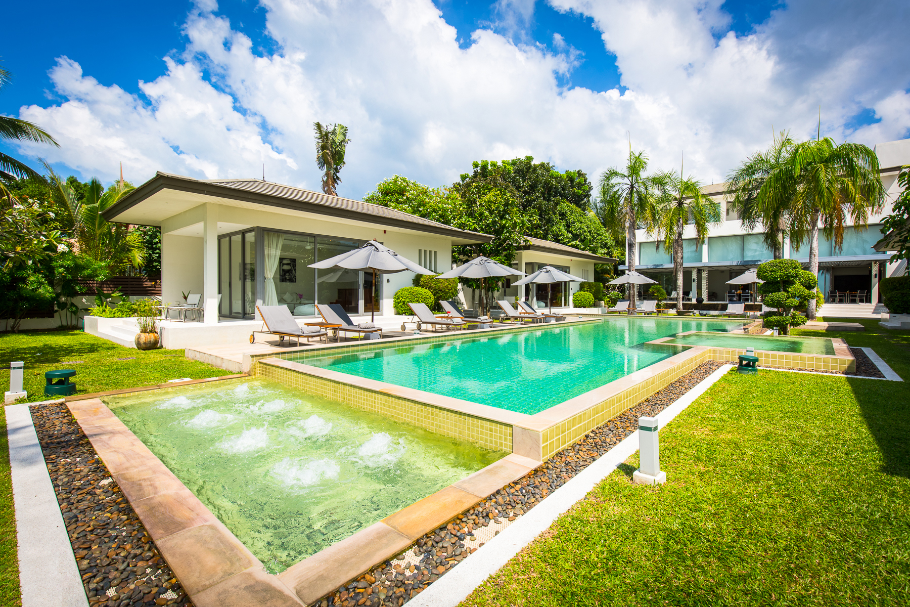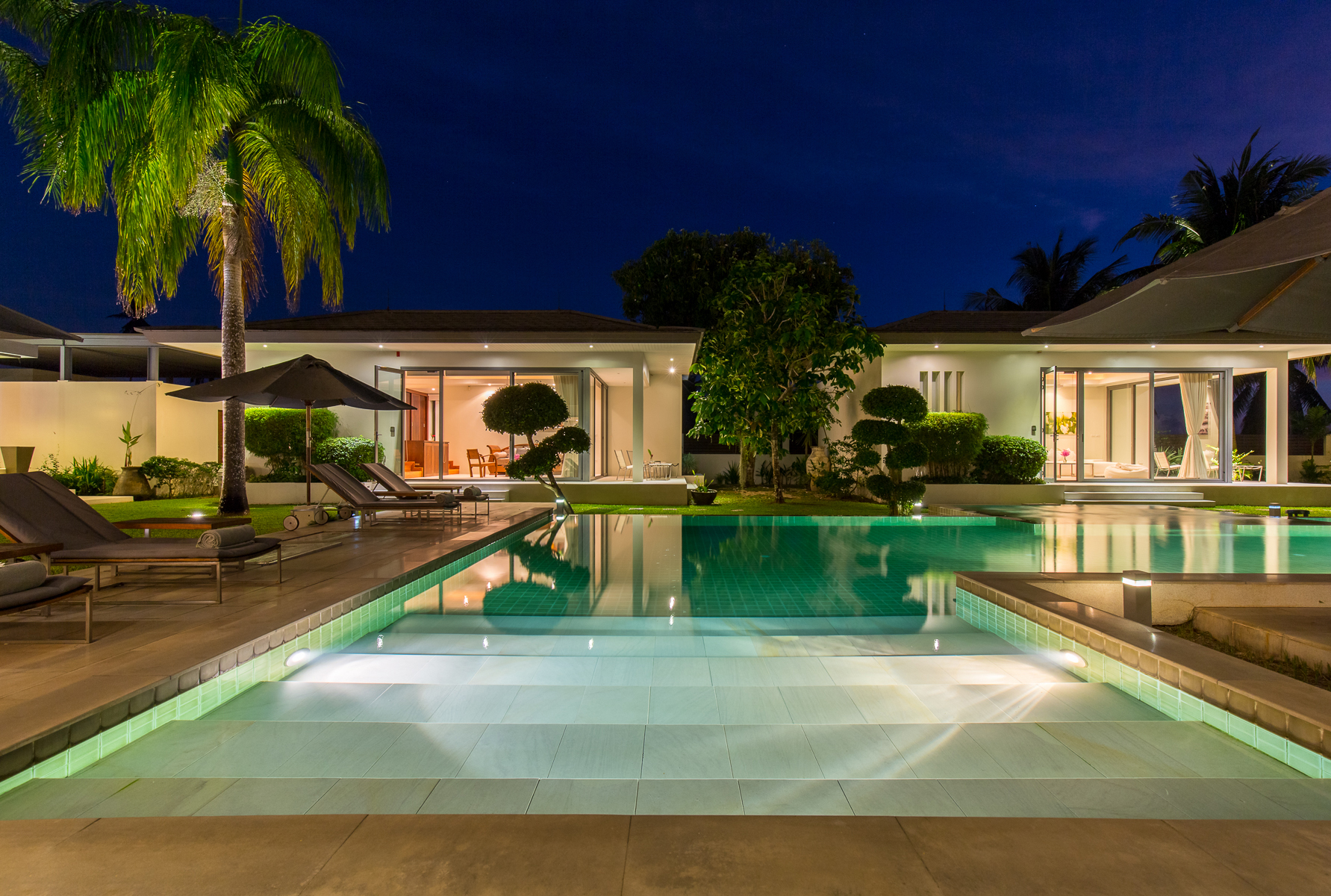 The interiors are equally impressive: picture white walls, sleek black floors, a floating staircase, floor-to-ceiling glass windows, cutting-edge furnishings, and metallic accents. The master suite spans an entire floor and includes a bathtub with sea views. Each bedroom comes with a lavish lounge area, private bathroom, and terrace. Two of the guest suites have adjoining rooms ideal for kids, with two bunk beds (accommodating 4 children). The central pool, surrounded by stylish design, features a Jacuzzi and a separate children’s pool. With 8 en-suite bathrooms, private terraces, a gym, movie room, outdoor dining sala, and a 17.2m infinity pool, Baan Asan is the epitome of luxury. Plus, a private chef is available to prepare Western and Asian dishes, so you can fully relax without leaving the property.