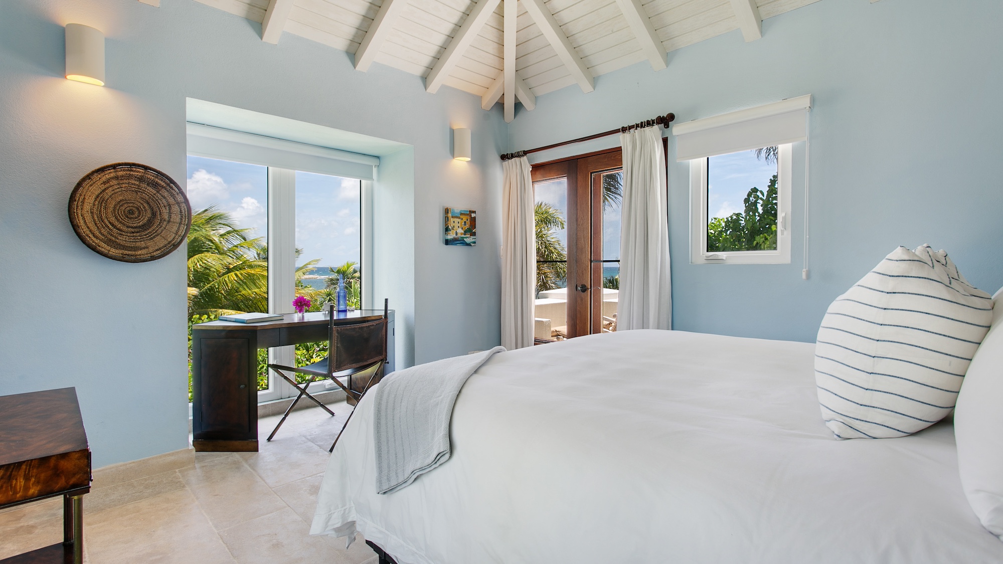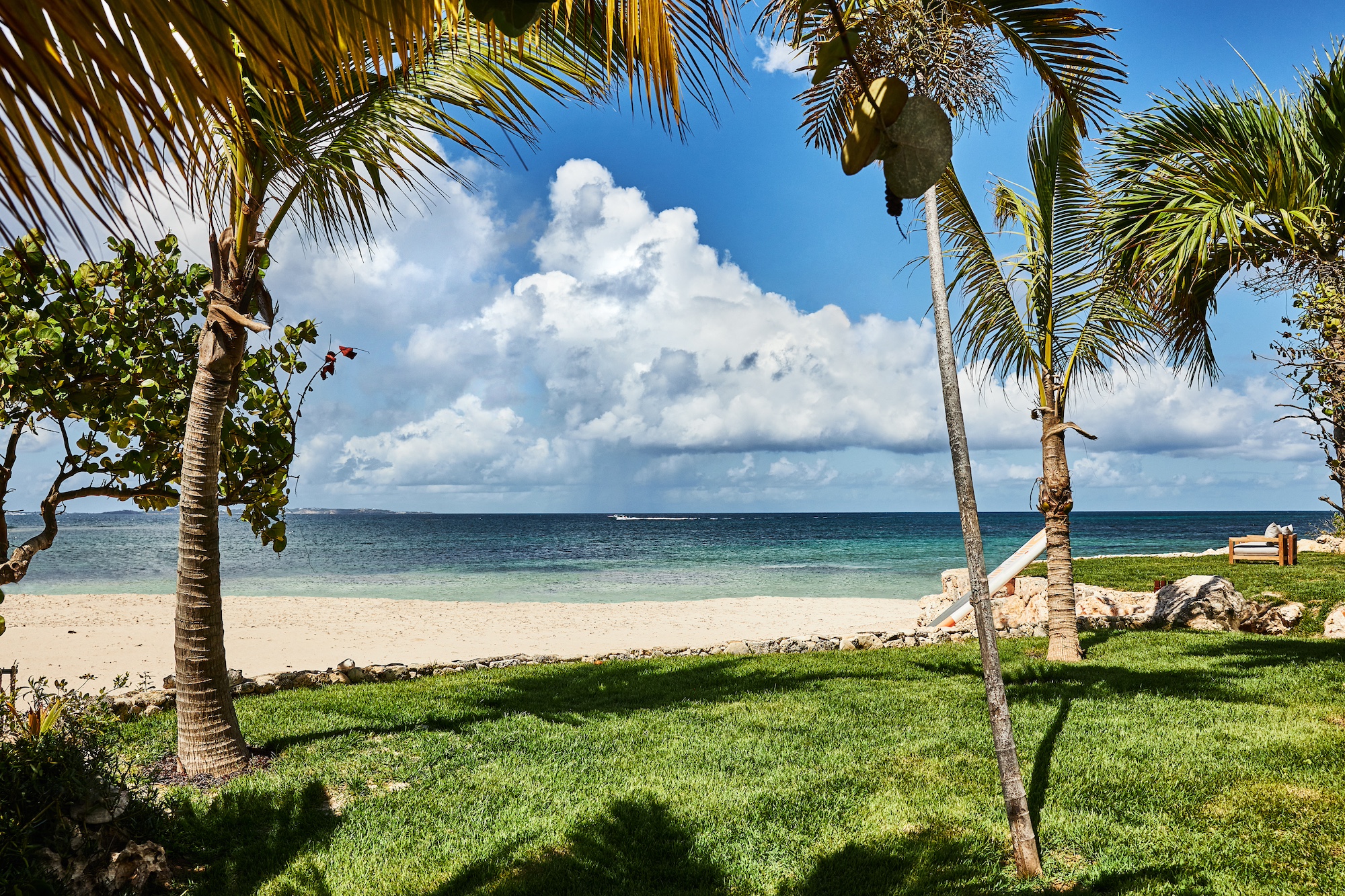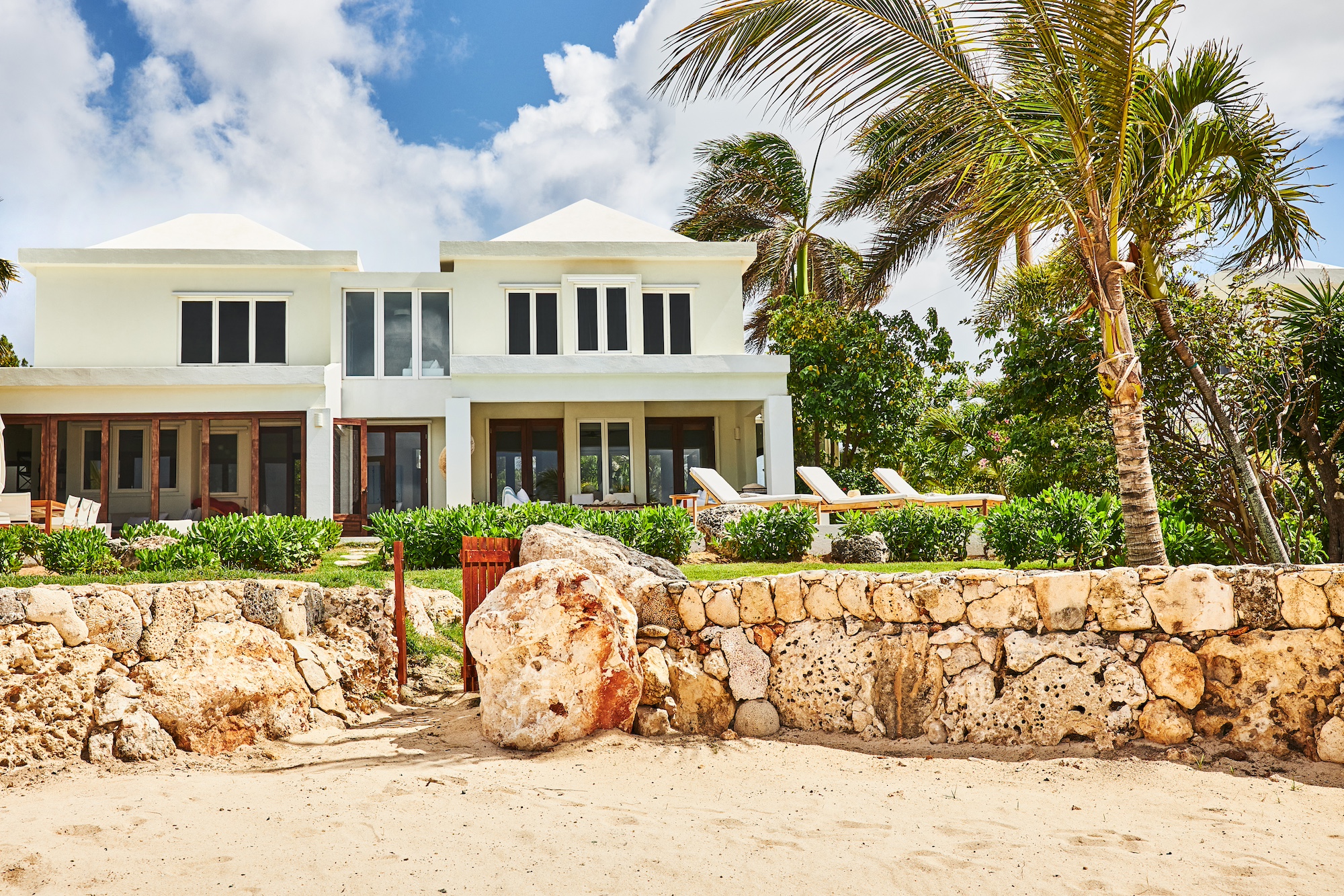 This charming five-bedroom Anguilla retreat is set within a lush palm-filled beachfront compound on Blowing Point, overlooking the glittering Caribbean waters. Each of the five refined suites features its own private bathroom, with two located in the sleek main residence and three positioned in a fully independent guest house. Accommodating up to 10 guests, the home enjoys sweeping sightlines toward St. Martin from most interior spaces.