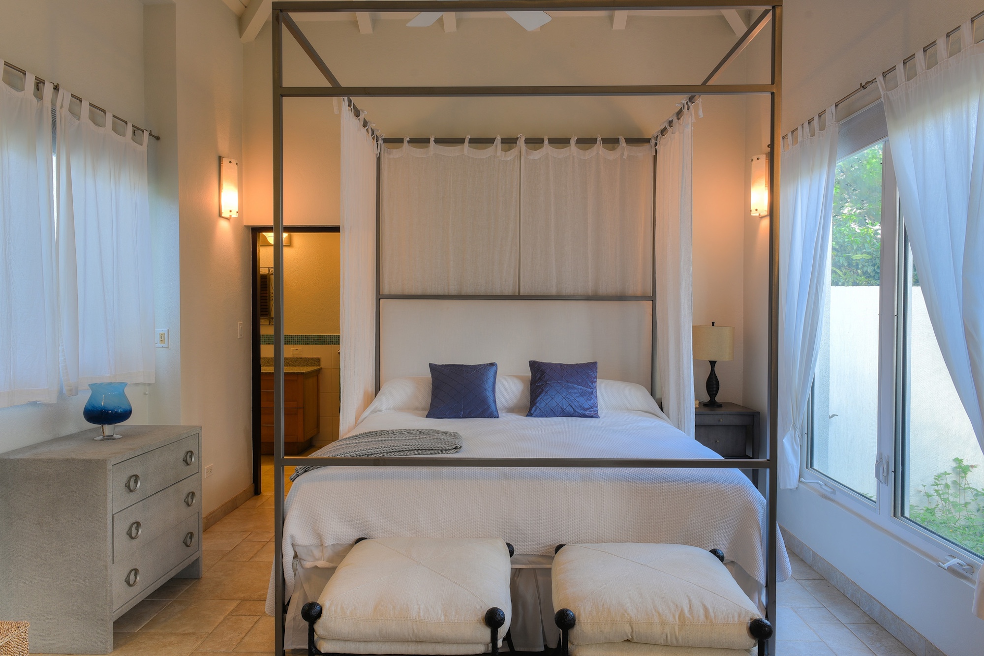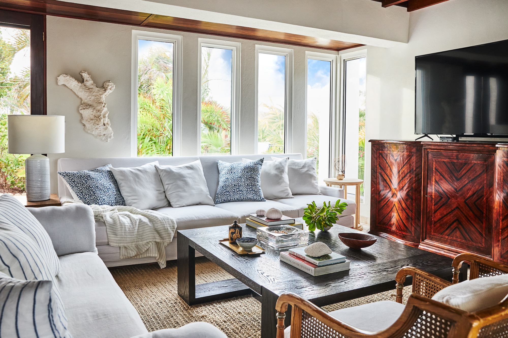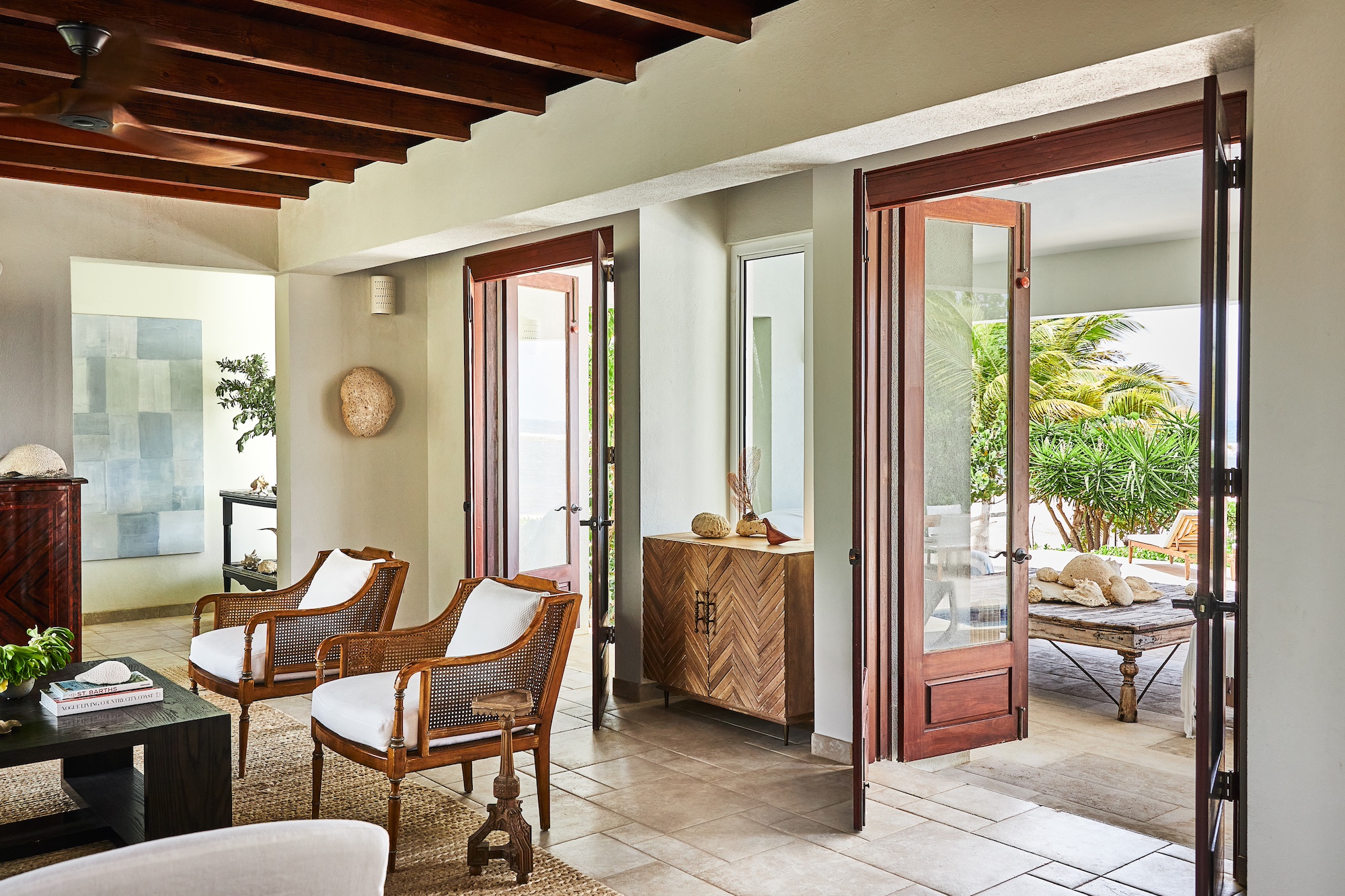 This charming five-bedroom Anguilla retreat is set within a lush palm-filled beachfront compound on Blowing Point, overlooking the glittering Caribbean waters. Each of the five refined suites features its own private bathroom, with two located in the sleek main residence and three positioned in a fully independent guest house. Accommodating up to 10 guests, the home enjoys sweeping sightlines toward St. Martin from most interior spaces.