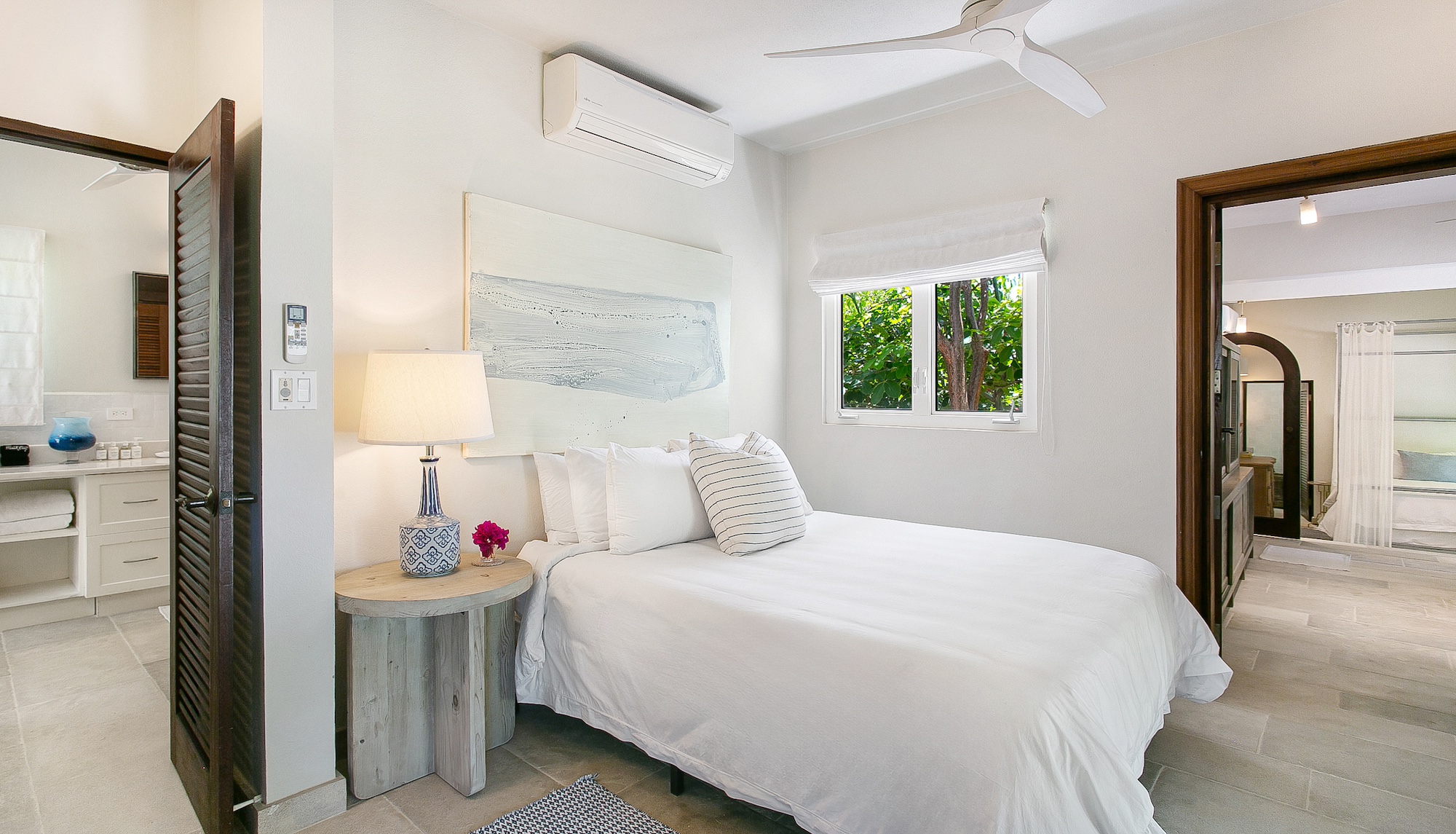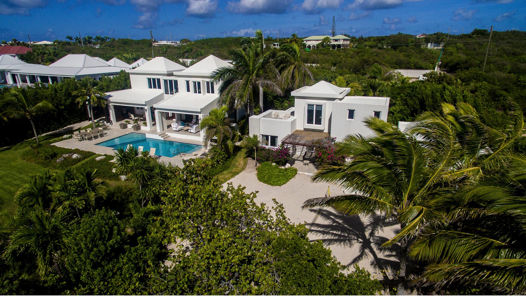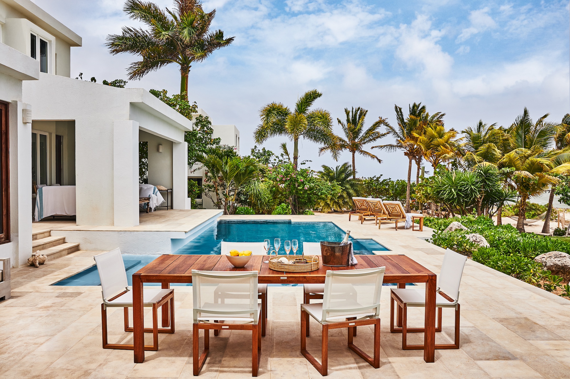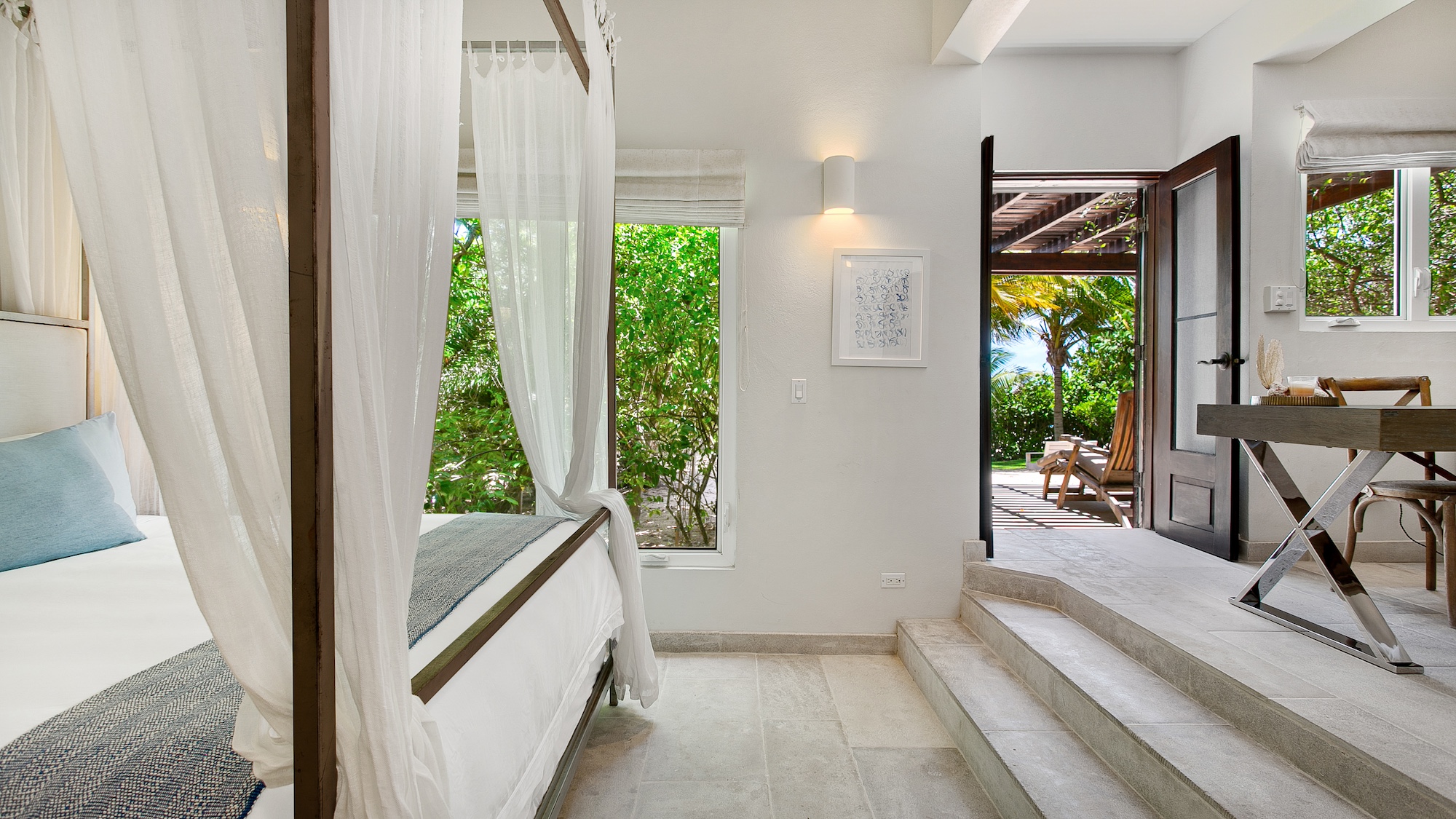Outdoors, guests have access to 166 feet of sandy shoreline, a secluded swimming pool, and a spacious manicured lawn with multiple lounging areas. A private stretch of beach is easily reached from the guest house, while expansive floor-to-ceiling glass creates a seamless flow between interior living and the tropical surroundings. Dine inside with panoramic island views or enjoy open-air meals poolside in the refreshing sea breeze.