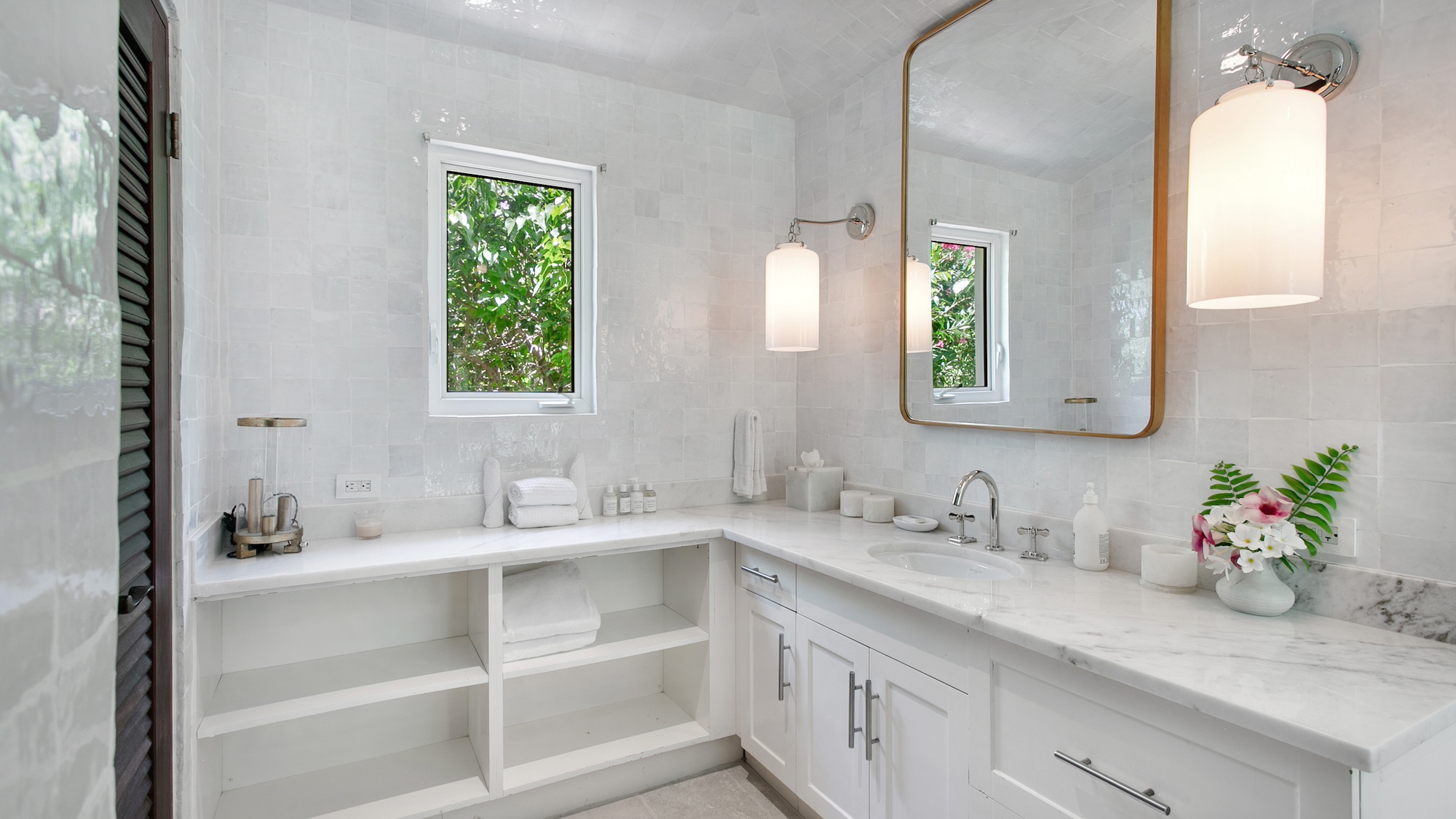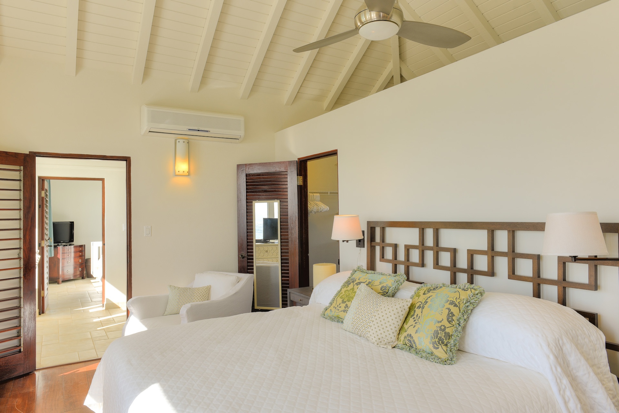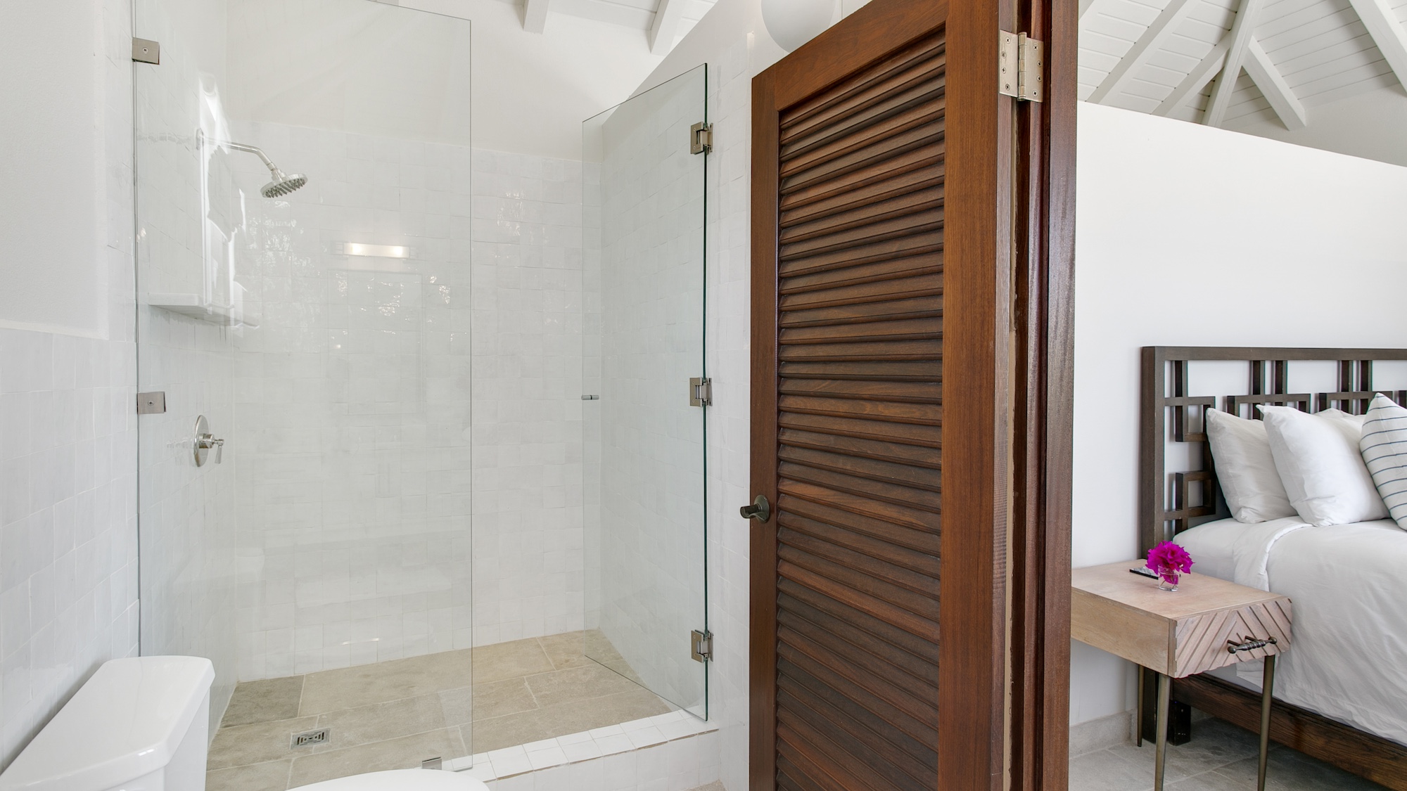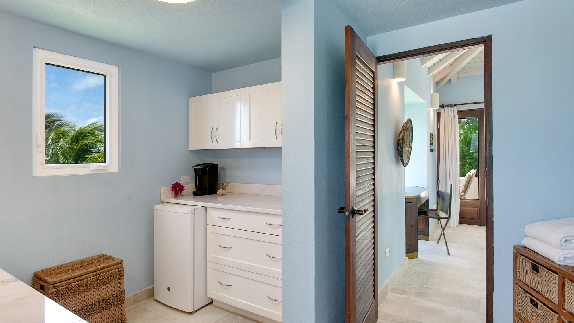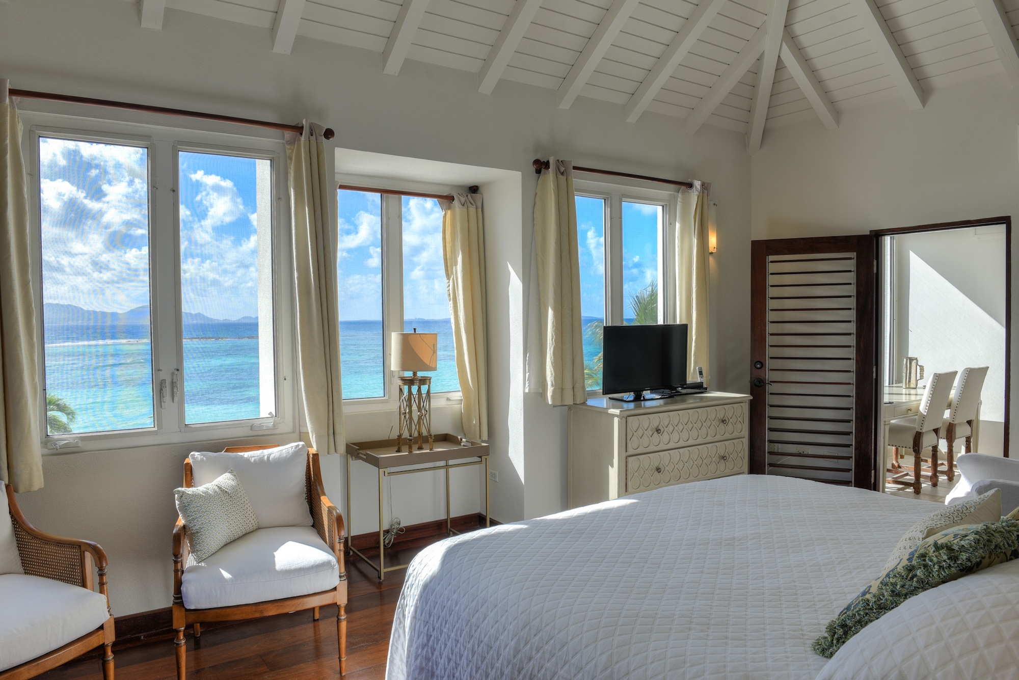 Outdoors, guests have access to 166 feet of sandy shoreline, a secluded swimming pool, and a spacious manicured lawn with multiple lounging areas. A private stretch of beach is easily reached from the guest house, while expansive floor-to-ceiling glass creates a seamless flow between interior living and the tropical surroundings. Dine inside with panoramic island views or enjoy open-air meals poolside in the refreshing sea breeze.