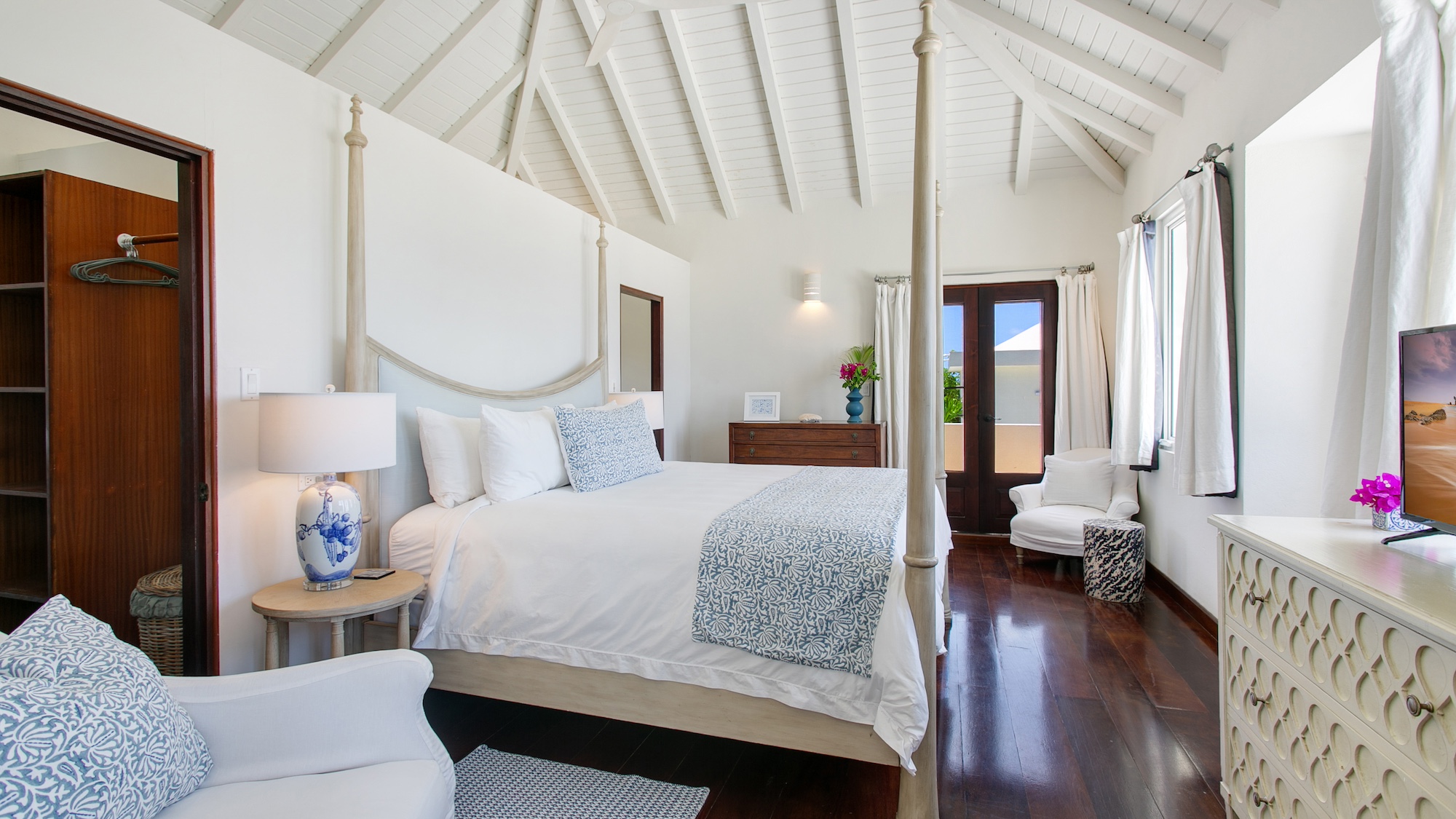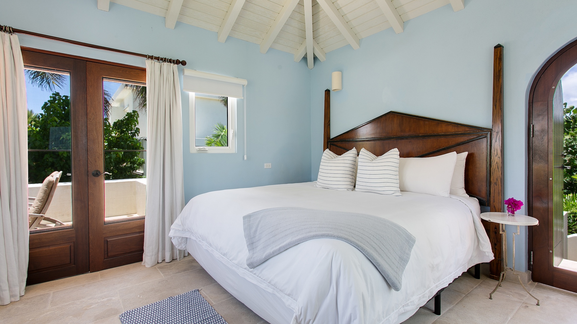 The property features five beautifully appointed bedroom suites with en suite bathrooms — two located in the contemporary main residence and three private suites in the neighboring guest house. Ideal for groups of up to 10 guests, Beach Escape showcases sweeping views of St. Martin from most rooms, 166 feet of pristine beachfront, a private swimming pool, and an expansive lawn with comfortable outdoor seating.