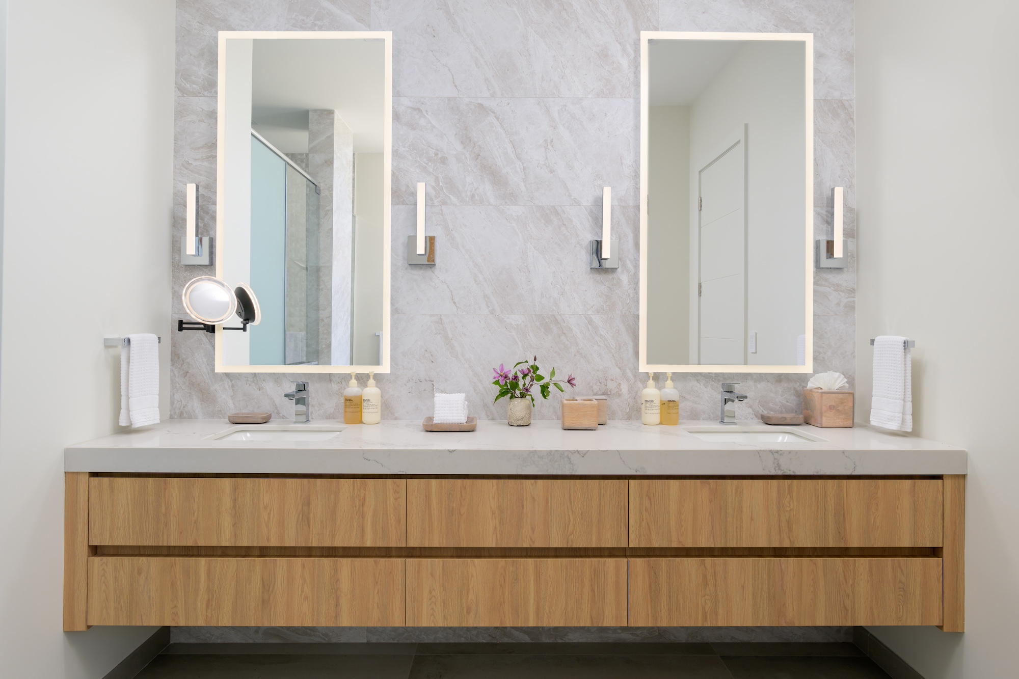 Crafted to the highest standards, each villa seamlessly combines contemporary open-plan living in soothing neutrals with plush furnishings and warm lighting, accentuated by gleaming natural stone, granite, and quartz. The high ceilings and expansive floor-to-ceiling windows allow natural light to flood each thoughtfully designed space, while at the rear, a wraparound glass balcony and poolside terrace offer unparalleled views of the pristine beach and turquoise sea.