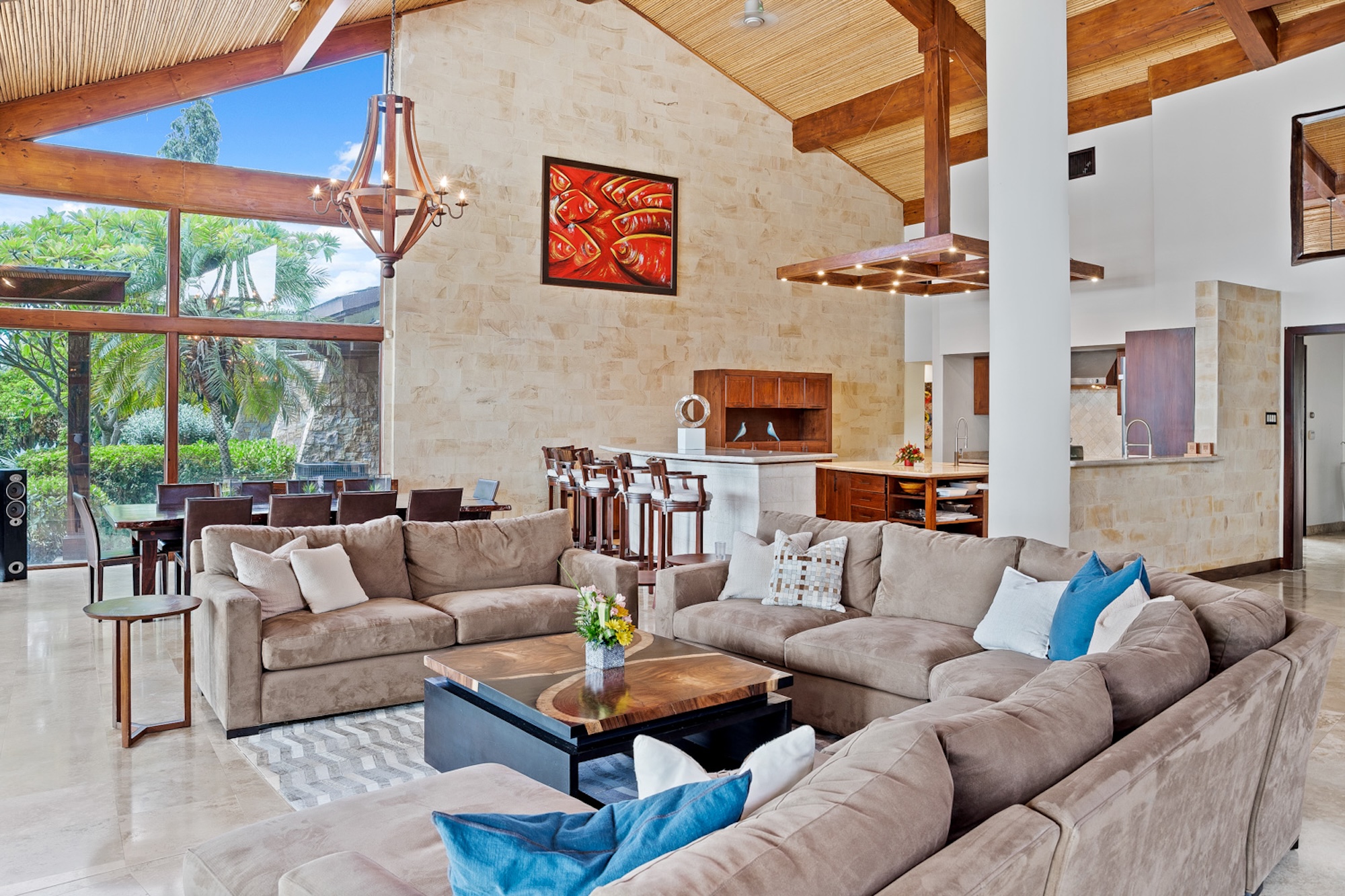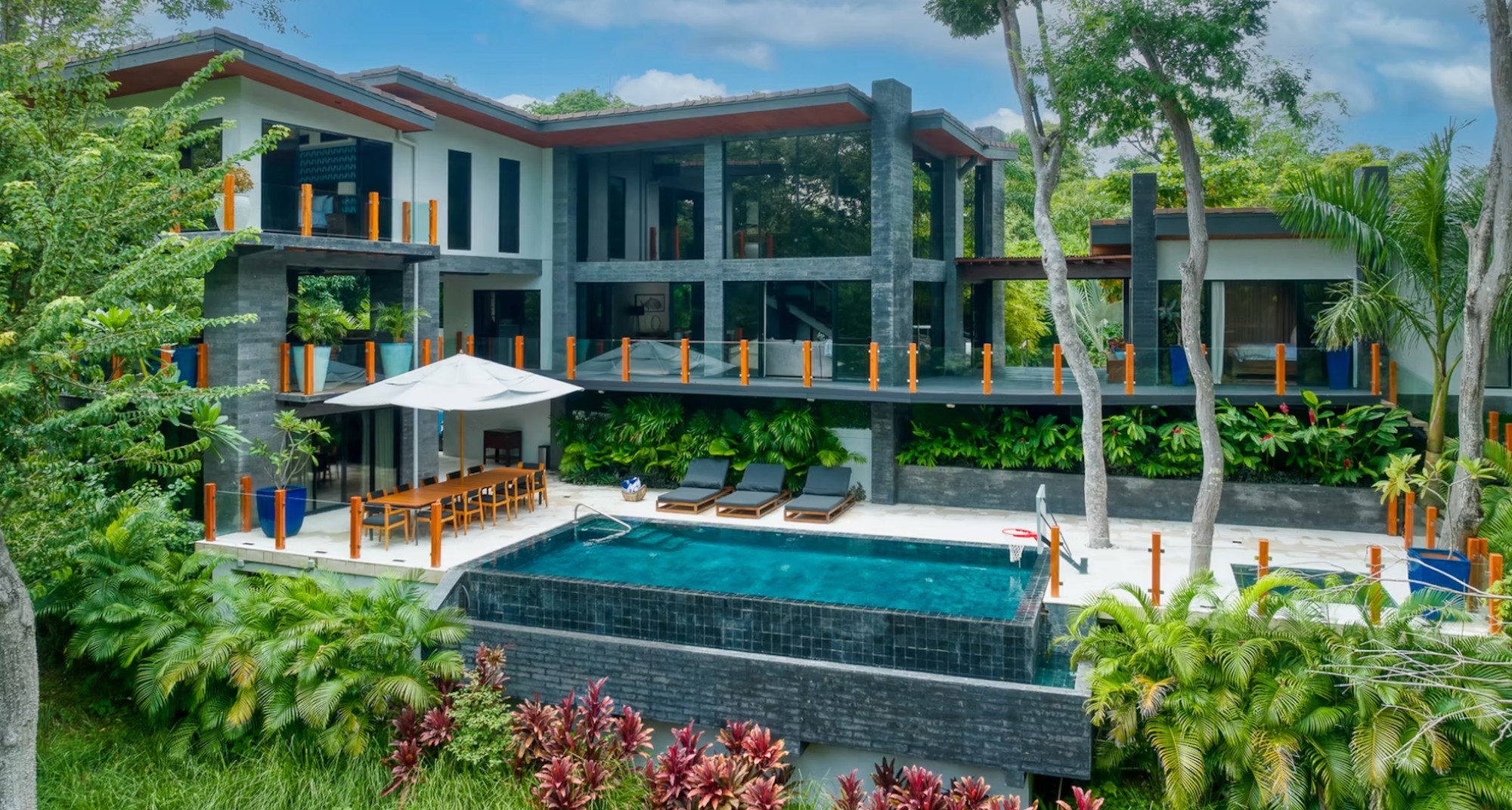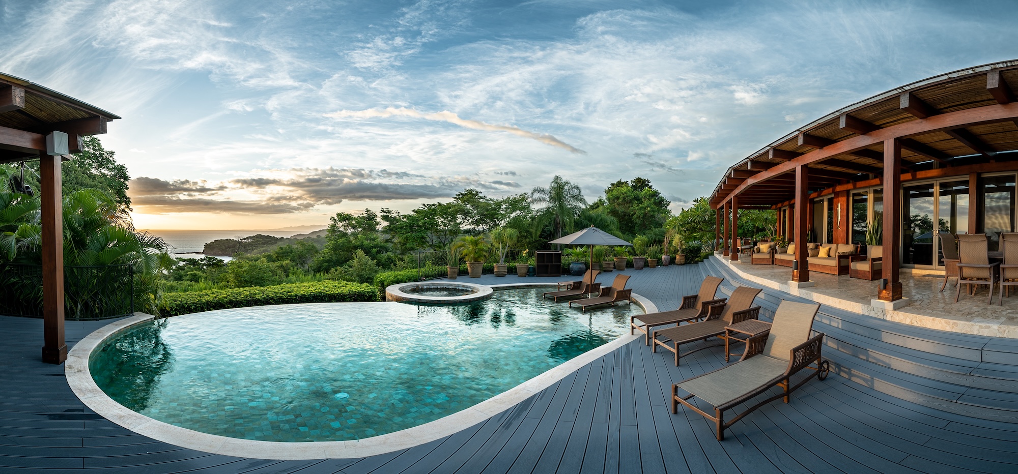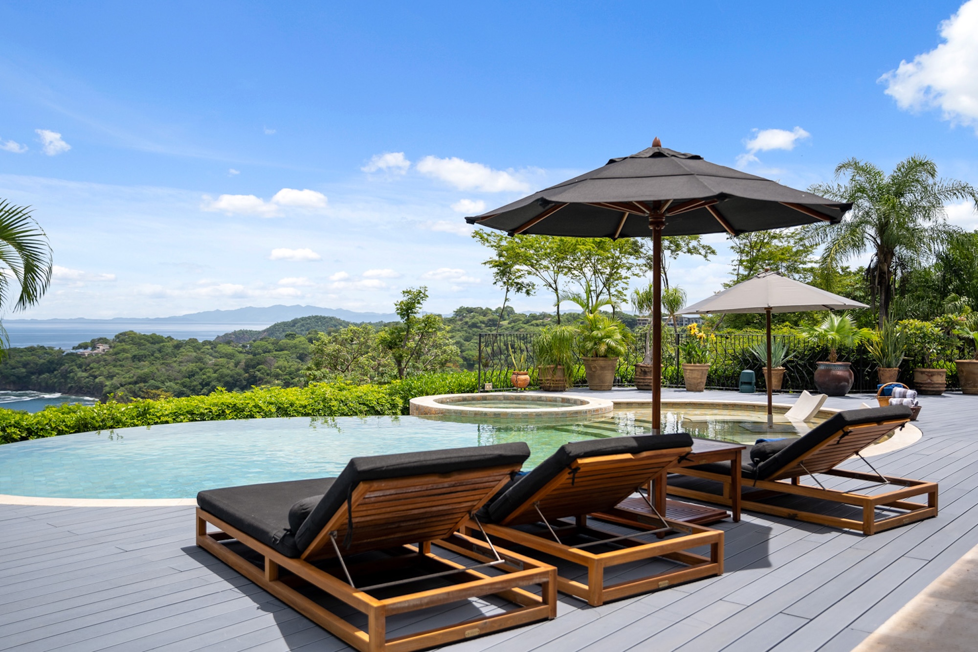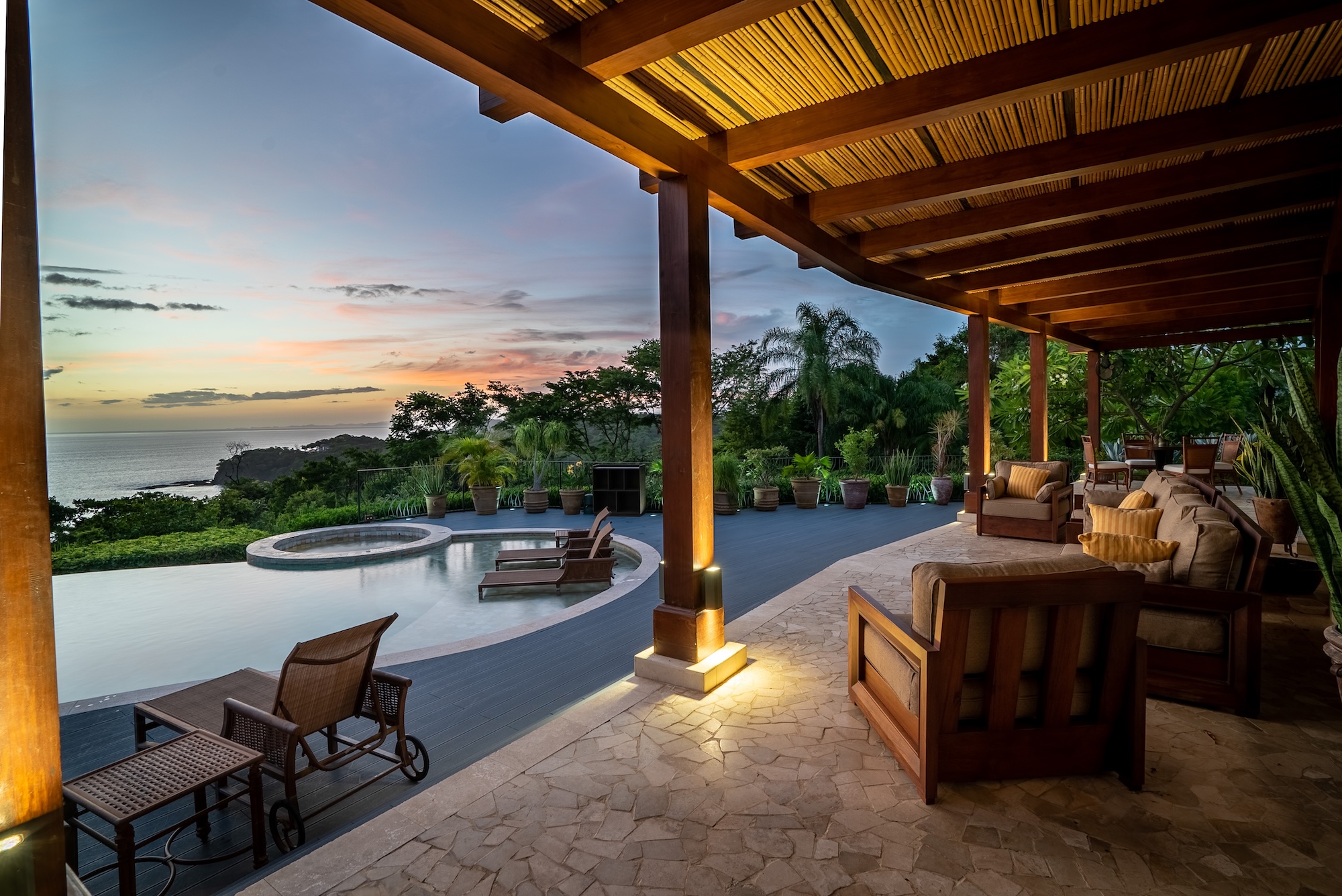 Casa Caiman is one of the few five-bedroom private luxury villas in Papagayo, thoughtfully designed to blend comfort and sophistication. Each suite features its own ocean-view terrace, en suite bathroom, and large flat-screen TV. The main living space is striking, with soaring 27-foot ceilings and elegant finishes of local sandstone and marble that flow seamlessly throughout. Outdoors, an expansive deck, infinity-edge pool, and adjoining hot tub create the perfect setting for unforgettable sunsets.