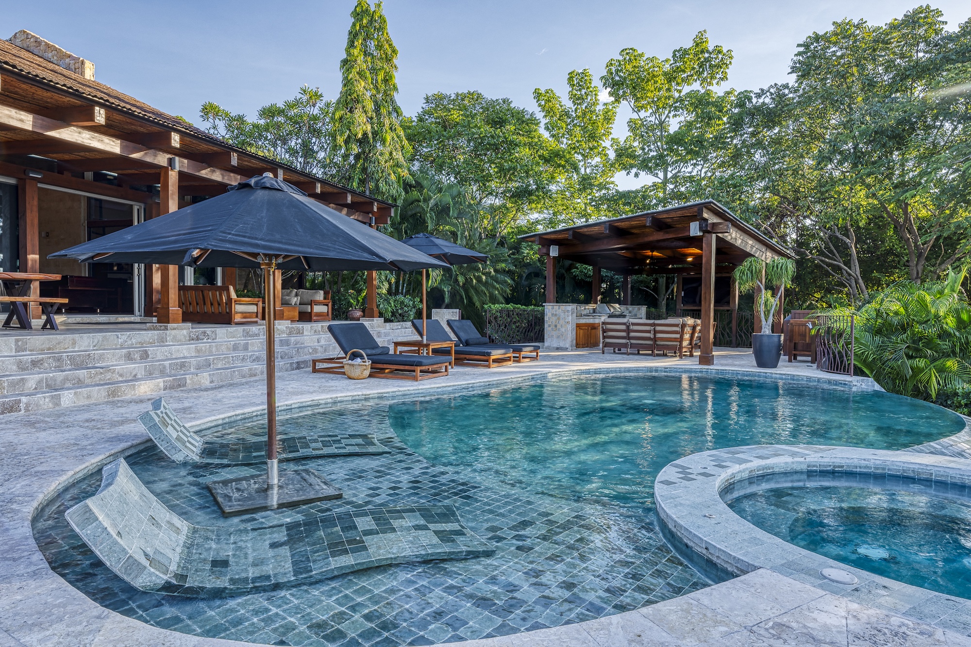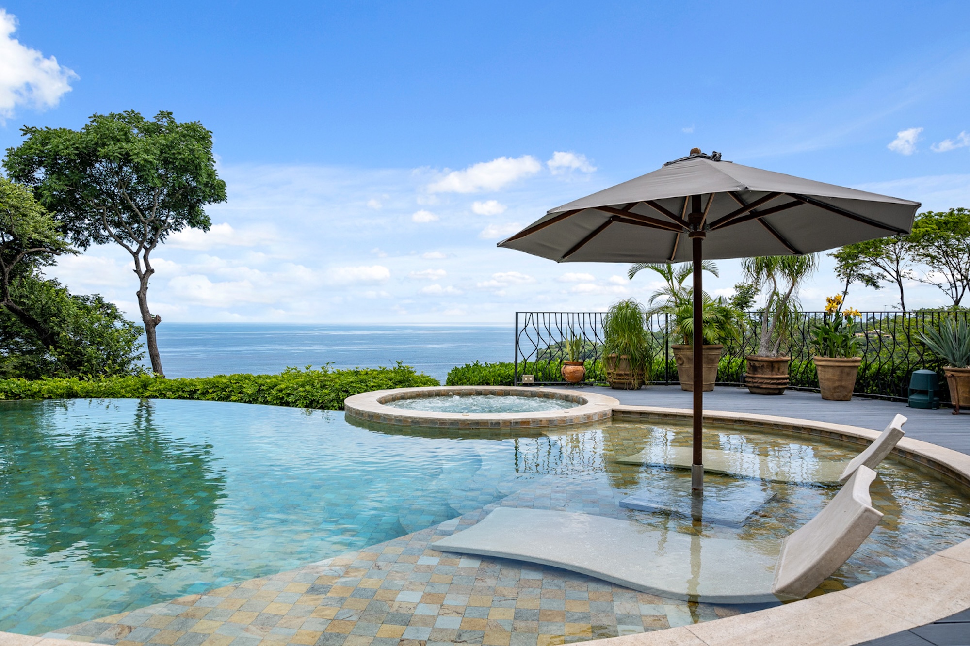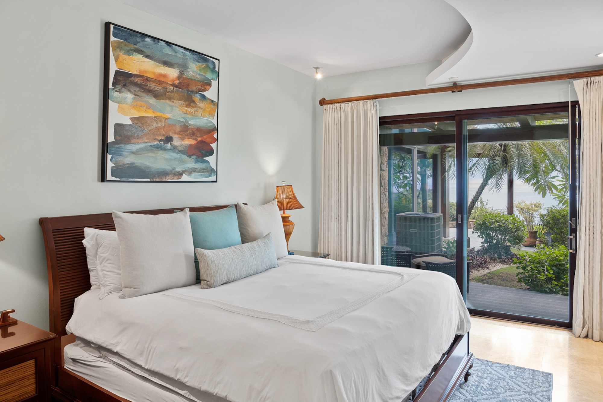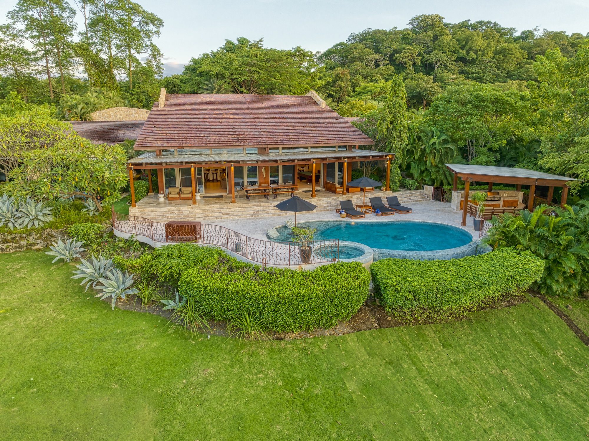 Casa Caiman is one of the few five-bedroom private luxury villas in Papagayo, thoughtfully designed to blend comfort and sophistication. Each suite features its own ocean-view terrace, en suite bathroom, and large flat-screen TV. The main living space is striking, with soaring 27-foot ceilings and elegant finishes of local sandstone and marble that flow seamlessly throughout. Outdoors, an expansive deck, infinity-edge pool, and adjoining hot tub create the perfect setting for unforgettable sunsets.