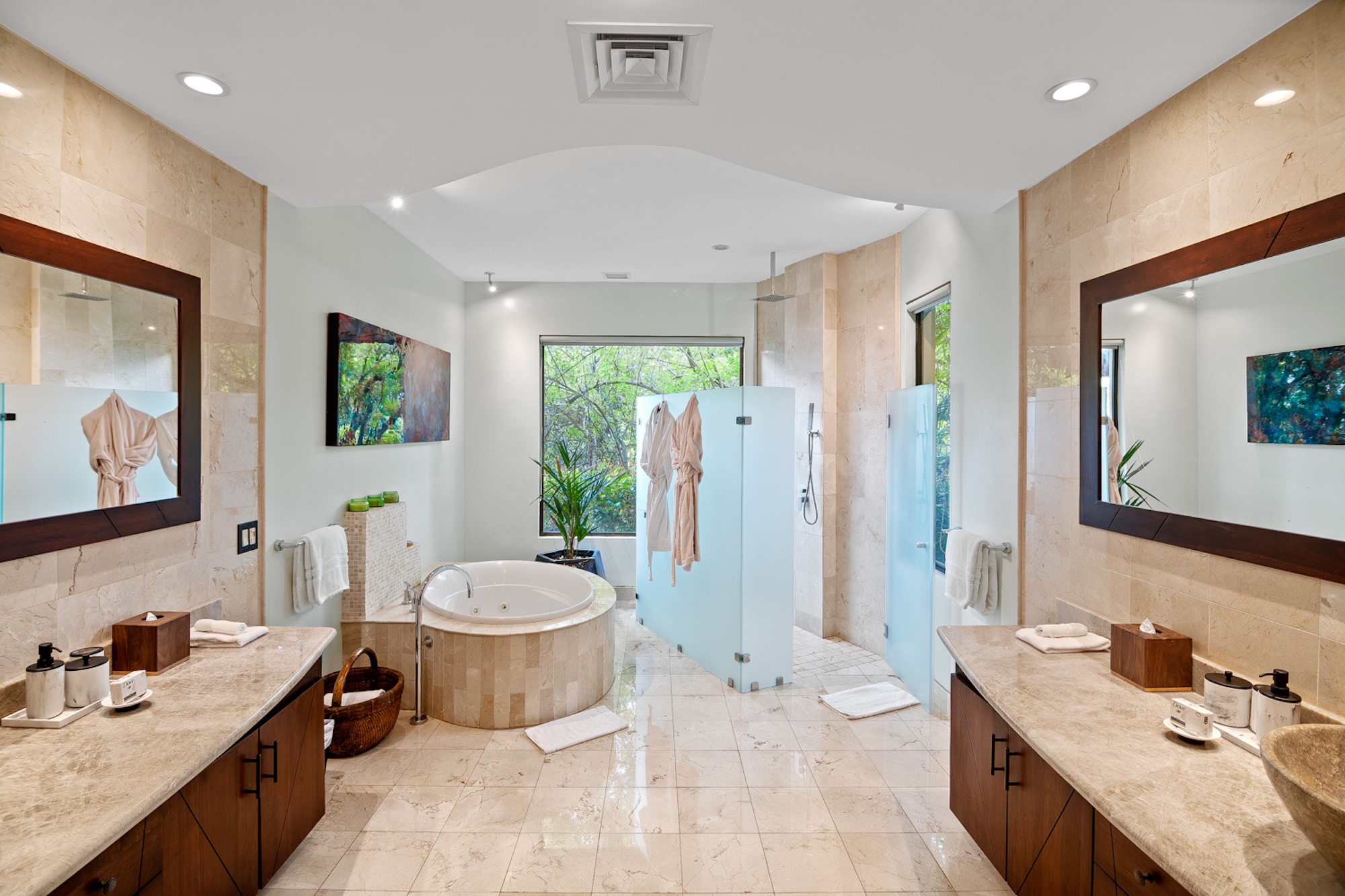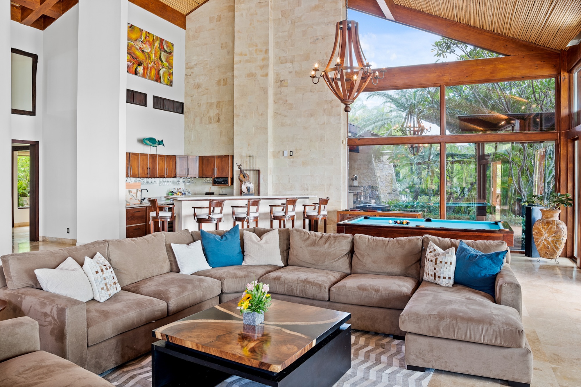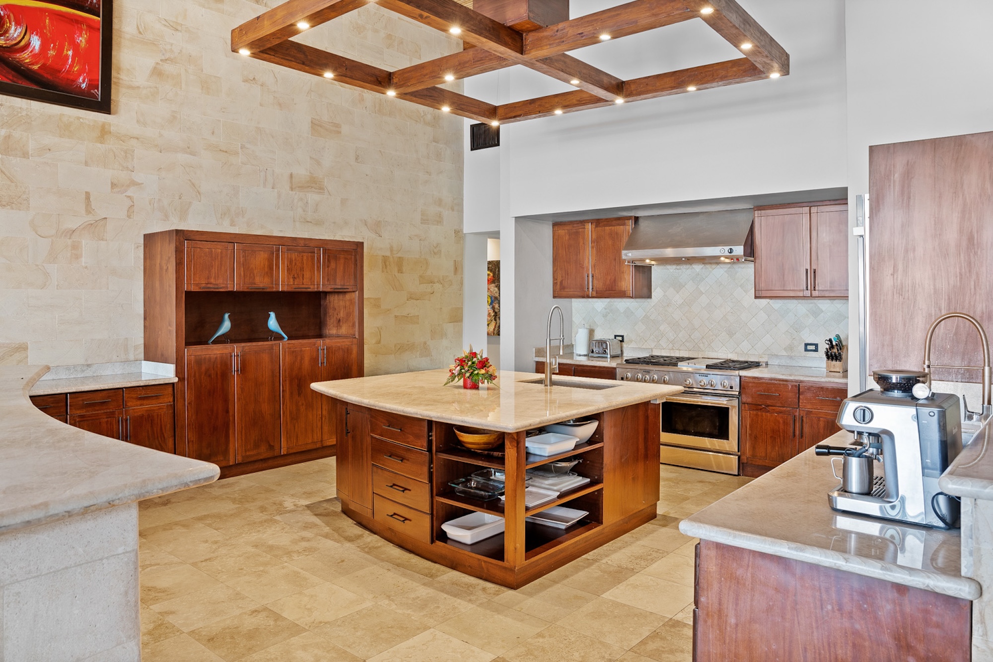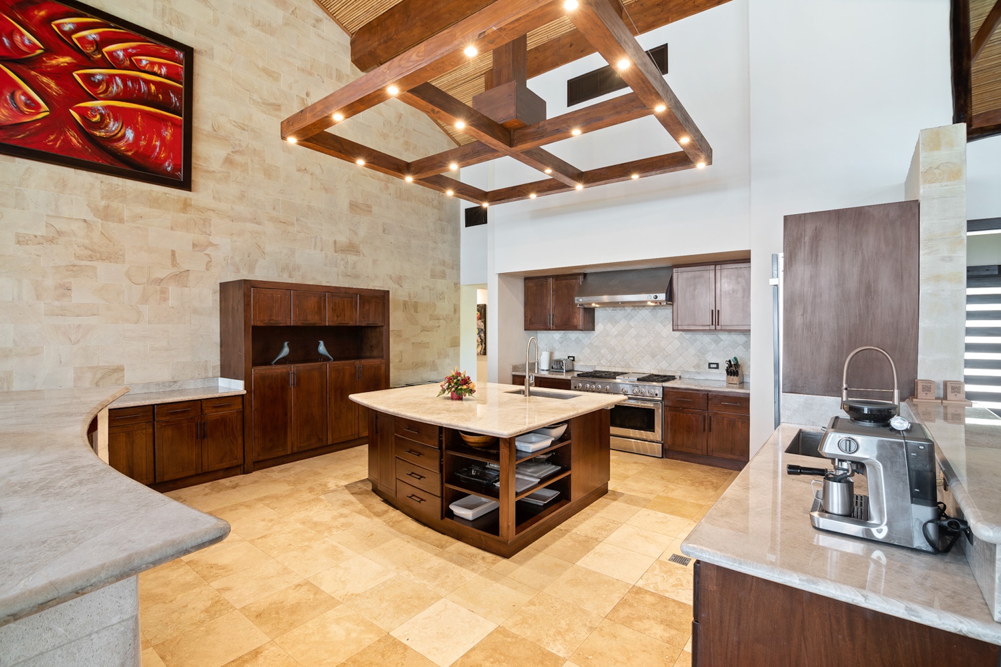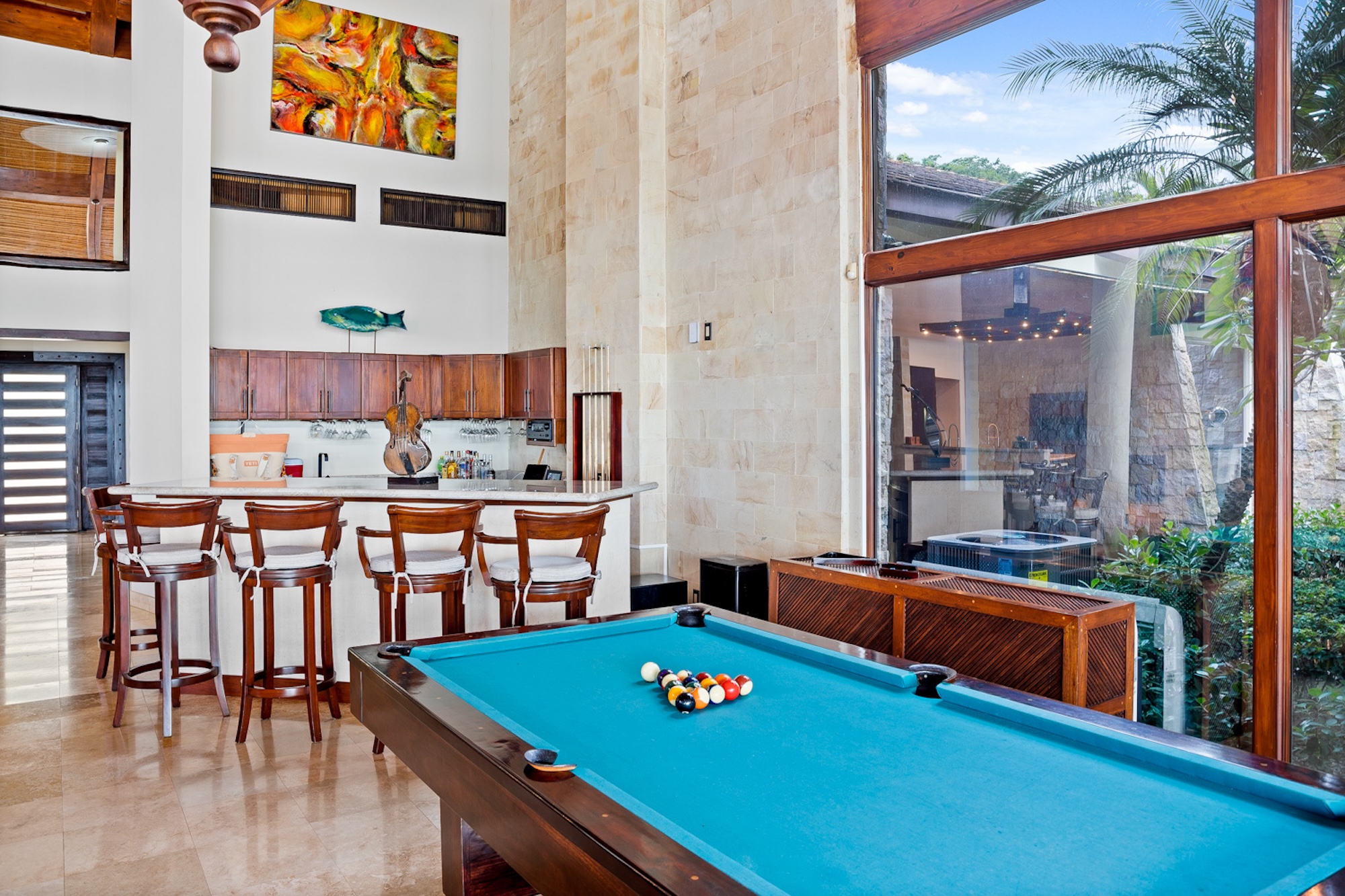 Casa Caiman is one of the few five-bedroom private luxury villas in Papagayo, thoughtfully designed to blend comfort and sophistication. Each suite features its own ocean-view terrace, en suite bathroom, and large flat-screen TV. The main living space is striking, with soaring 27-foot ceilings and elegant finishes of local sandstone and marble that flow seamlessly throughout. Outdoors, an expansive deck, infinity-edge pool, and adjoining hot tub create the perfect setting for unforgettable sunsets.