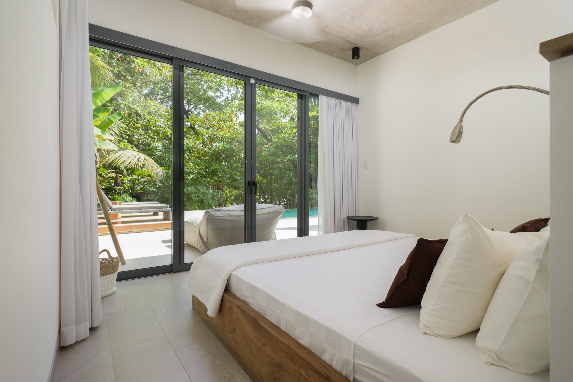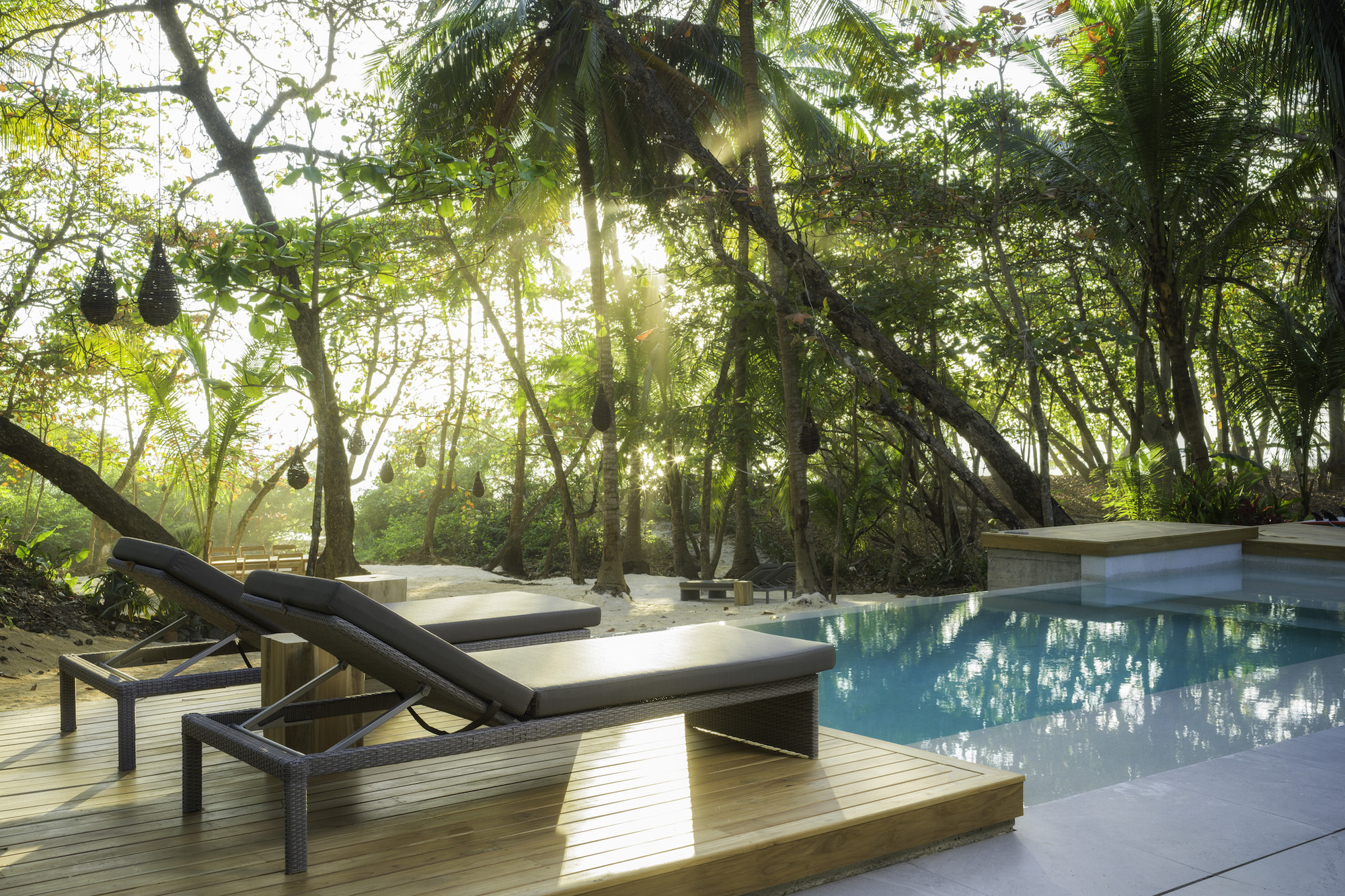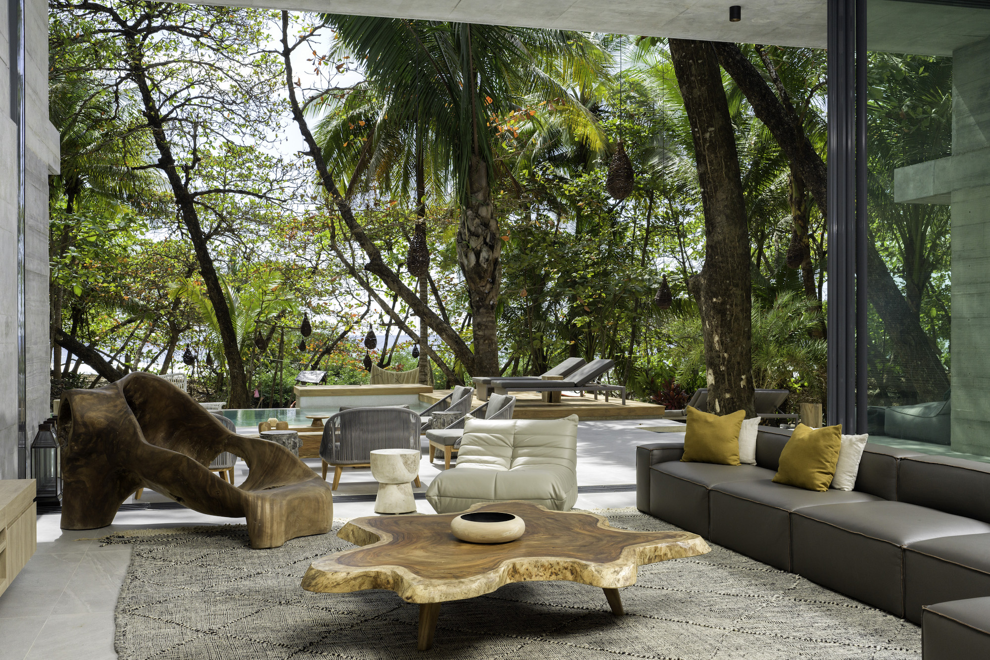 Between the villa and the beach lies a naturally shaded and spacious open area, adorned with lounge chairs and hammocks. Here, guests can unwind, savoring cocktails or dinner while reveling in the awe-inspiring tropical sunset vistas at the large dining table situated close to the beach. The beach itself, stretching as far as the eye can see, offers pristine sand and utmost privacy under the sheltering canopy of numerous trees, while avid surfers enjoy the fantastic and consistent waves.
