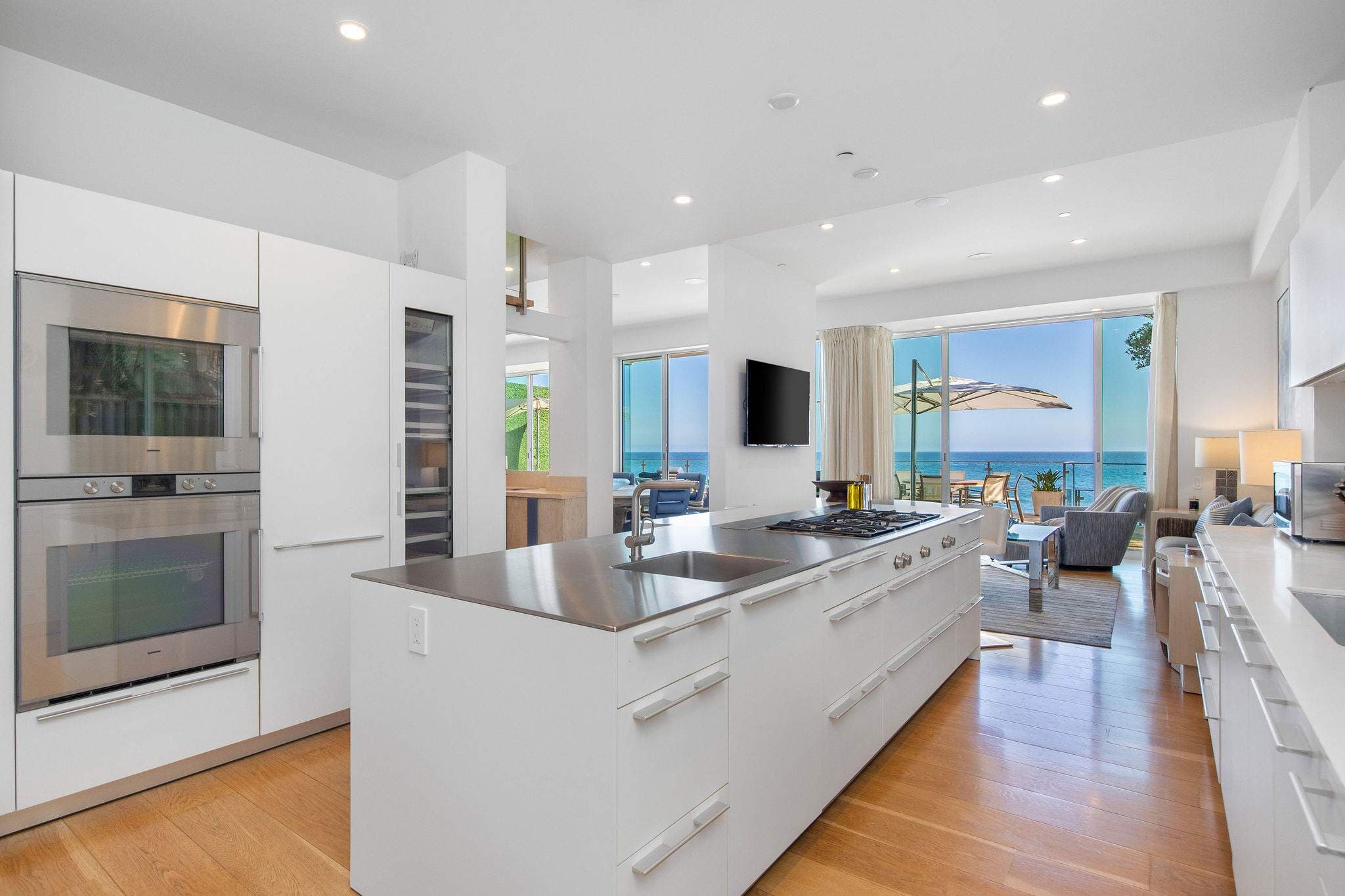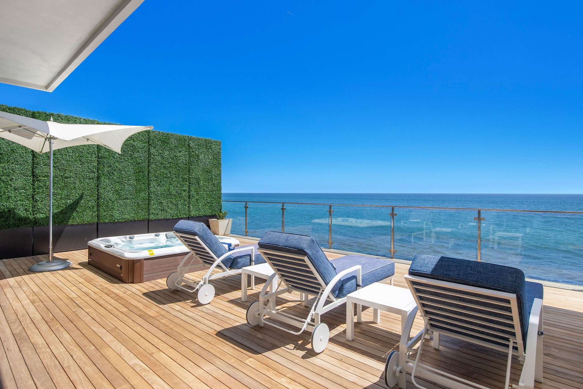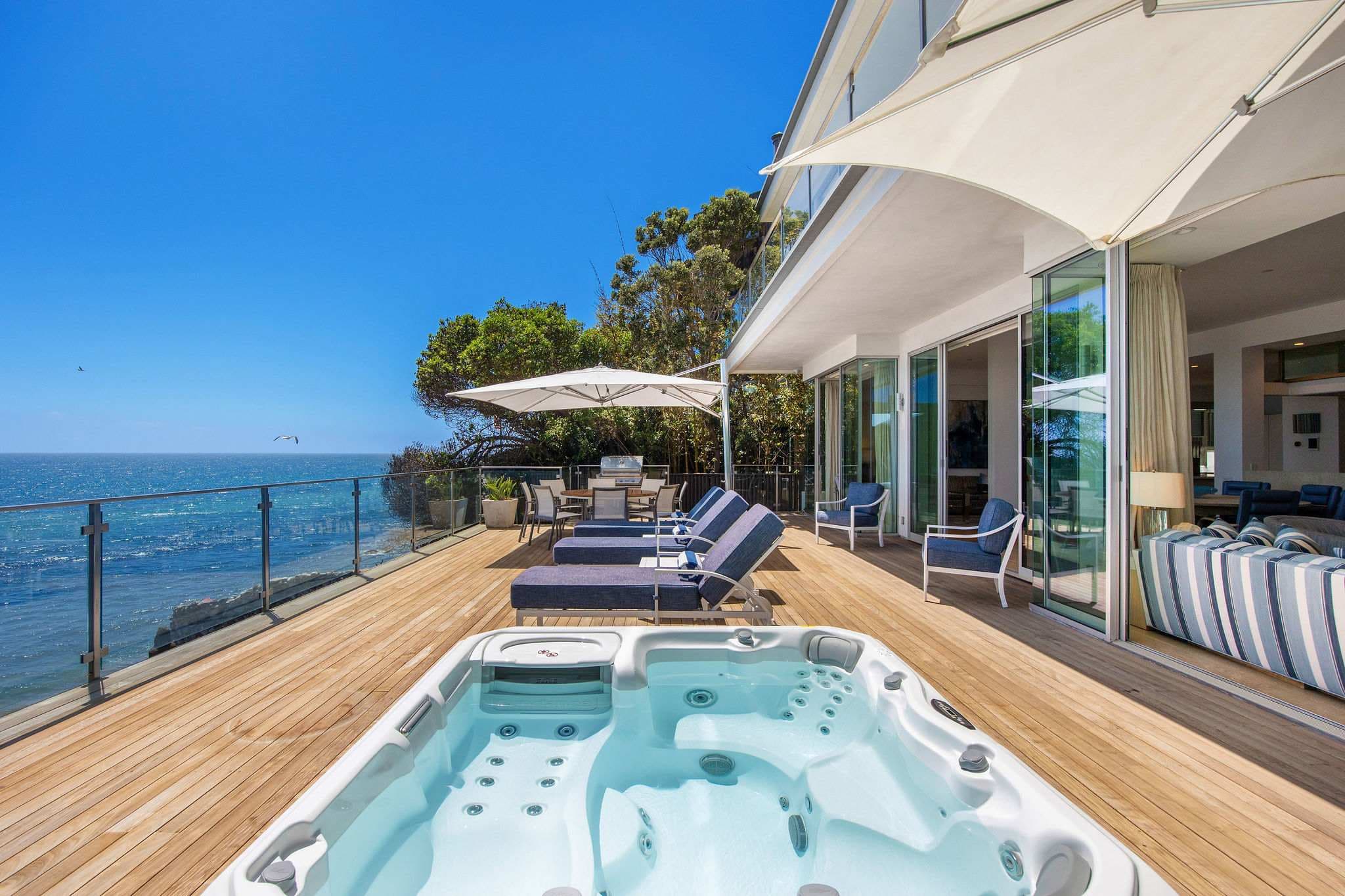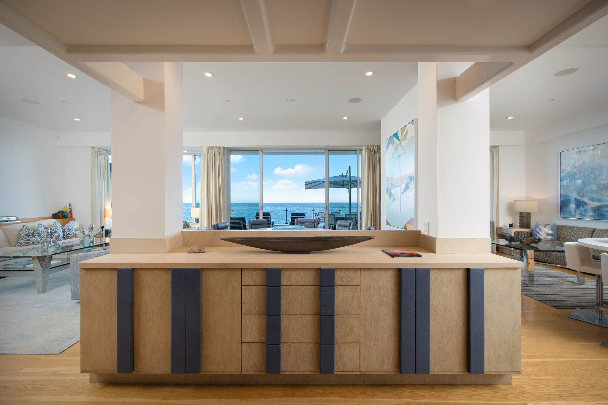 The main level features an open living, dining, and wet bar area, anchored by a designer Bulthaup kitchen with state-of-the-art appliances and a custom center island. Outdoors, an expansive deck with a sunken spa creates an extraordinary space for relaxation or entertaining, set against the soundtrack of the ocean.