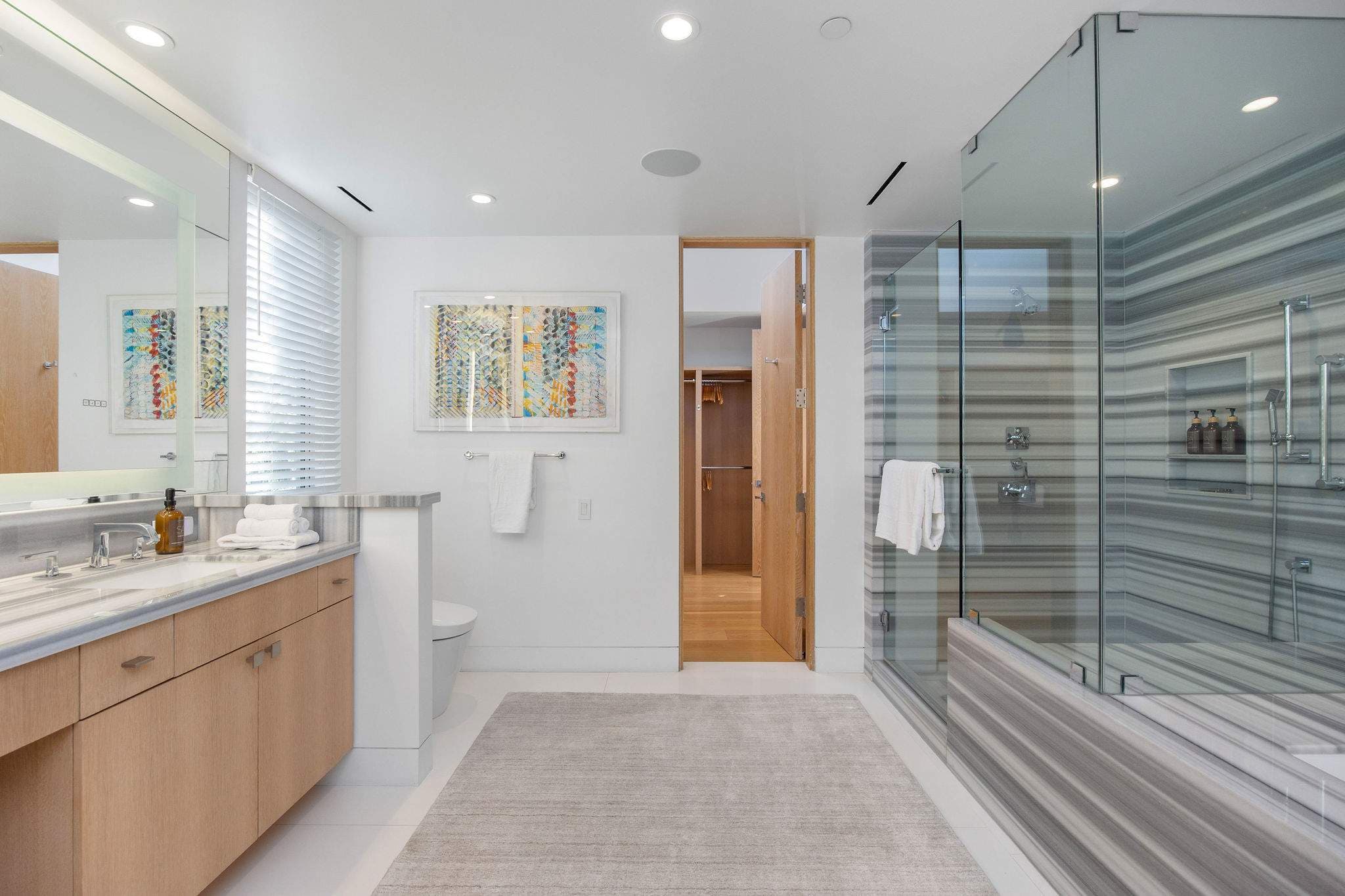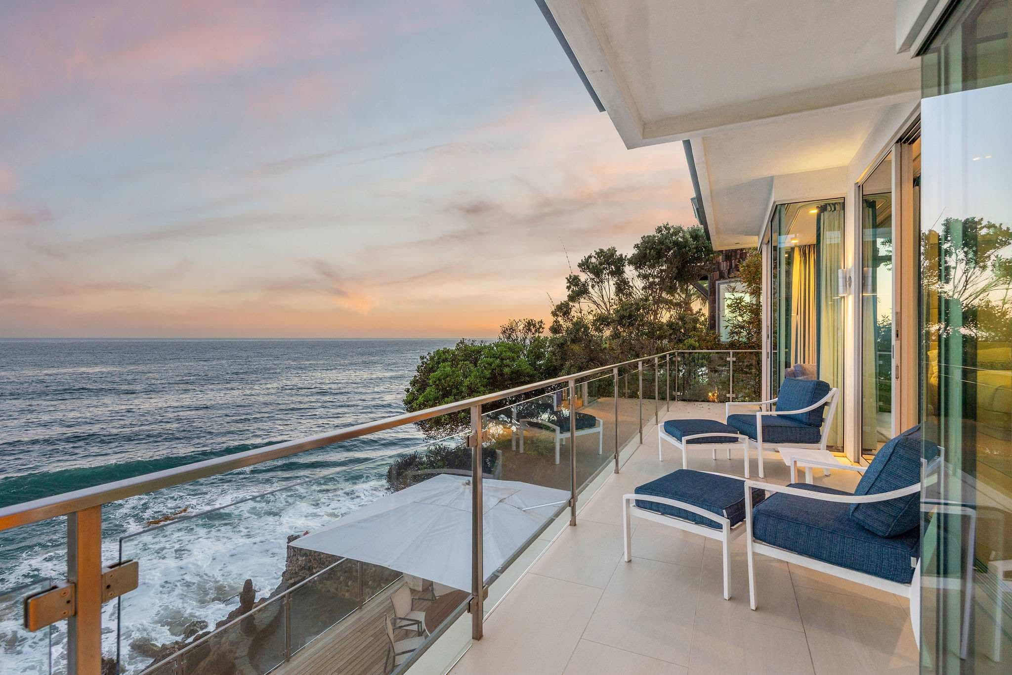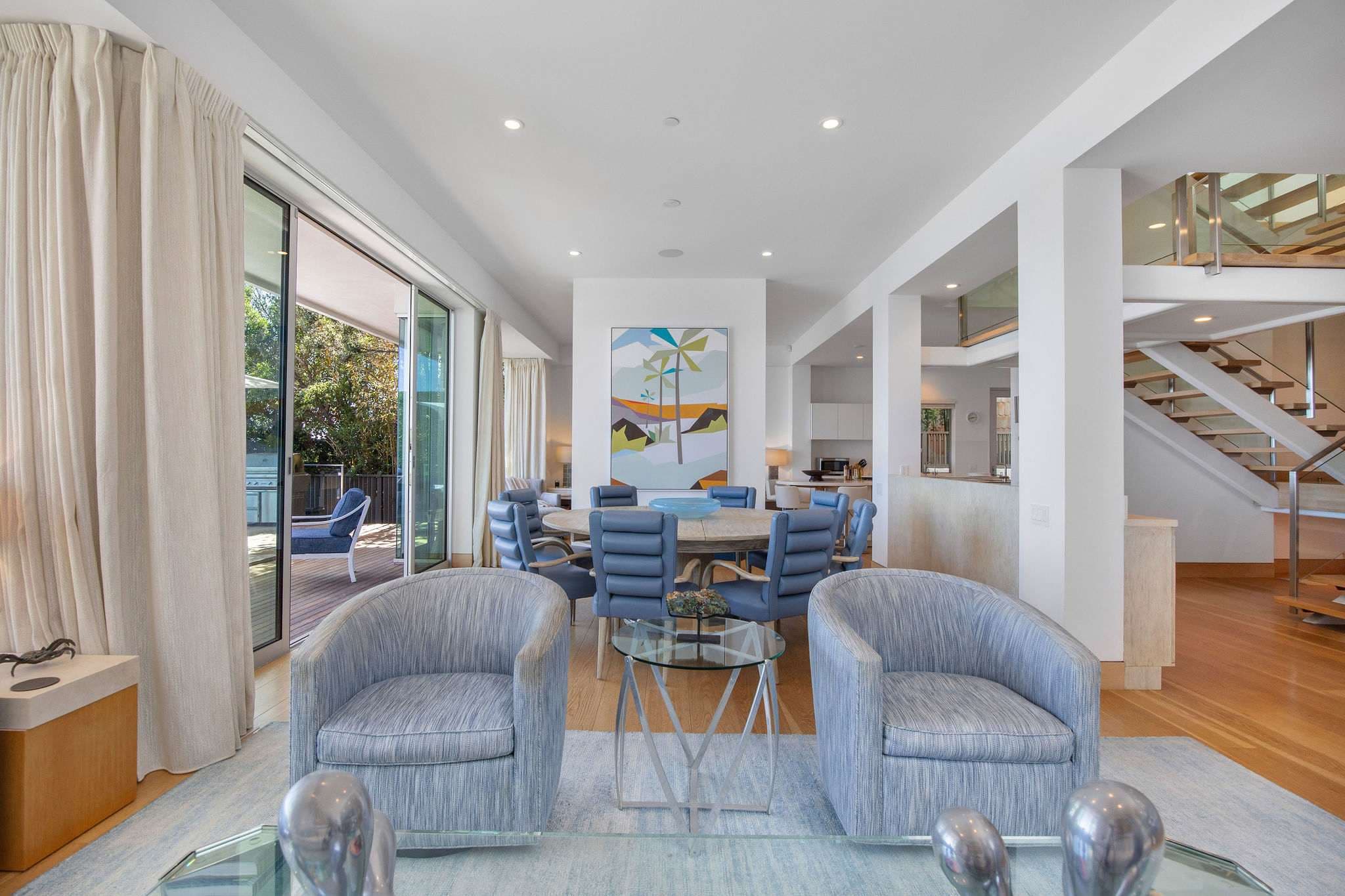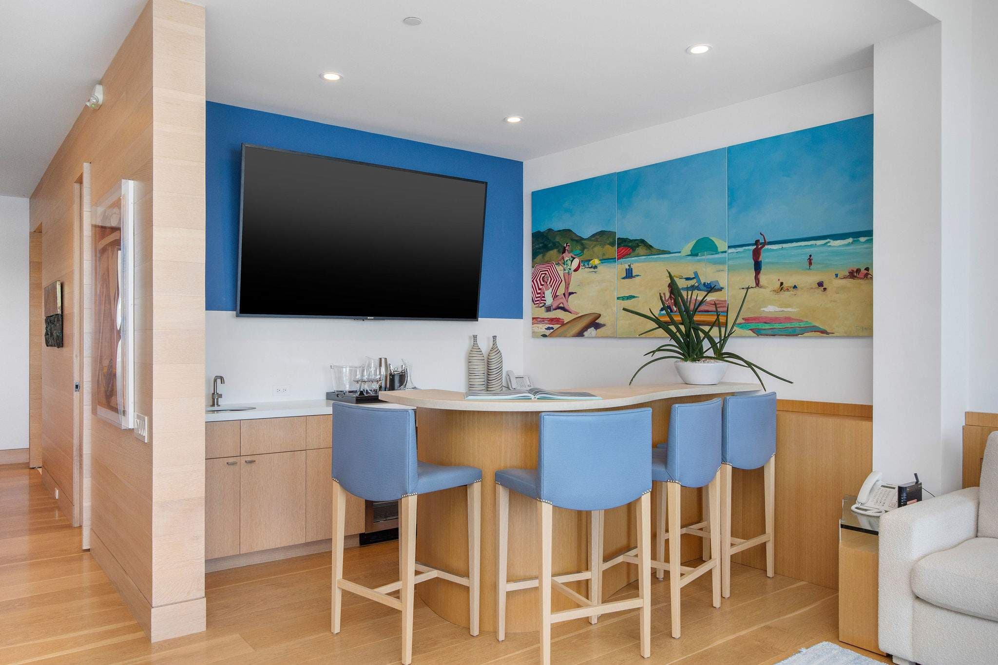 The main level features an open living, dining, and wet bar area, anchored by a designer Bulthaup kitchen with state-of-the-art appliances and a custom center island. Outdoors, an expansive deck with a sunken spa creates an extraordinary space for relaxation or entertaining, set against the soundtrack of the ocean.