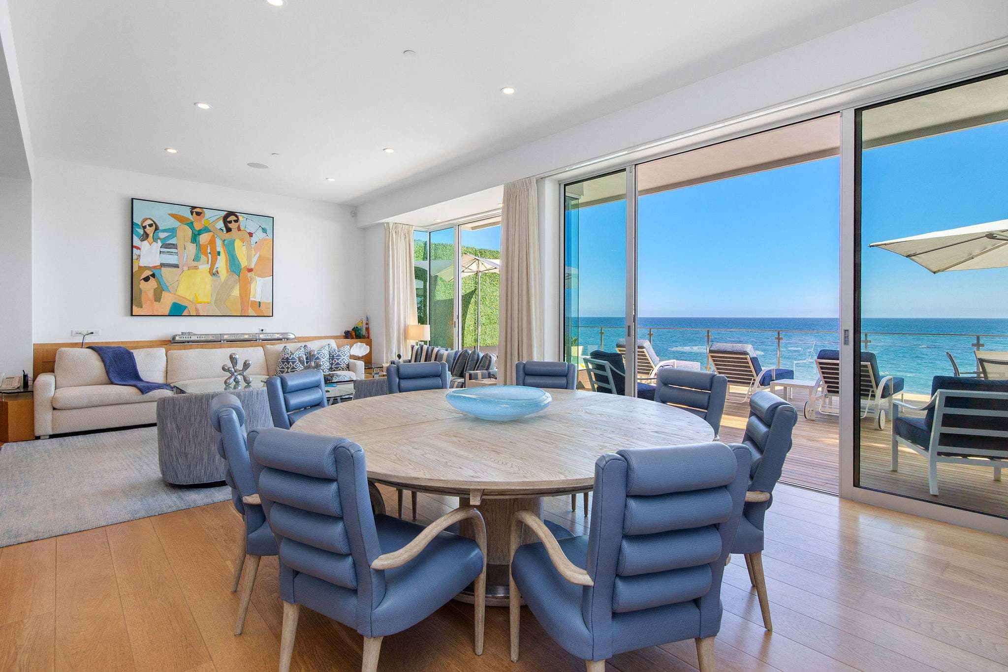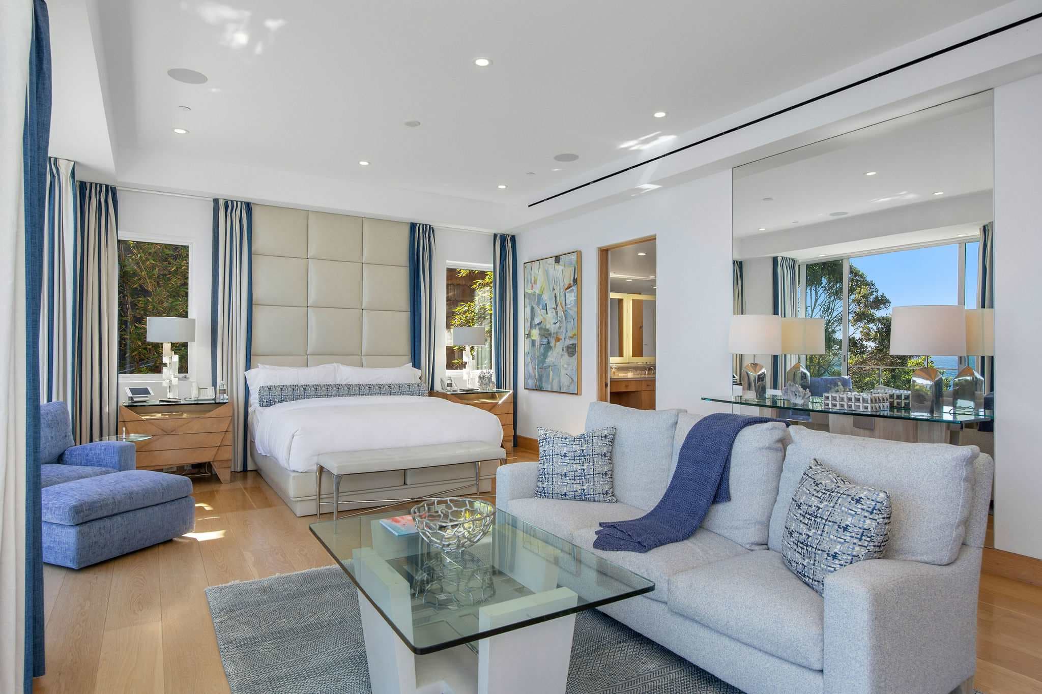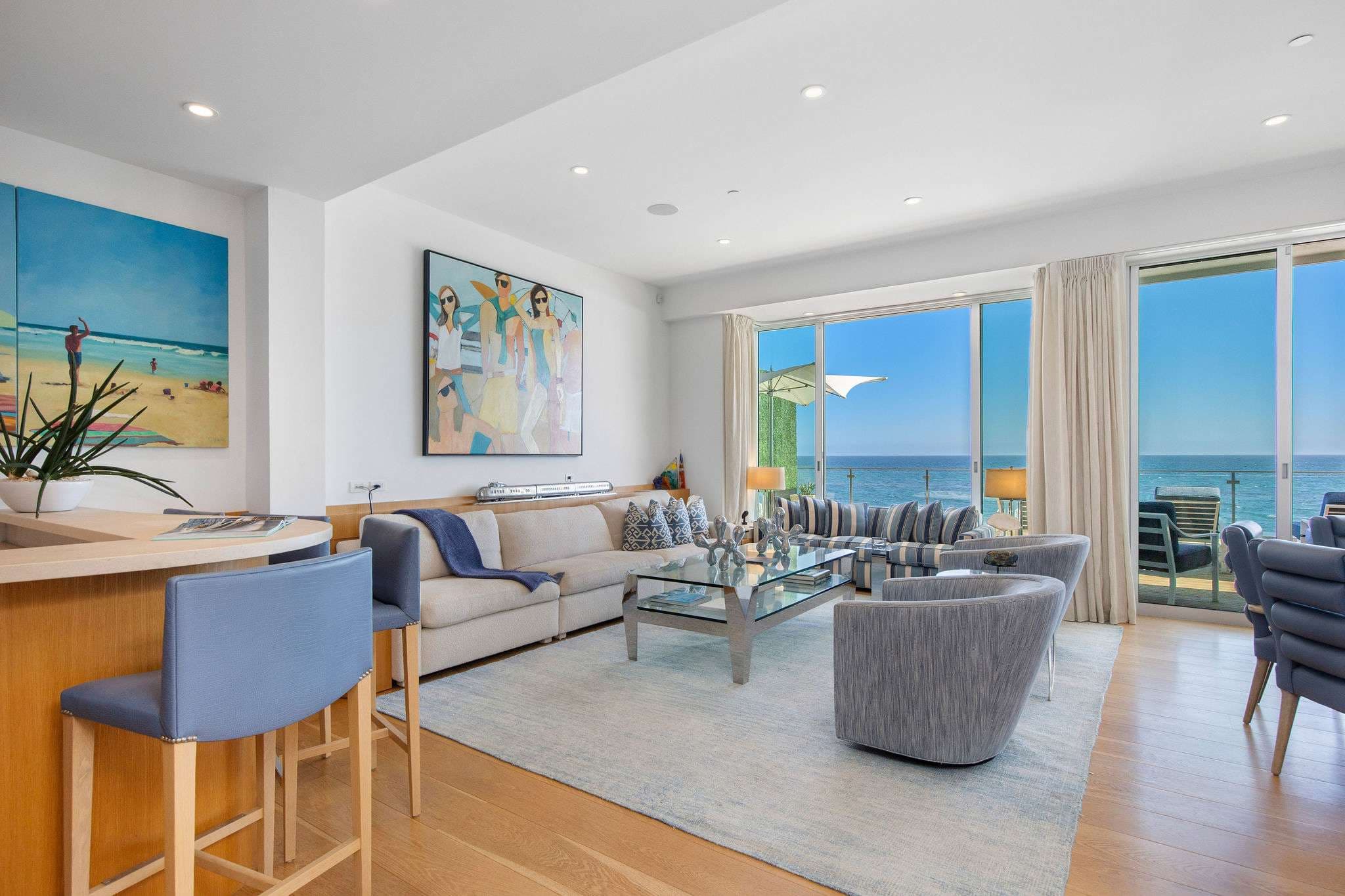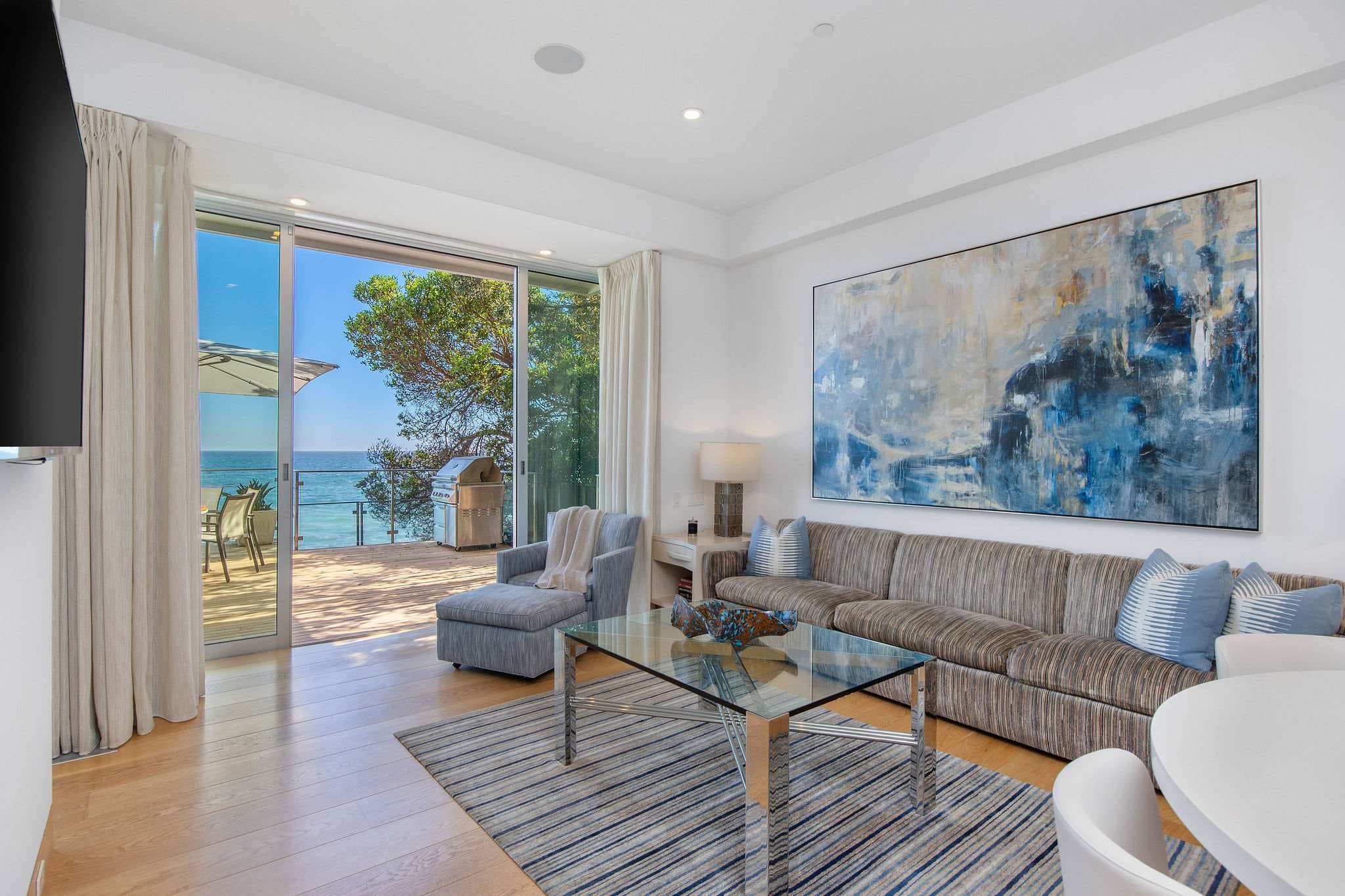 Positioned directly on the sand along Malibu’s iconic coastline, this 4-bedroom, 5-bathroom estate embodies the essence of refined Malibu living. Walls of glass frame sweeping ocean vistas, while interiors are designed to balance sophistication with comfort.