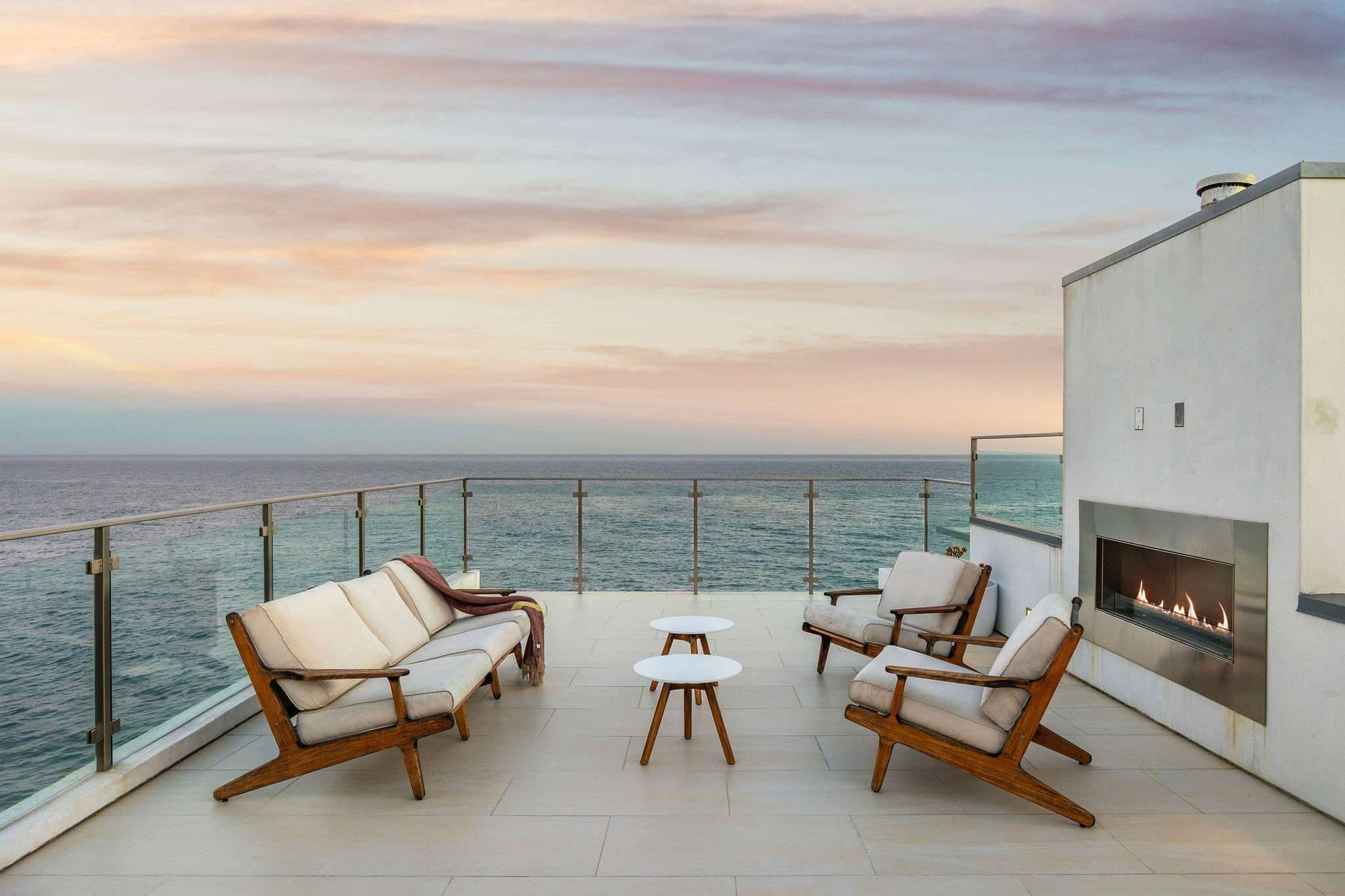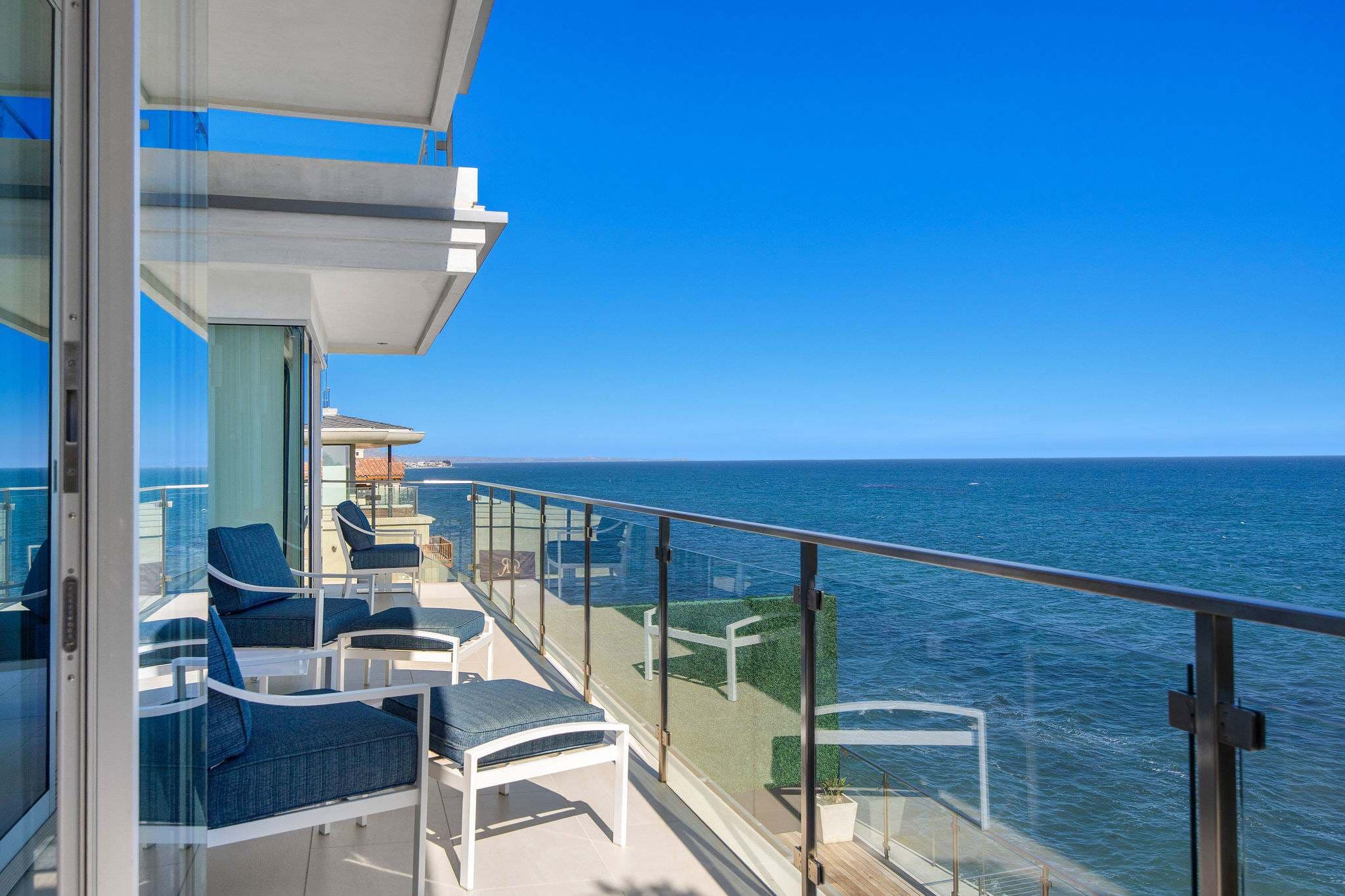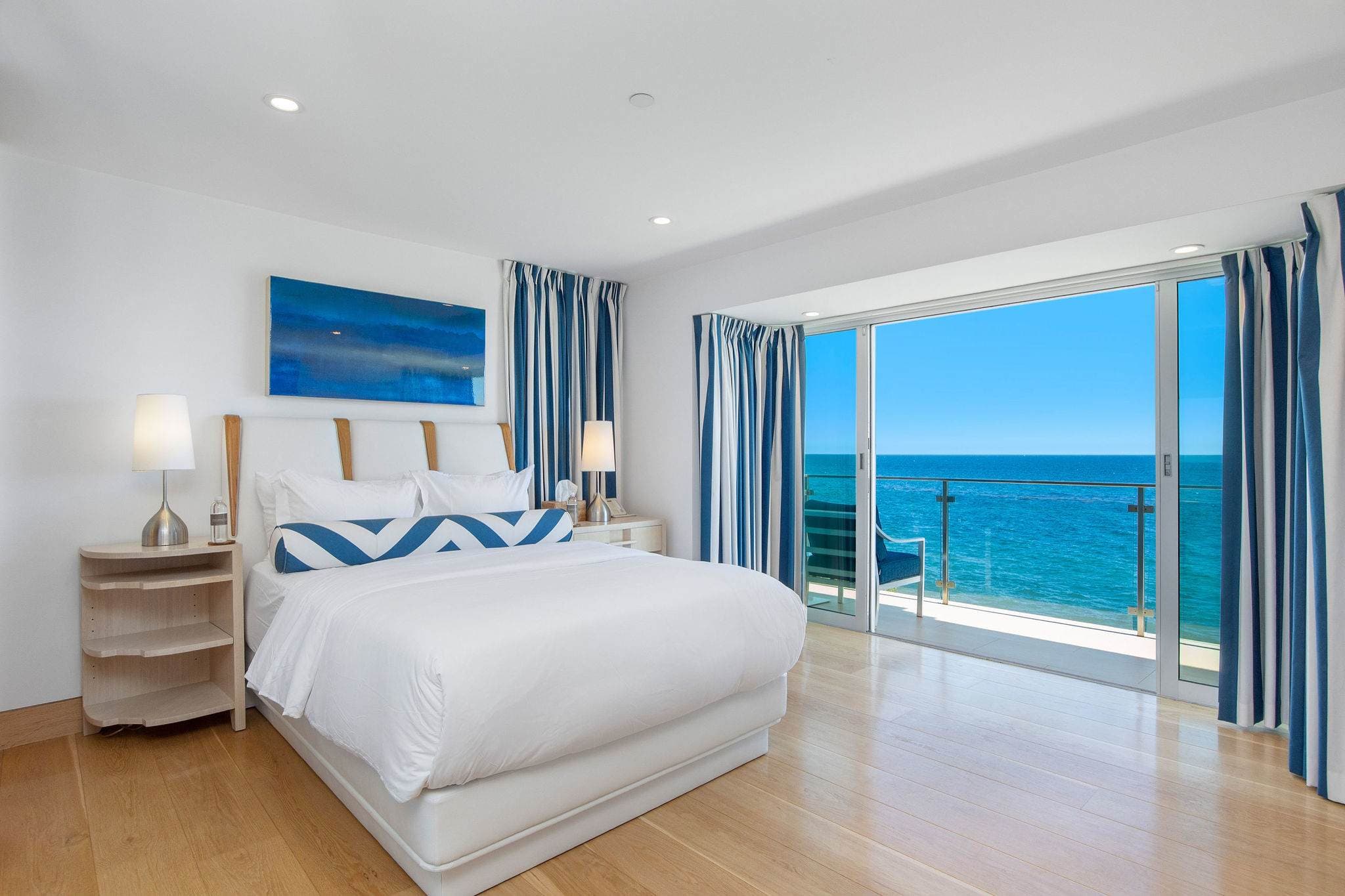 Positioned directly on the sand along Malibu’s iconic coastline, this 4-bedroom, 5-bathroom estate embodies the essence of refined Malibu living. Walls of glass frame sweeping ocean vistas, while interiors are designed to balance sophistication with comfort.