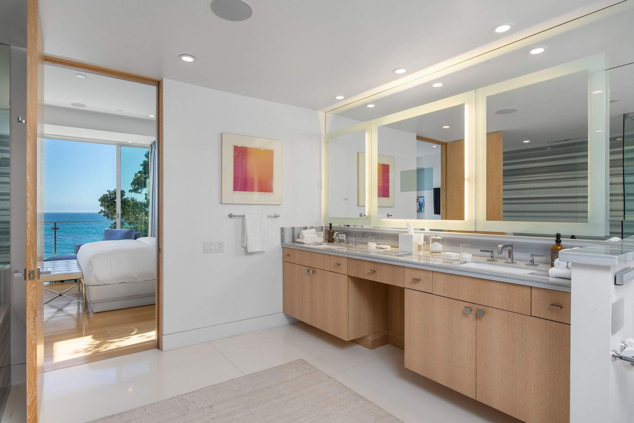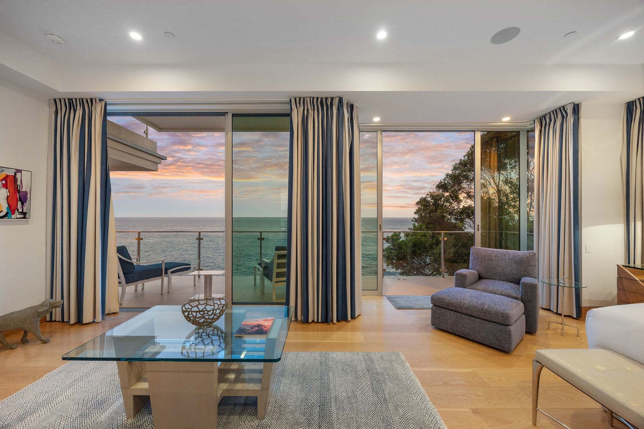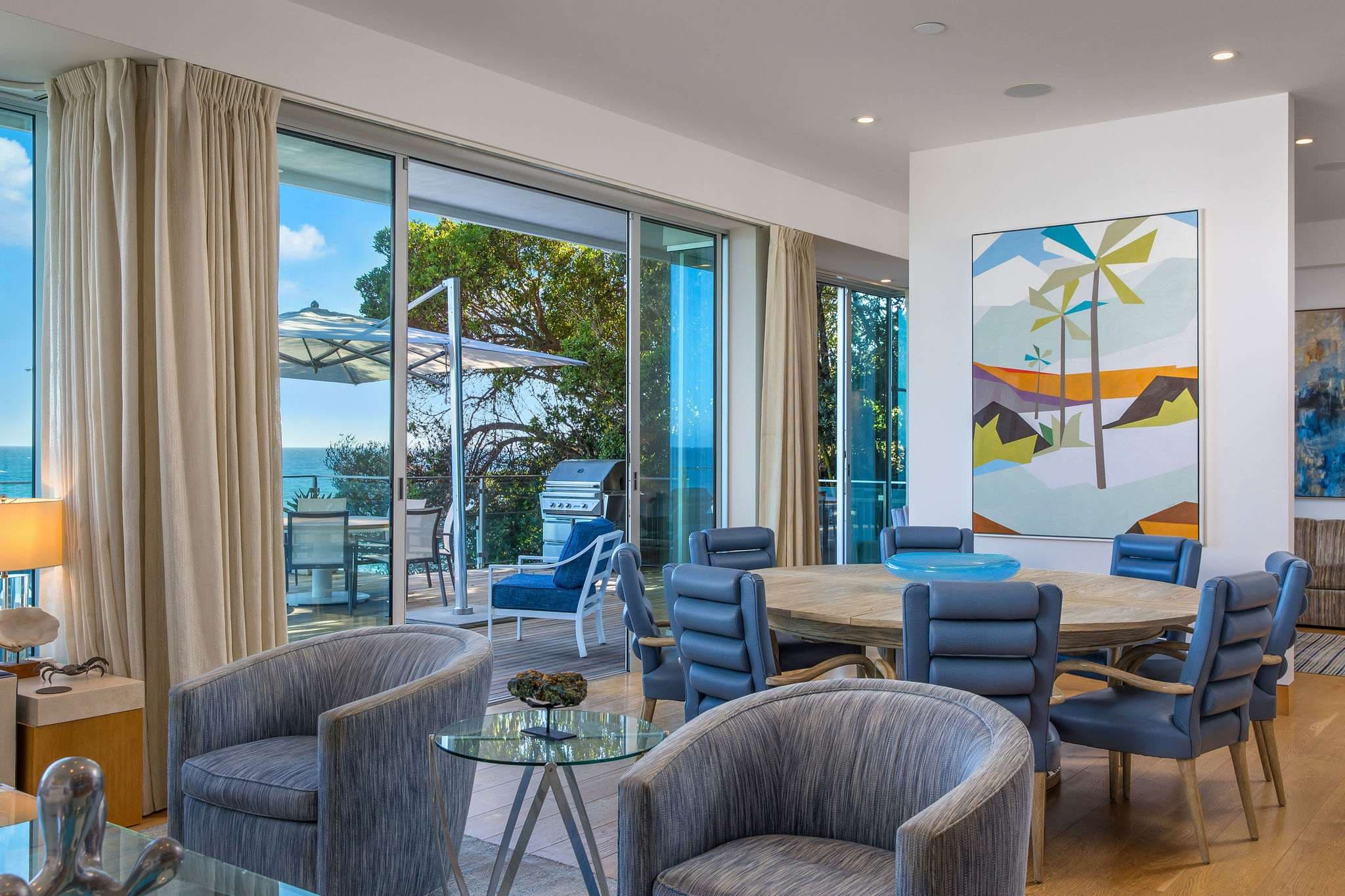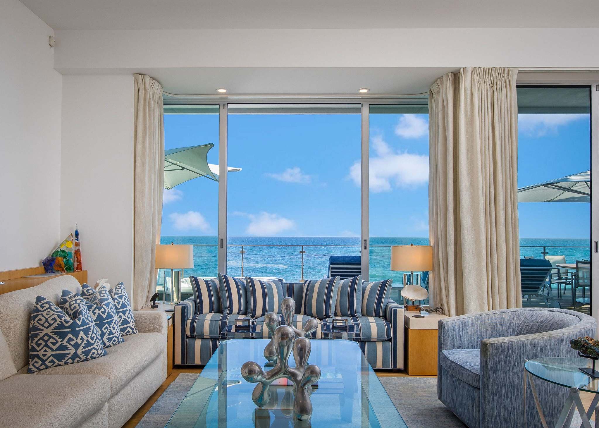 Positioned directly on the sand along Malibu’s iconic coastline, this 4-bedroom, 5-bathroom estate embodies the essence of refined Malibu living. Walls of glass frame sweeping ocean vistas, while interiors are designed to balance sophistication with comfort.