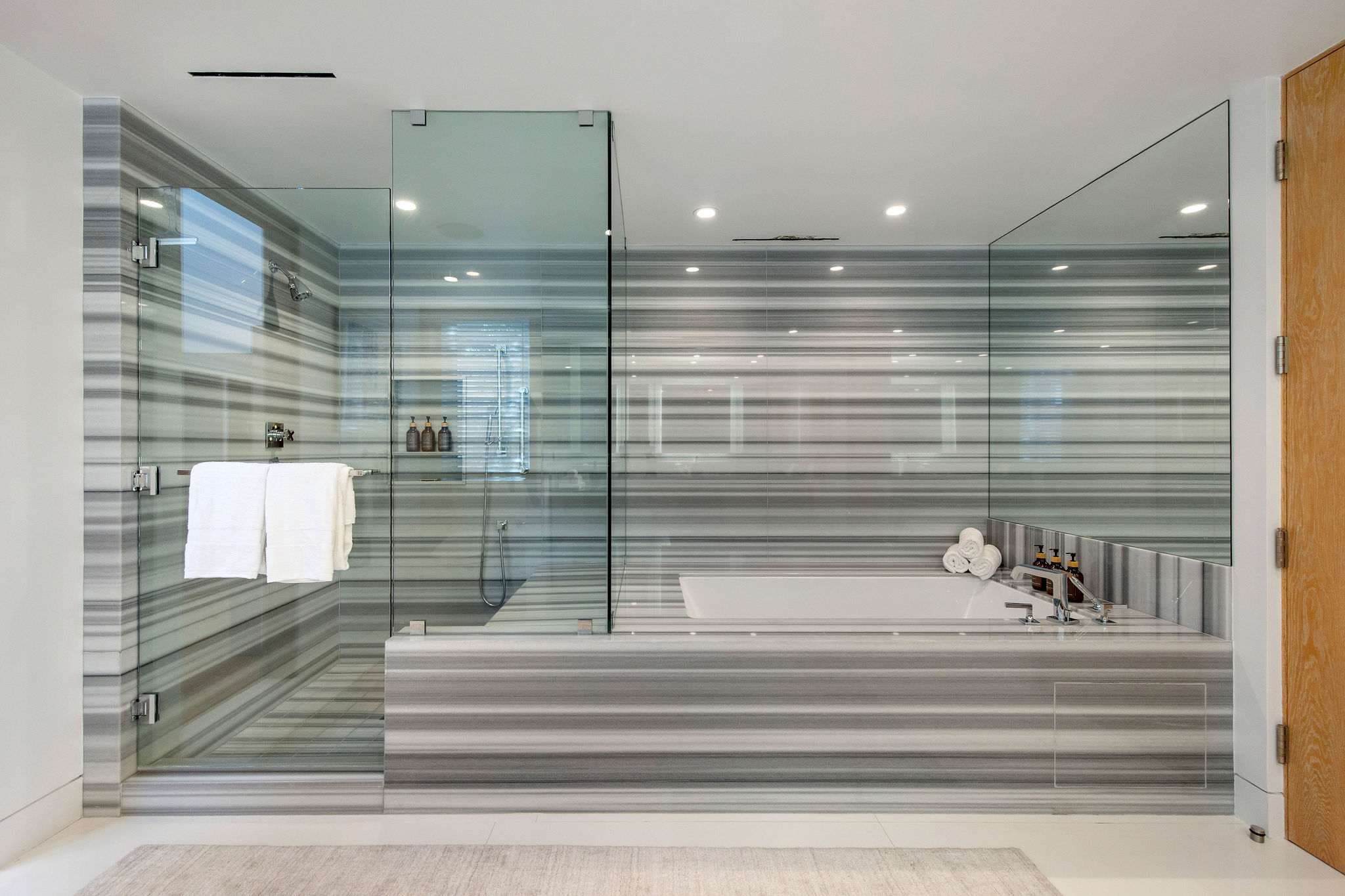 Floor-to-ceiling glass walls frame panoramic ocean views, while the main level flows seamlessly between living, dining, wet bar, and a Bulthaup kitchen. An expansive deck with sunken spa invites relaxation and entertaining. The oversized primary suite offers sweeping views, sitting area, and fireplace, with three guest suites, a third-level view deck, bonus rooms, and elevator access completing the home.
