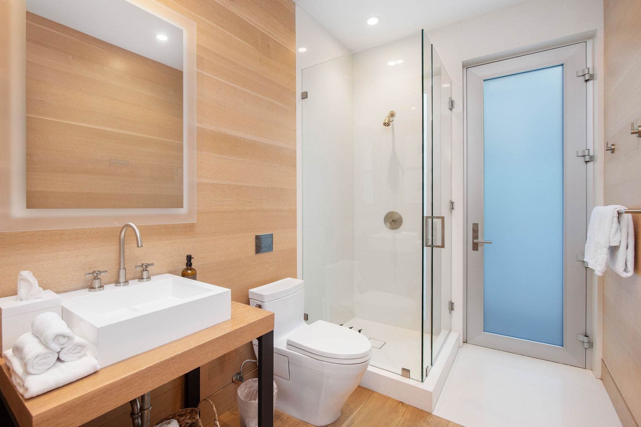 Upstairs, the oversized primary suite offers panoramic views, a sitting area with fireplace, and a spa-inspired bath with soaking tub and dual vanities. Three additional ensuite guest suites provide refined comfort, while the top level reveals a spectacular ocean-view deck with fireplace and two flexible rooms, ideal for a home office or gym. A private elevator connects all three floors with ease.