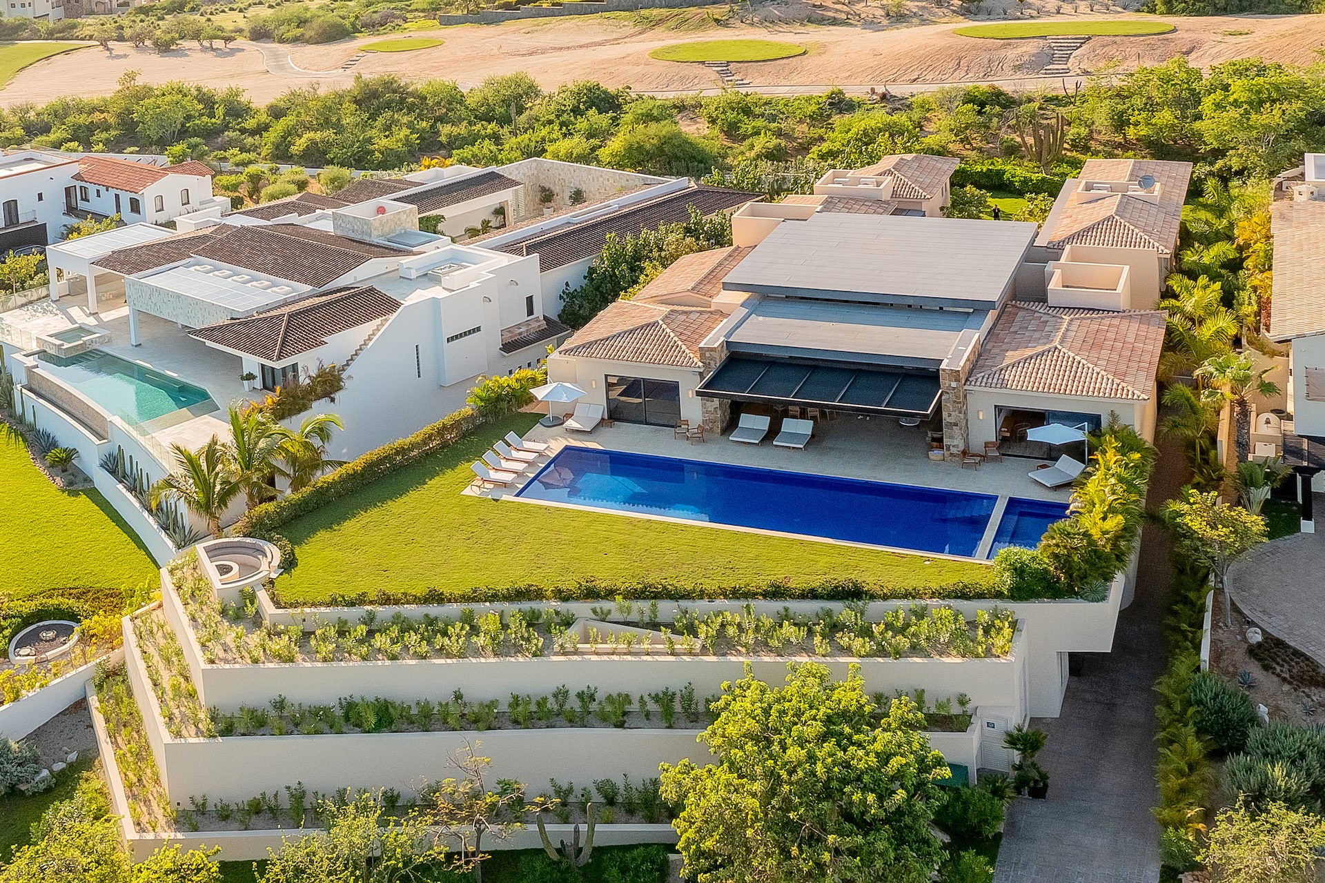 Casa Primavera is a luxurious 8-bedroom retreat that perfectly combines elegance and tranquility. Located steps from the 7th hole of the renowned Puerto Los Cabos Golf Course, this villa offers stunning views of the ocean and lush fairways. The expansive outdoor terrace is designed for ultimate relaxation, featuring an infinity pool, a gas grill for al fresco dining, and a spacious fire pit with ample seating for cozy evenings under the stars.