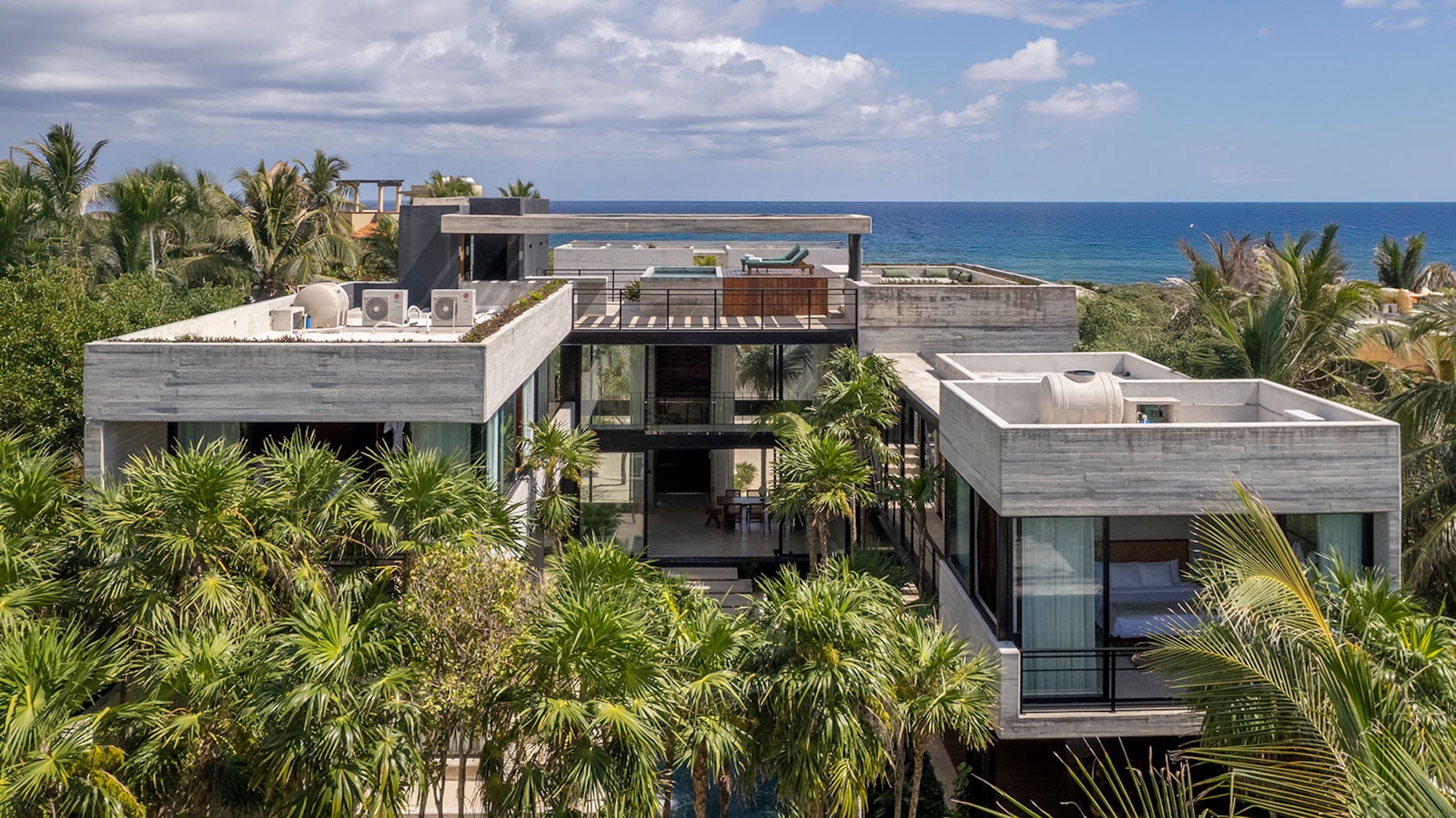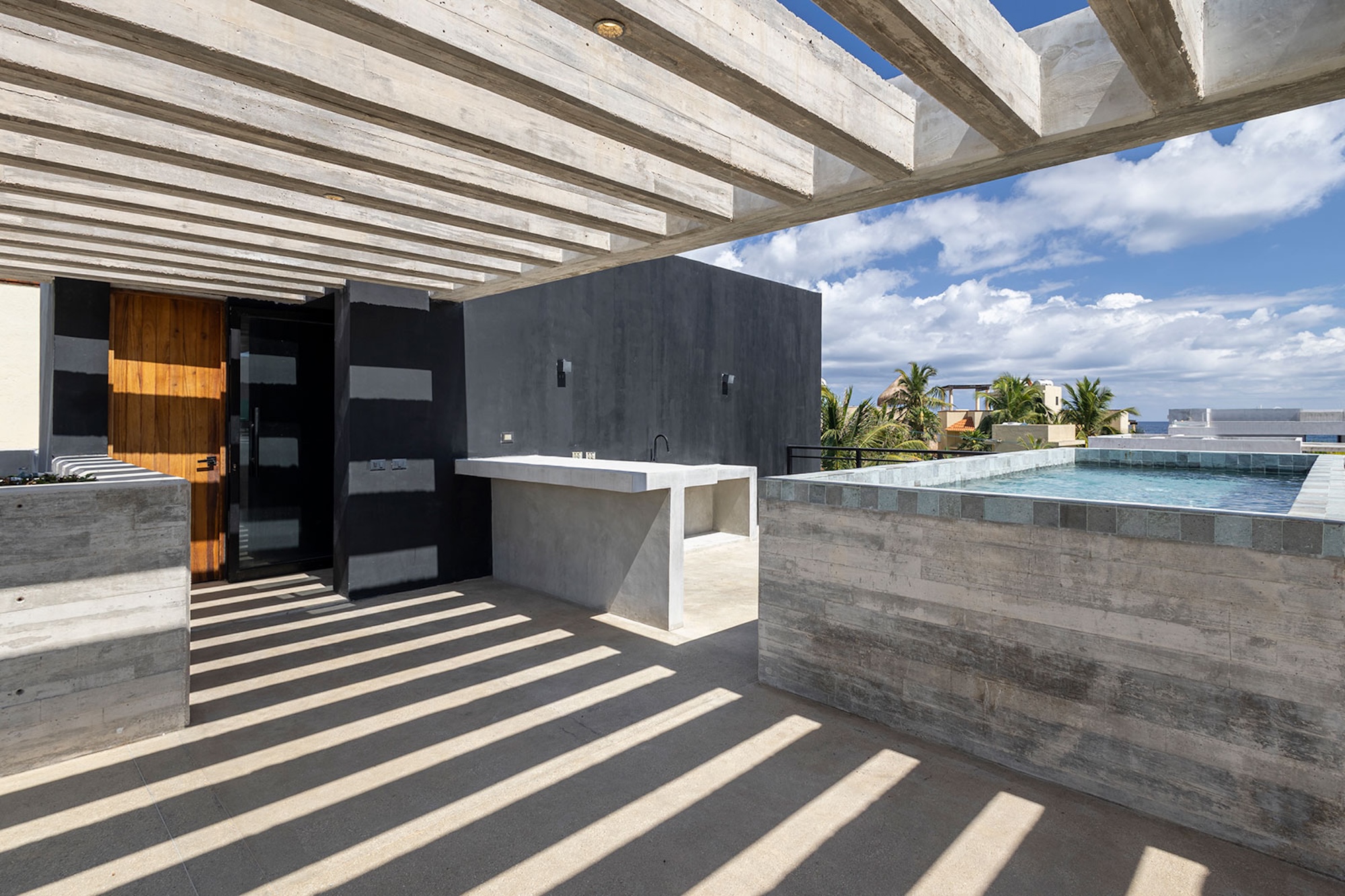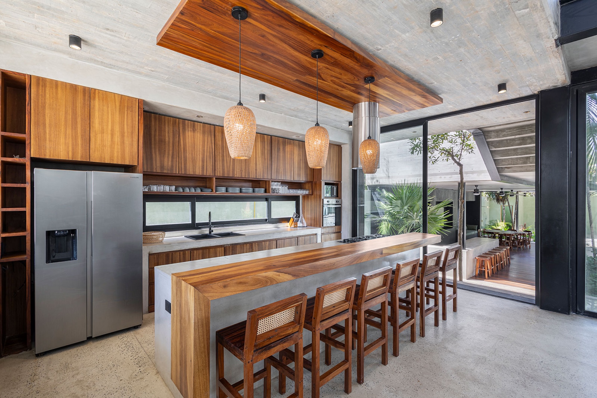For panoramic ocean views, head to the rooftop terrace. Here, a second heated pool overlooks the coastline, accompanied by a lounge area and bar—just the spot for sipping cocktails at sunset or enjoying the stars above. A private chef is available to prepare personalized meals, while the open-concept kitchen and outdoor dining space turn every meal into a memorable experience.