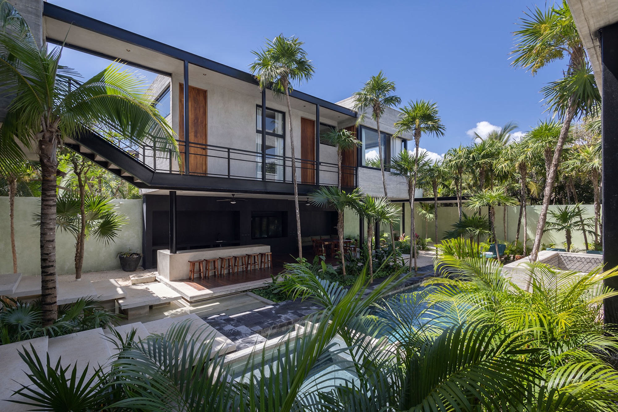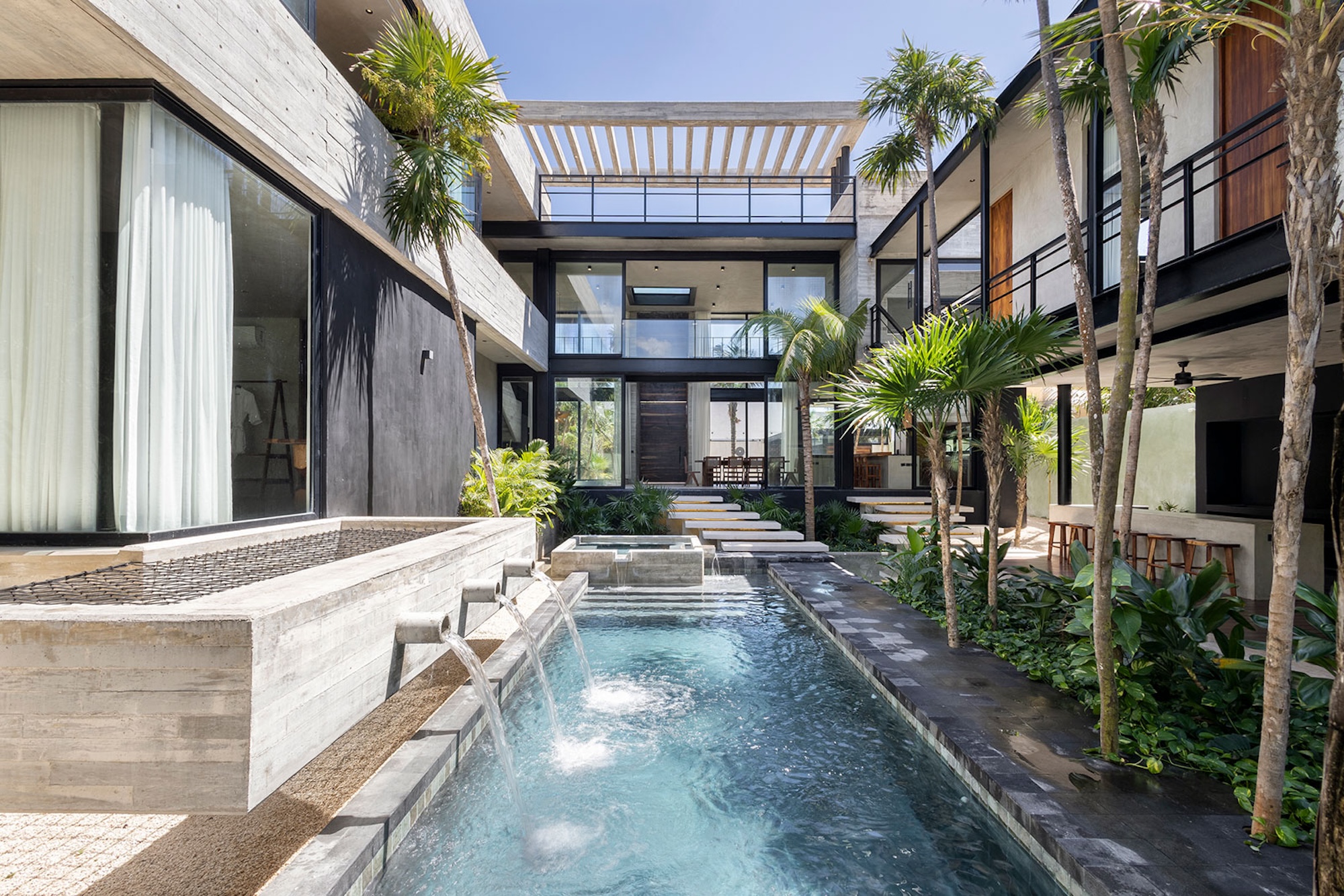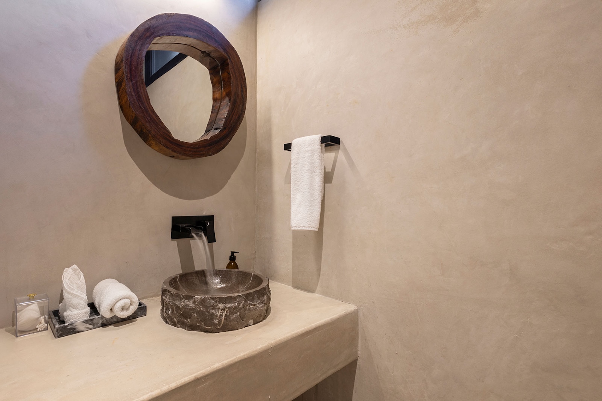 The centerpiece of the villa is the main-level swimming pool, surrounded by sun loungers and a bar—ideal for carefree afternoons in the sunshine. A tranquil, shaded yoga area offers a calm space to reconnect and recharge. As evening sets in, the glow of the heated pool creates an inviting ambiance for peaceful nights shared with loved ones.