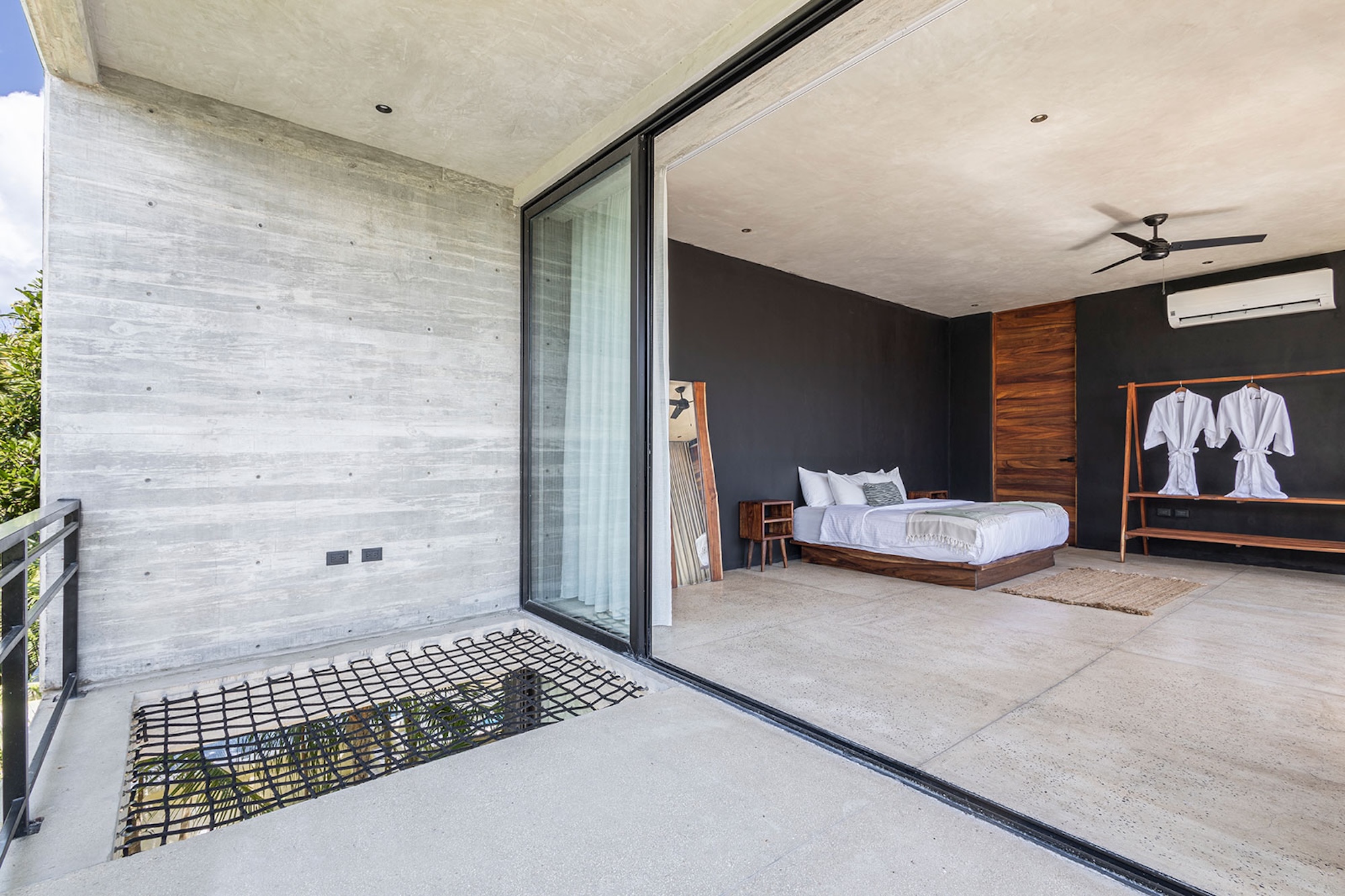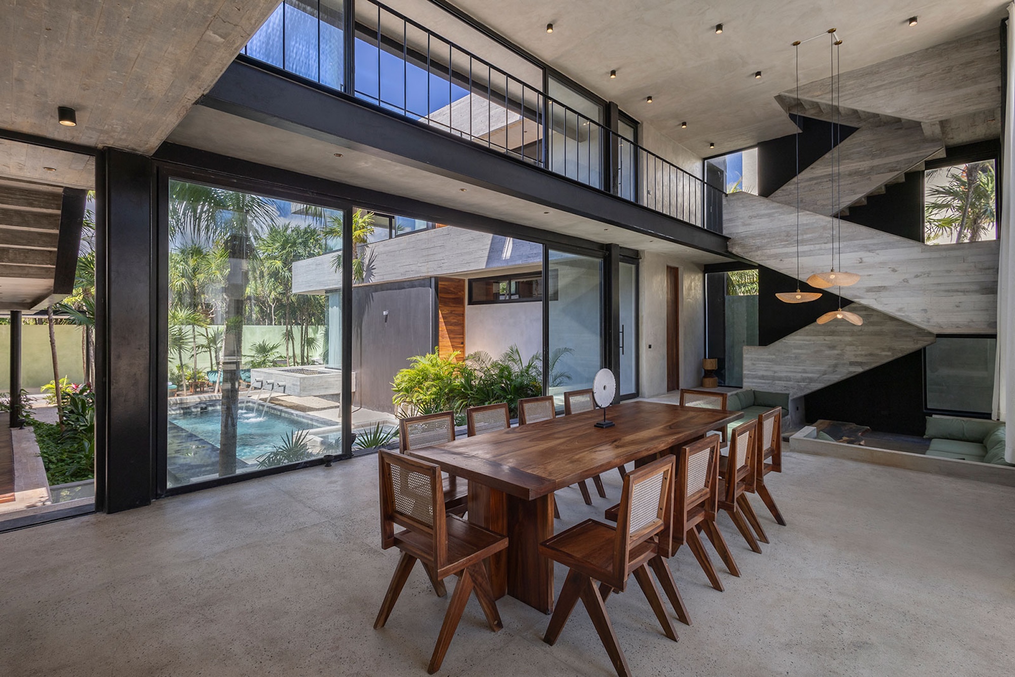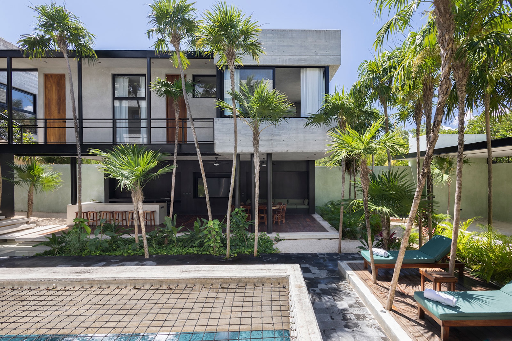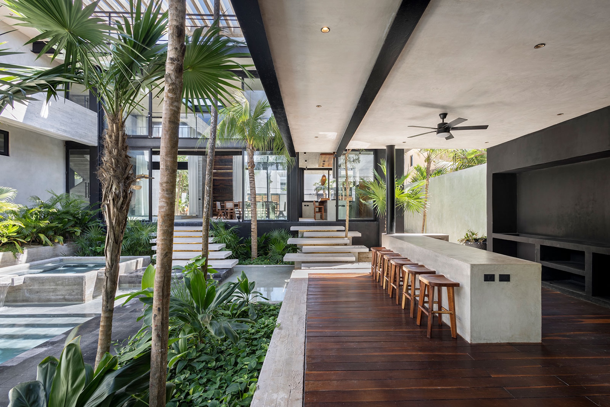 The centerpiece of the villa is the main-level swimming pool, surrounded by sun loungers and a bar—ideal for carefree afternoons in the sunshine. A tranquil, shaded yoga area offers a calm space to reconnect and recharge. As evening sets in, the glow of the heated pool creates an inviting ambiance for peaceful nights shared with loved ones.