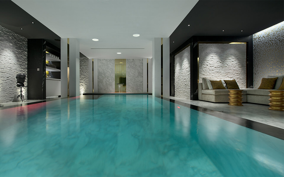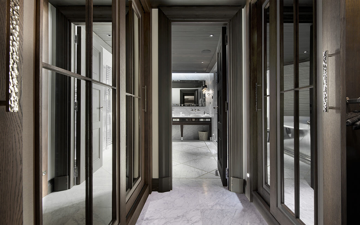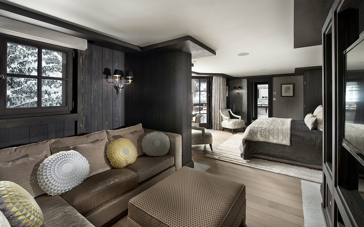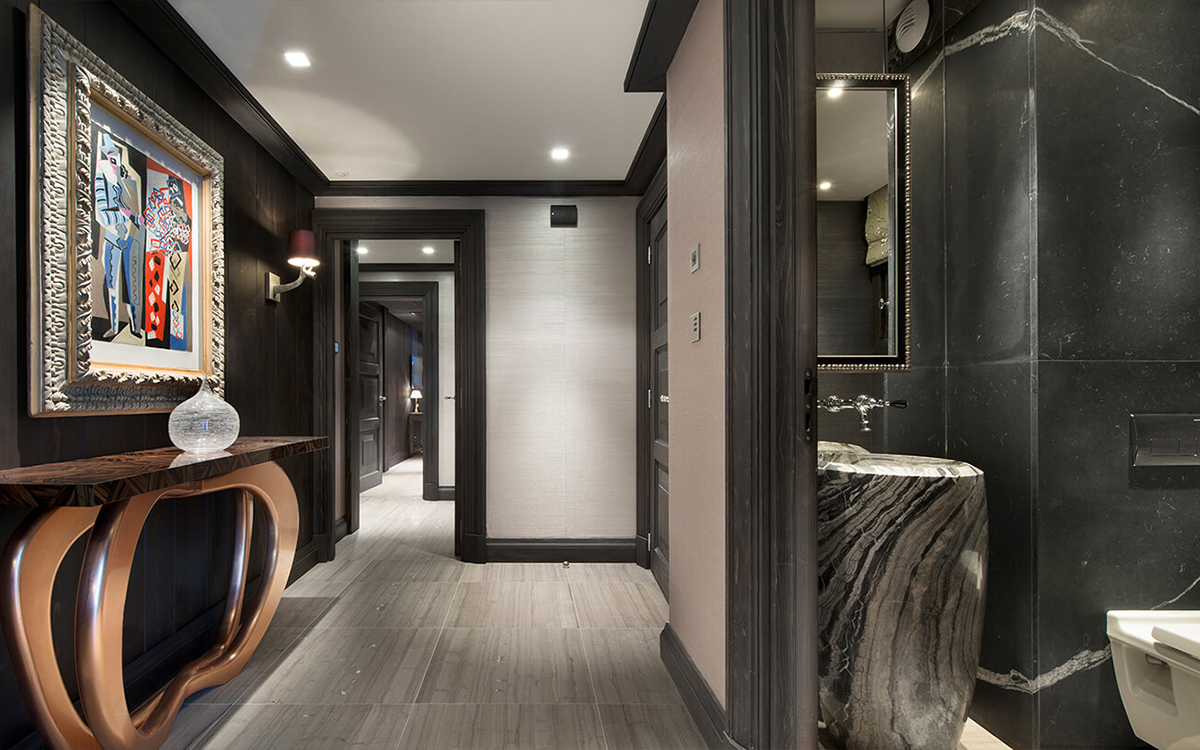 Drawing inspiration from the surrounding winter landscape, the chalet’s shimmering accents and rich textures mirror the enchantment of the mountains. Its centerpiece is a luxurious wellness area featuring a ten-meter pool, soothing steam room, Jacuzzi, and private massage suite—an idyllic sanctuary after a day on the slopes. At the heart of the chalet, a sculptural staircase ascends to a verdant rooftop garden, while expansive windows flood the interiors with natural light.
