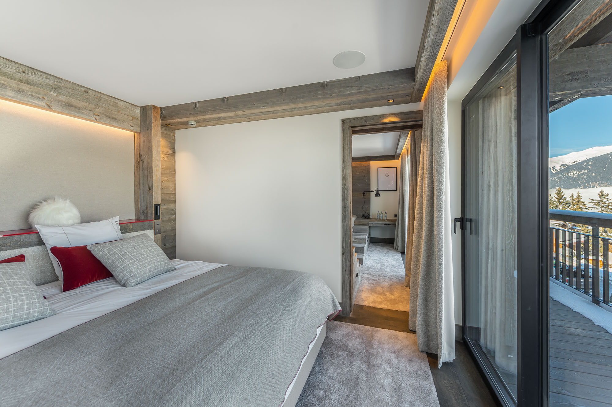 The main living spaces occupy an entire floor, offering a generous lounge with plush seating around an open fireplace, a fully equipped contemporary kitchen, and a bright, elegant dining area. Designed to blend traditional Alpine charmwith modern sophistication, the chalet’s décor highlights weathered wood, wool accents, and tasteful furnishings, creating a warm, inviting ambiance that extends even to the ski room.