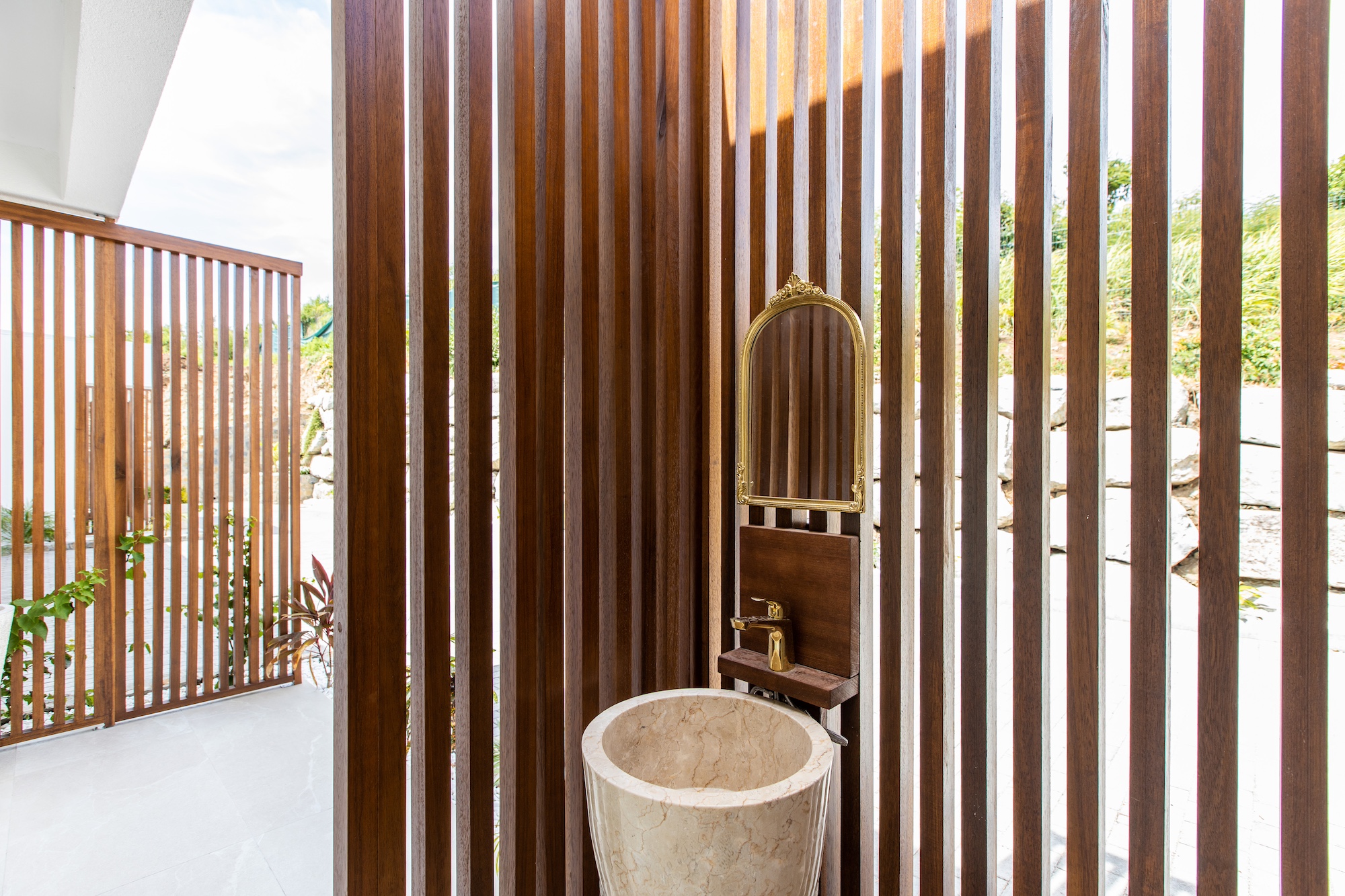 The villa offers four beautifully designed bedrooms, each created with privacy and relaxation in mind. Two of the bedrooms include private ensuite bathrooms, offering guests a secluded and indulgent retreat. The remaining two bedrooms share a stylishly appointed bathroom, making the layout ideal for families or groups traveling together. Adding a special touch, one of the bedrooms features an outdoor shower, allowing guests to enjoy a refreshing open-air experience surrounded by the villa’s natural surroundings.