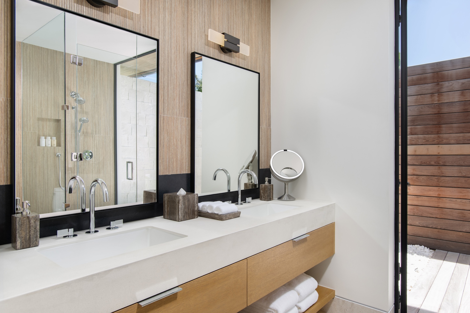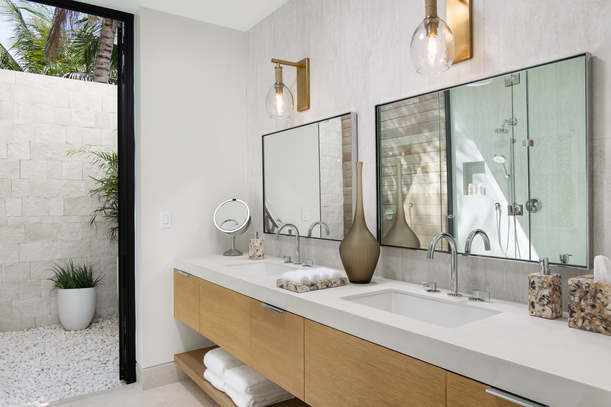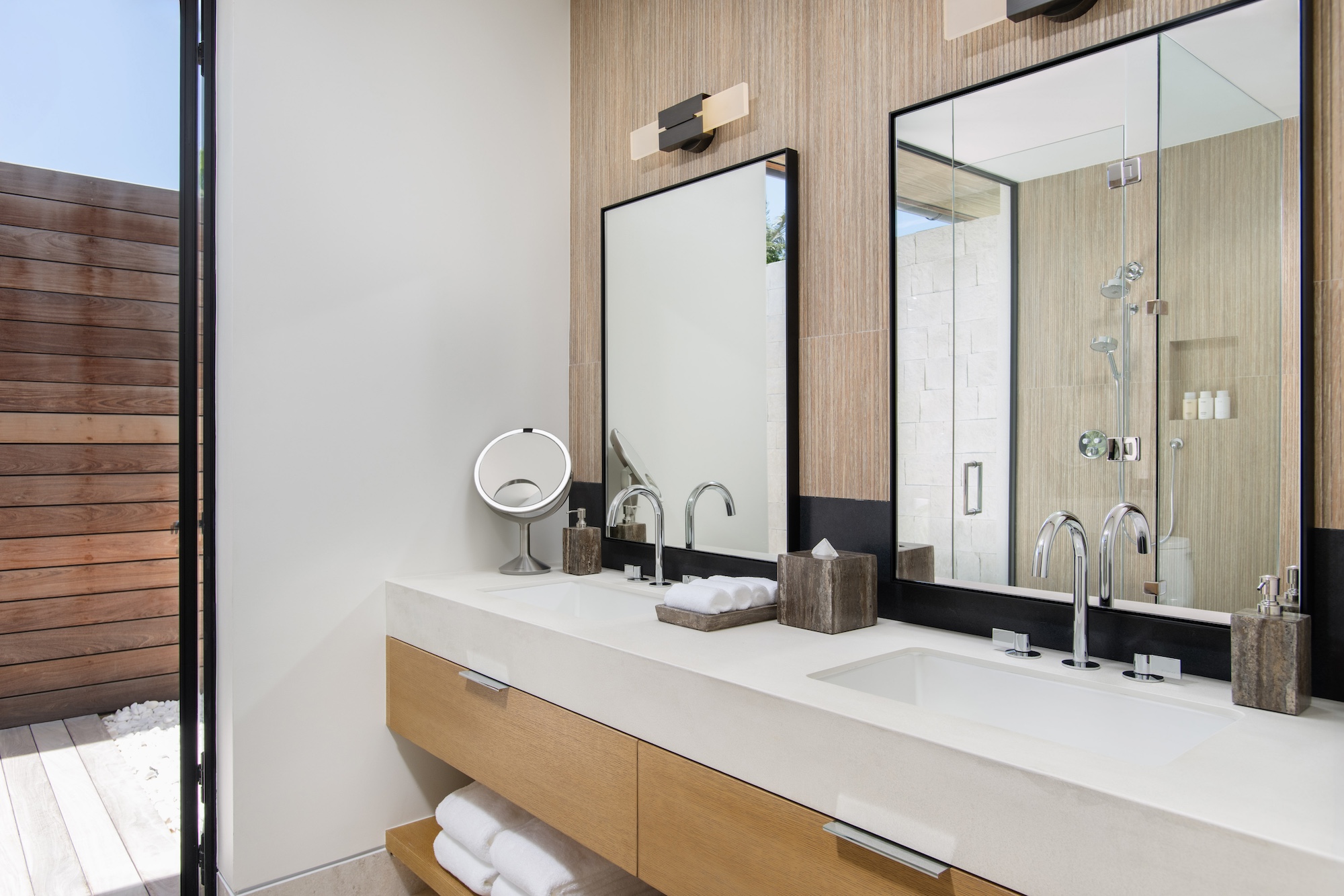 Inside, natural textures and an earthy palette reflect the home’s beachfront surroundings. High ceilings and broad windows invite the outdoors in, while curated artworks and luxe materials cultivate a sense of calm sophistication. The main living area flows seamlessly onto the terrace and includes a sleek kitchen, a bar, dining for sixteen, and a casual lounge. A cozy media room, professional-grade back kitchen, and sheltered alfresco dining area complement the home’s many entertaining options.