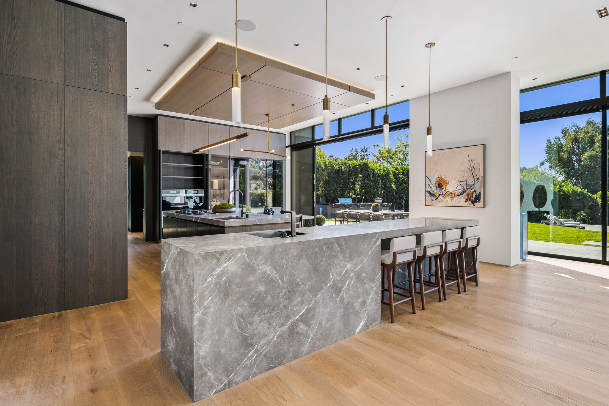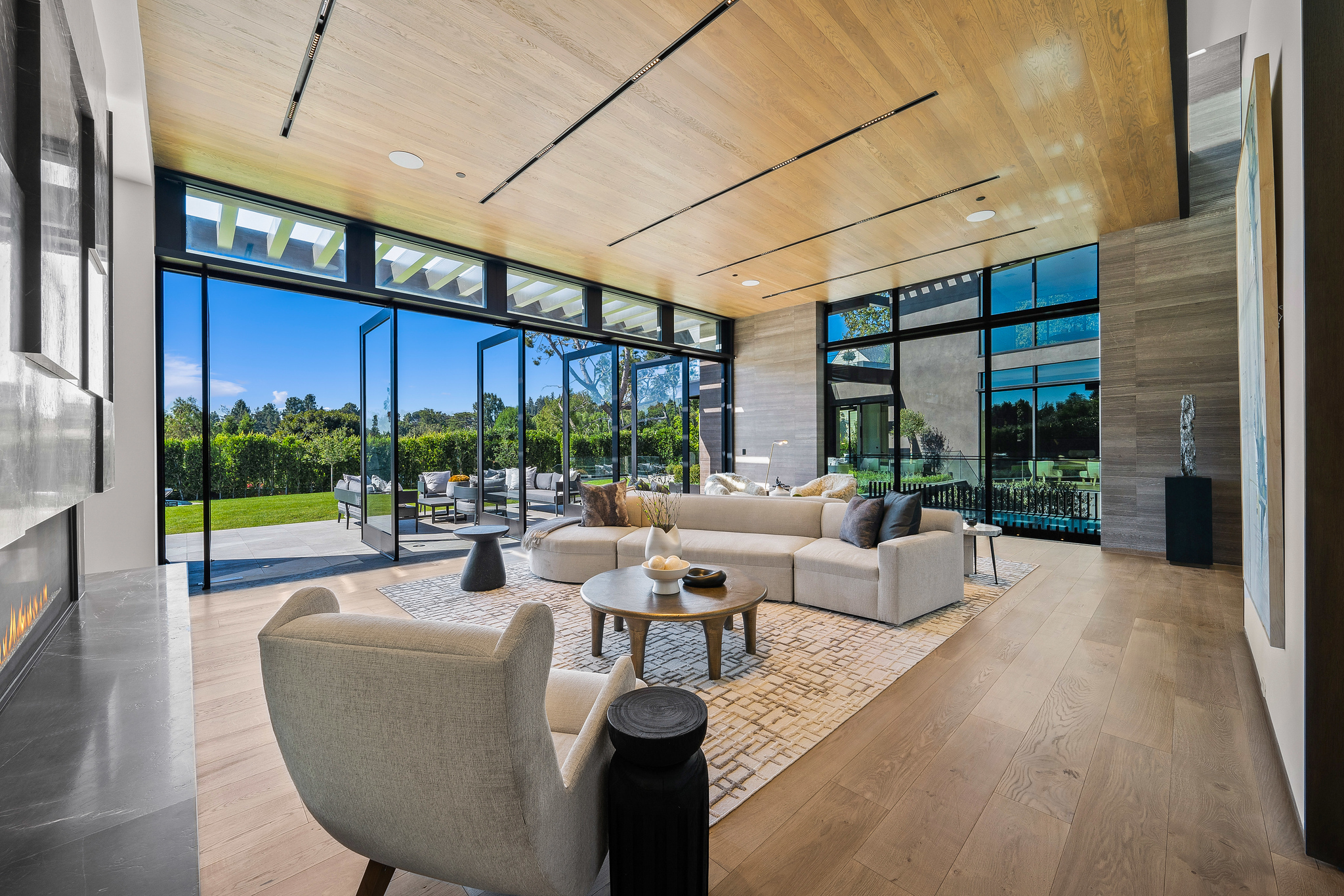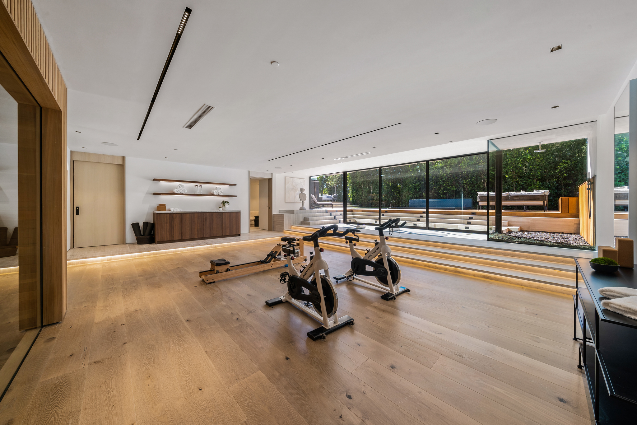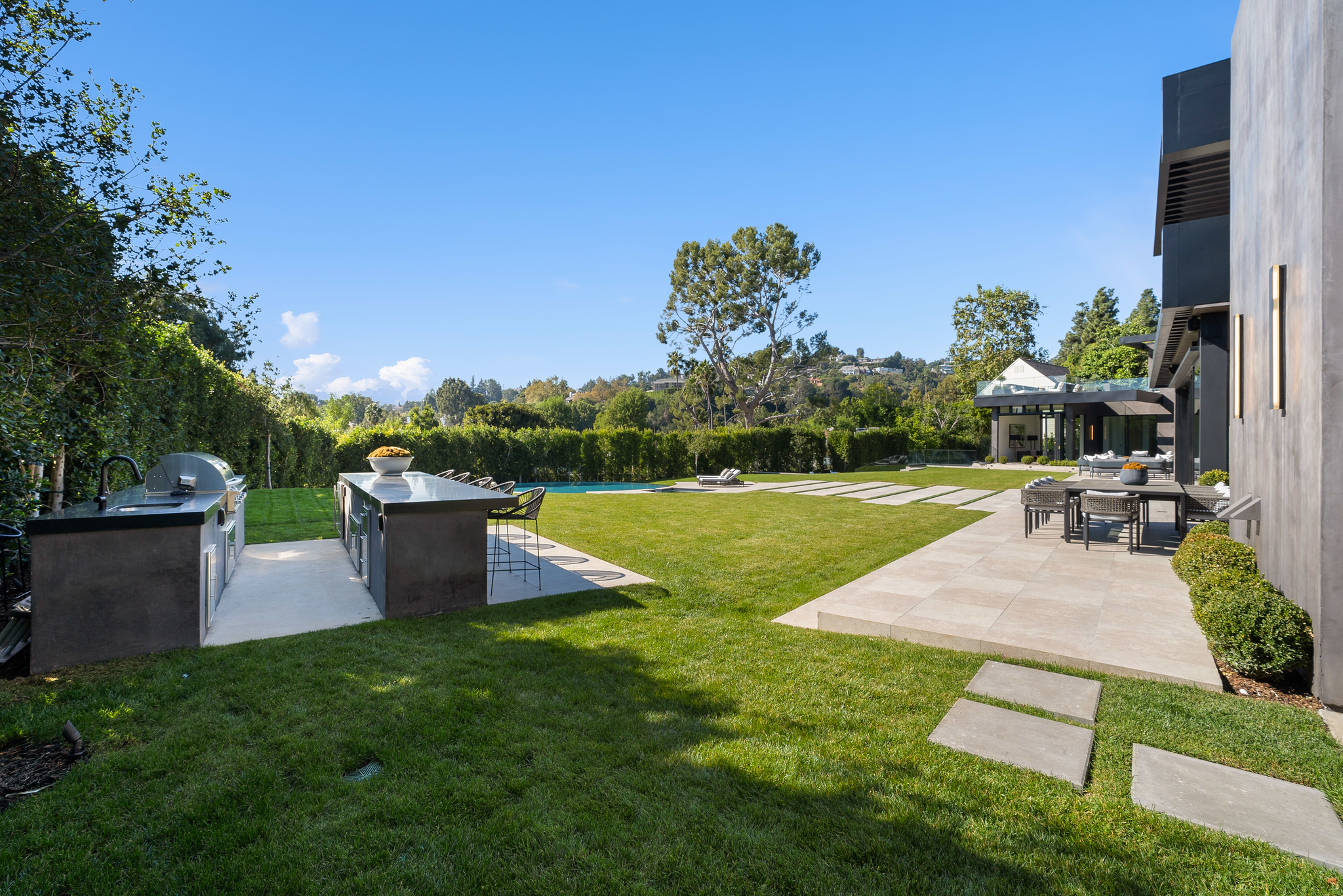 The lower level is a haven for entertainment, offering a stylish bar, a resort-style gym, and a spa that includes a pool, a yoga and massage room. Outside, the manicured grounds feature a pool and spa area alongside a complete BBQ kitchen setup. Situated within a 10-minute radius of Harvard-Westlake Middle School, Westwood, and Beverly Hills, Forza Modern offers a blend of sophistication and convenience in an idyllic location.
