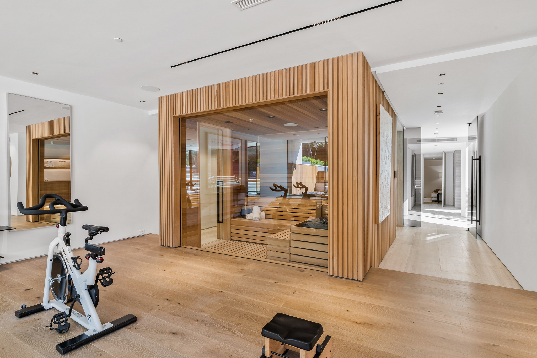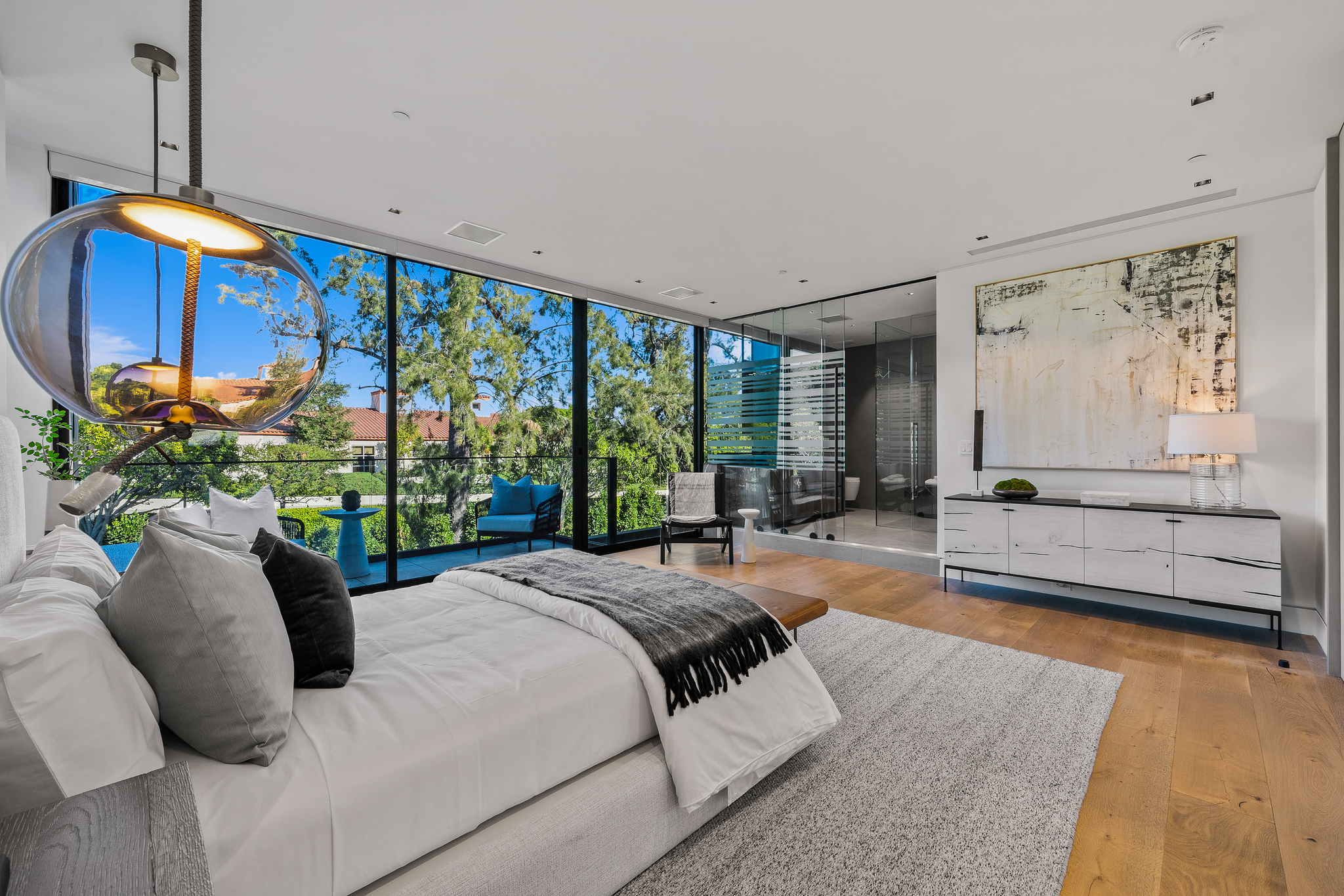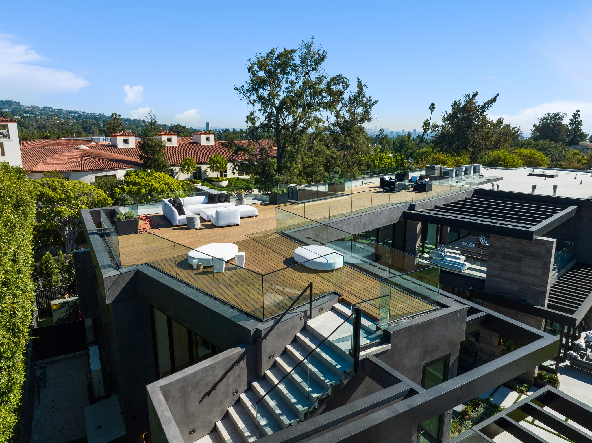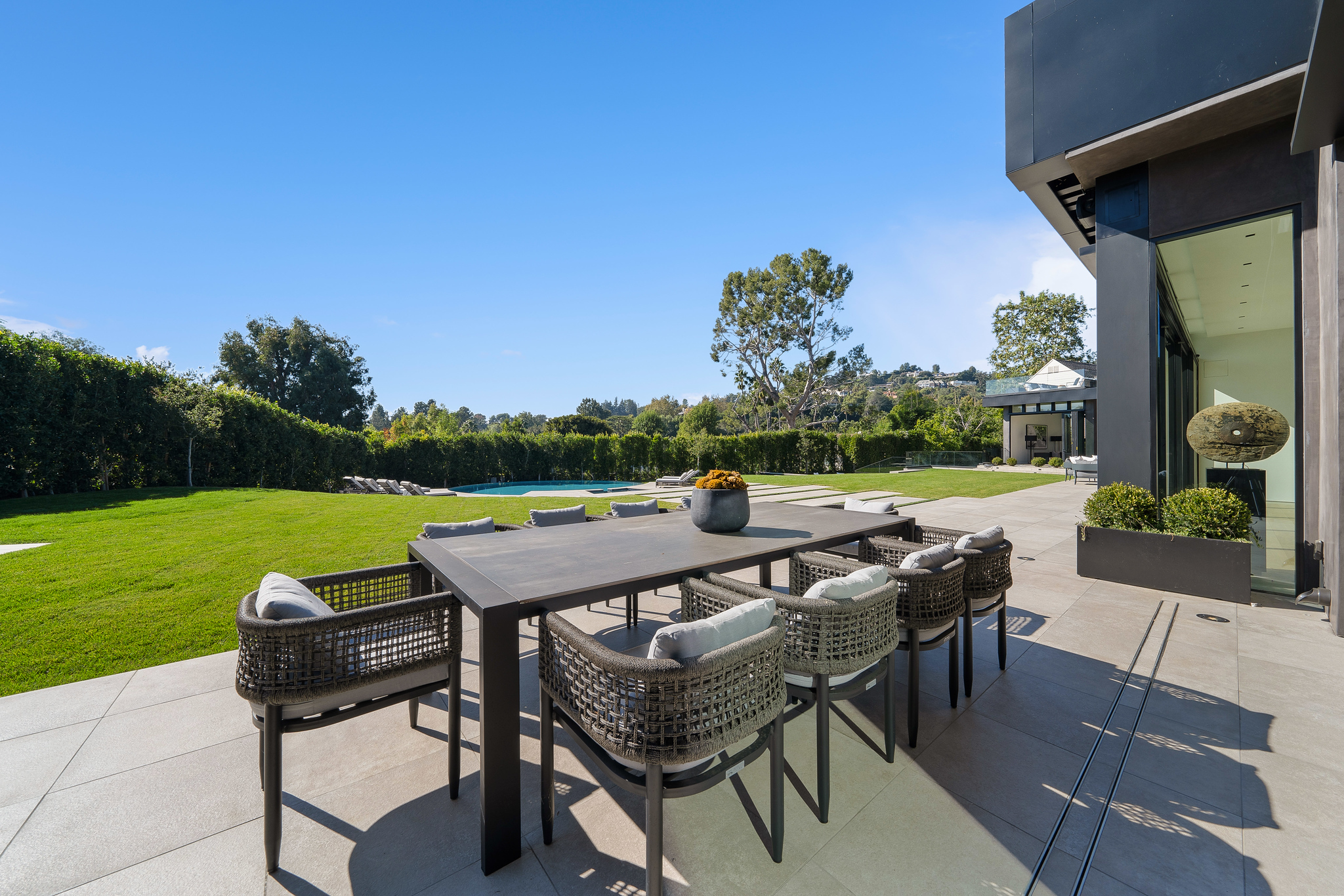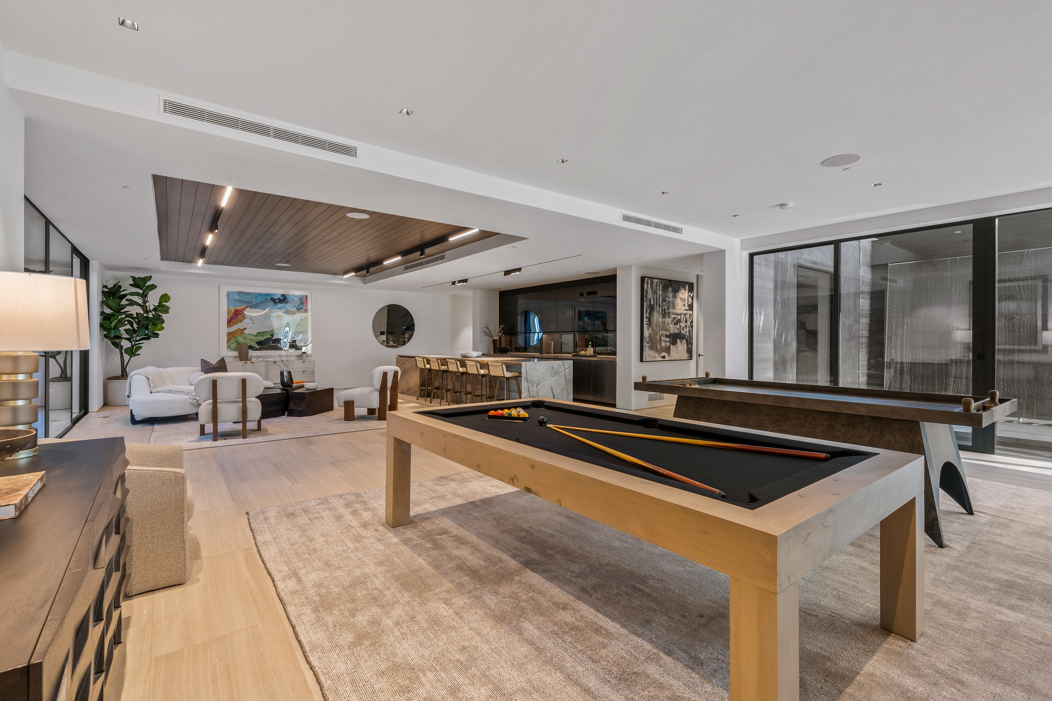 The lower level is a haven for entertainment, offering a stylish bar, a resort-style gym, and a spa that includes a pool, a yoga and massage room. Outside, the manicured grounds feature a pool and spa area alongside a complete BBQ kitchen setup. Situated within a 10-minute radius of Harvard-Westlake Middle School, Westwood, and Beverly Hills, Forza Modern offers a blend of sophistication and convenience in an idyllic location.