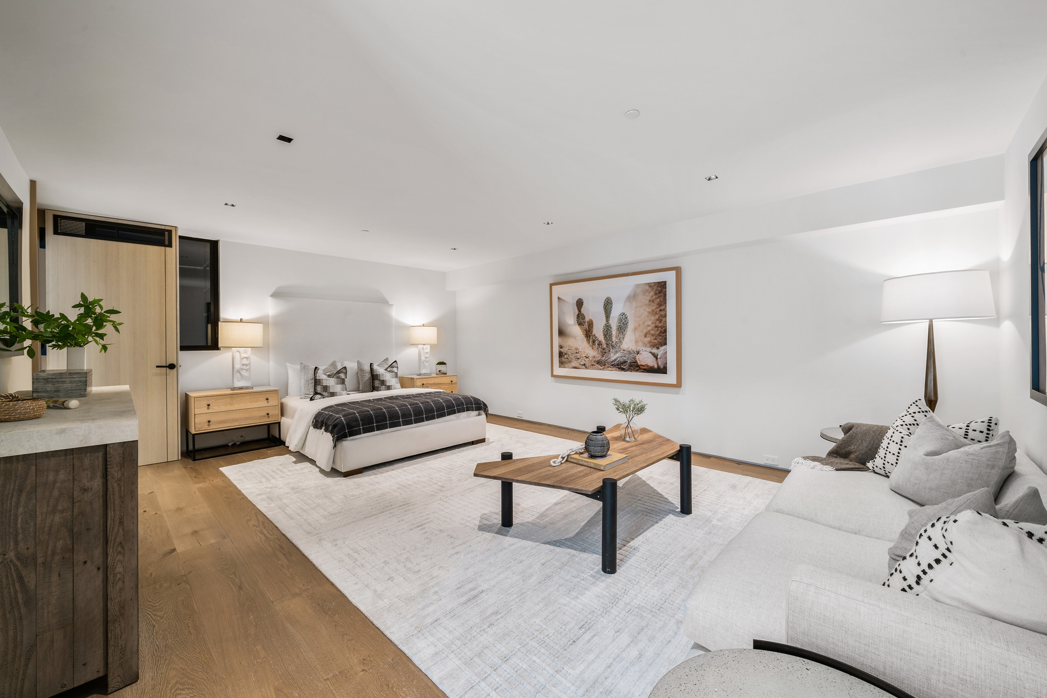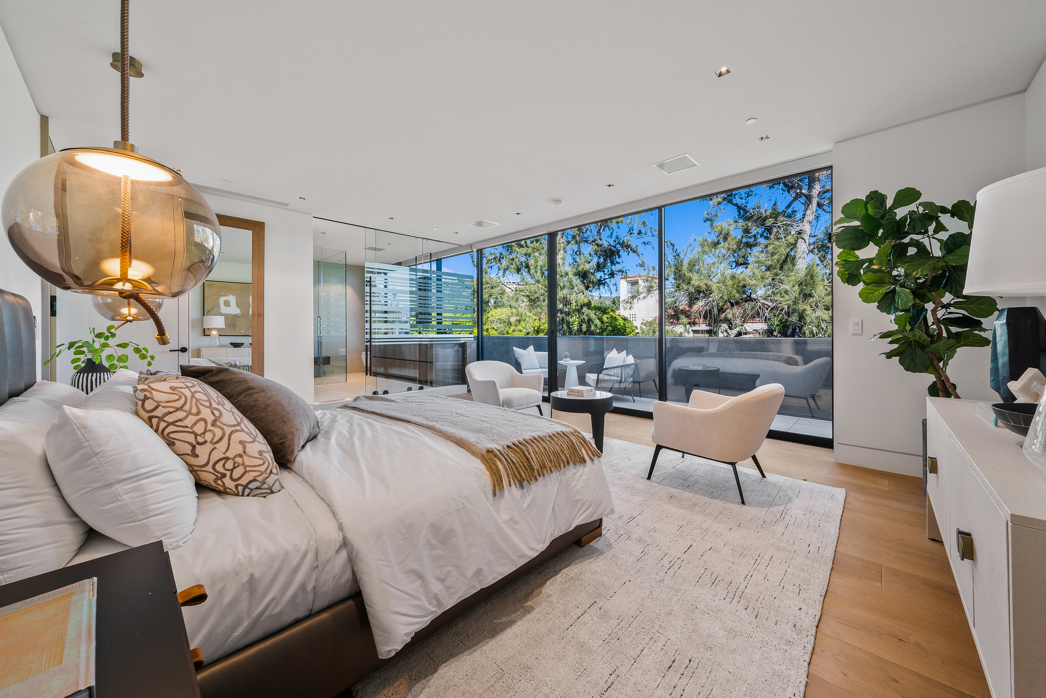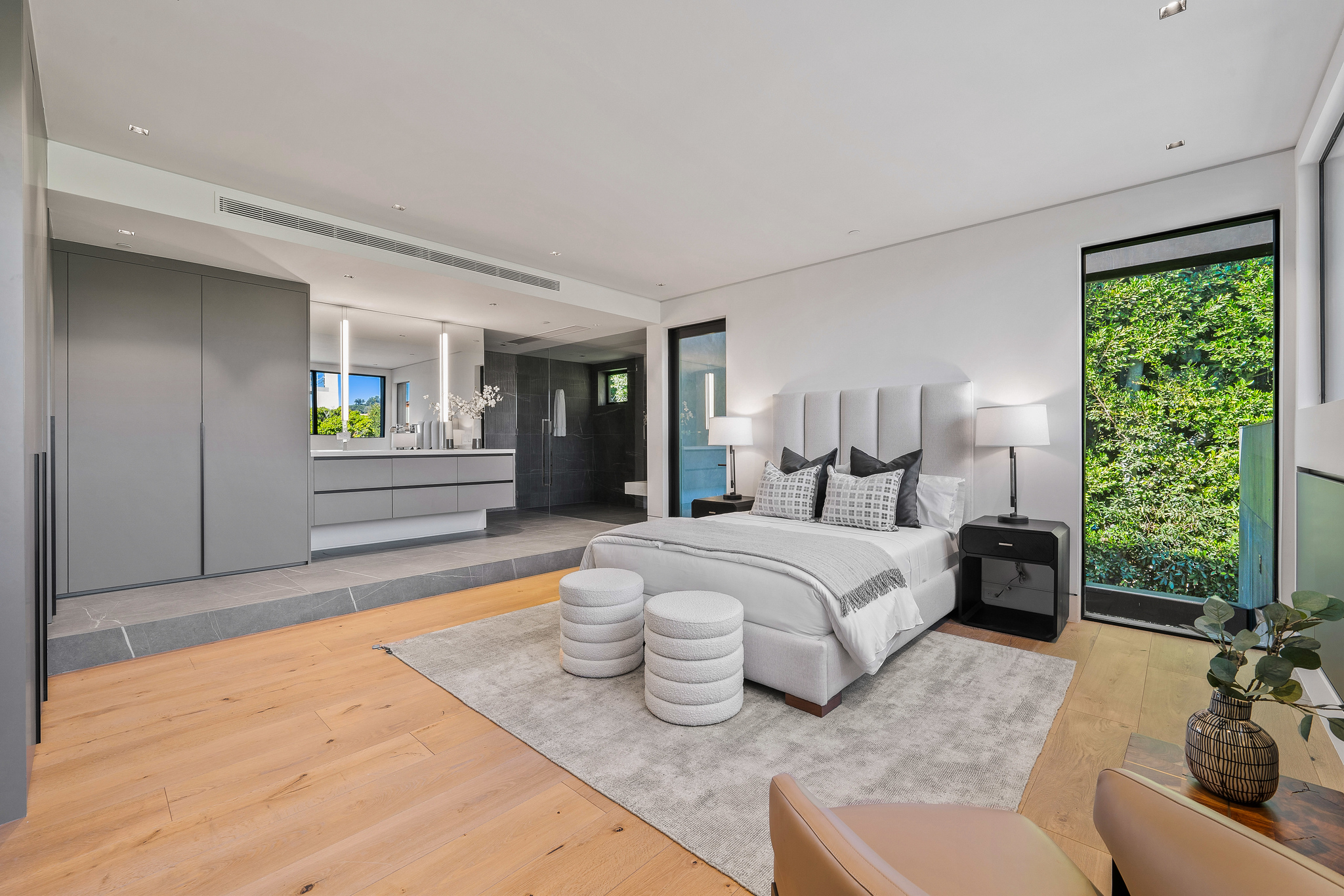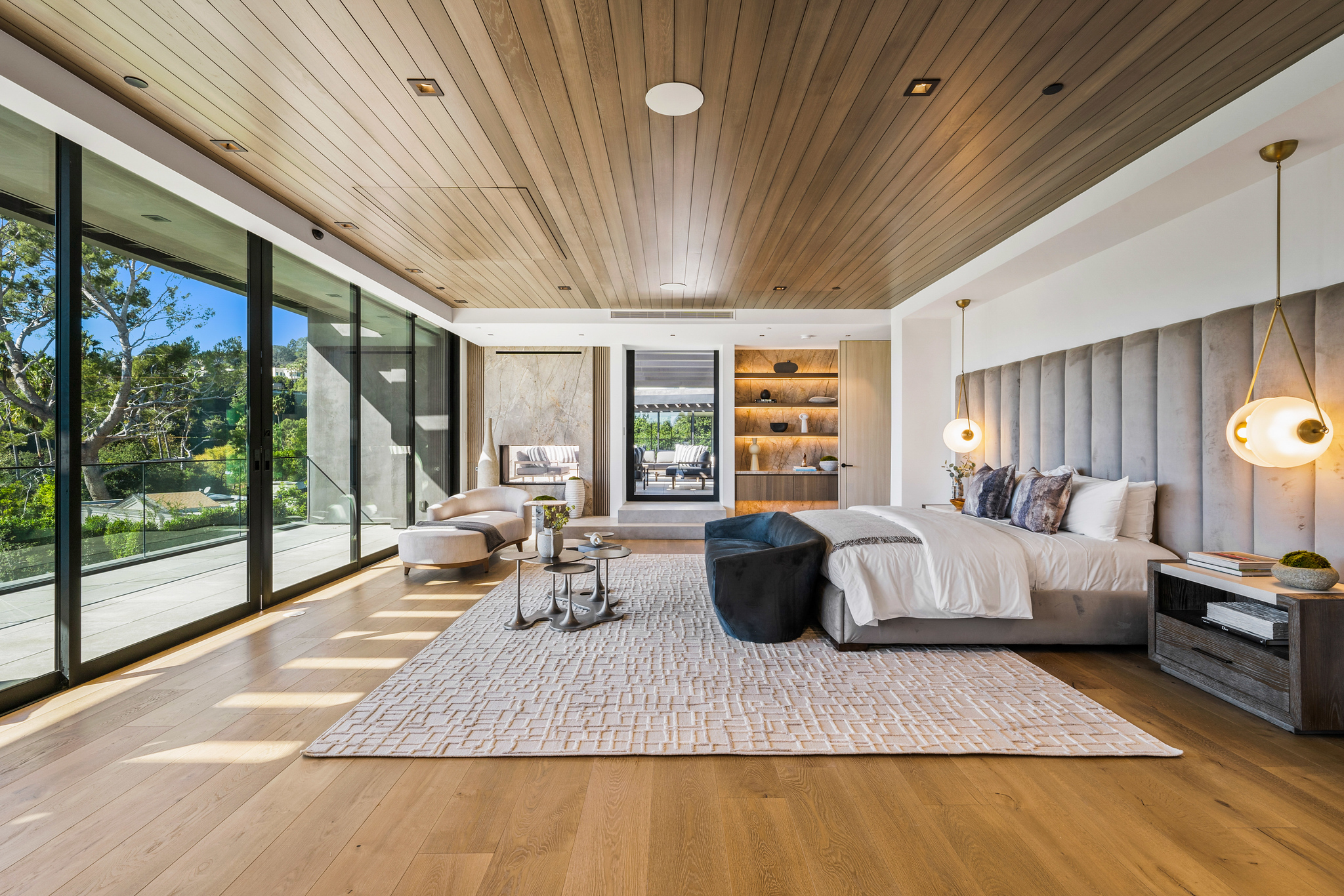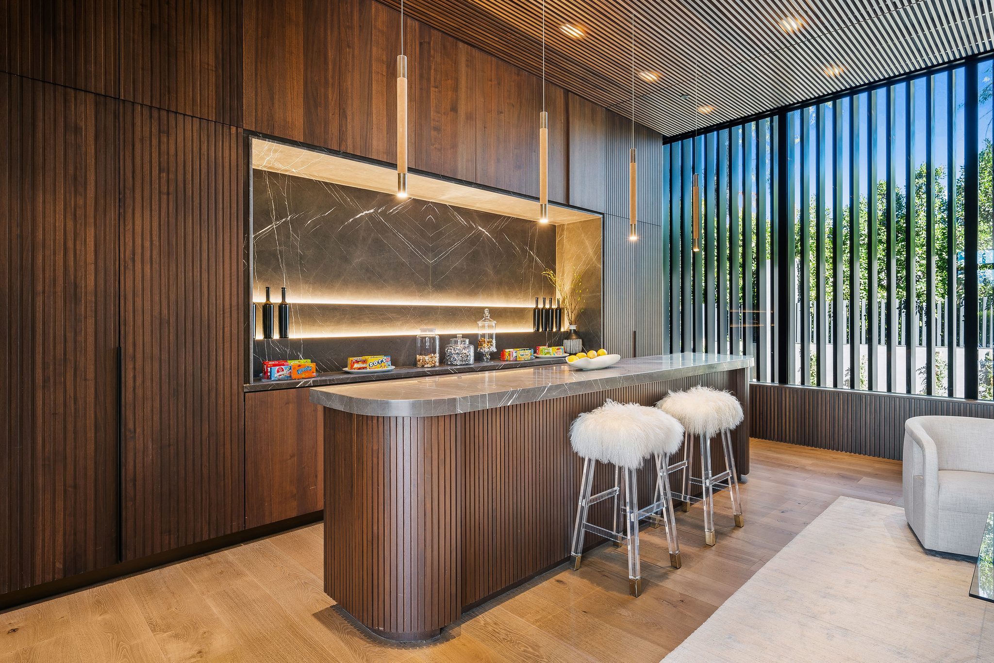 The lower level is a haven for entertainment, offering a stylish bar, a resort-style gym, and a spa that includes a pool, a yoga and massage room. Outside, the manicured grounds feature a pool and spa area alongside a complete BBQ kitchen setup. Situated within a 10-minute radius of Harvard-Westlake Middle School, Westwood, and Beverly Hills, Forza Modern offers a blend of sophistication and convenience in an idyllic location.