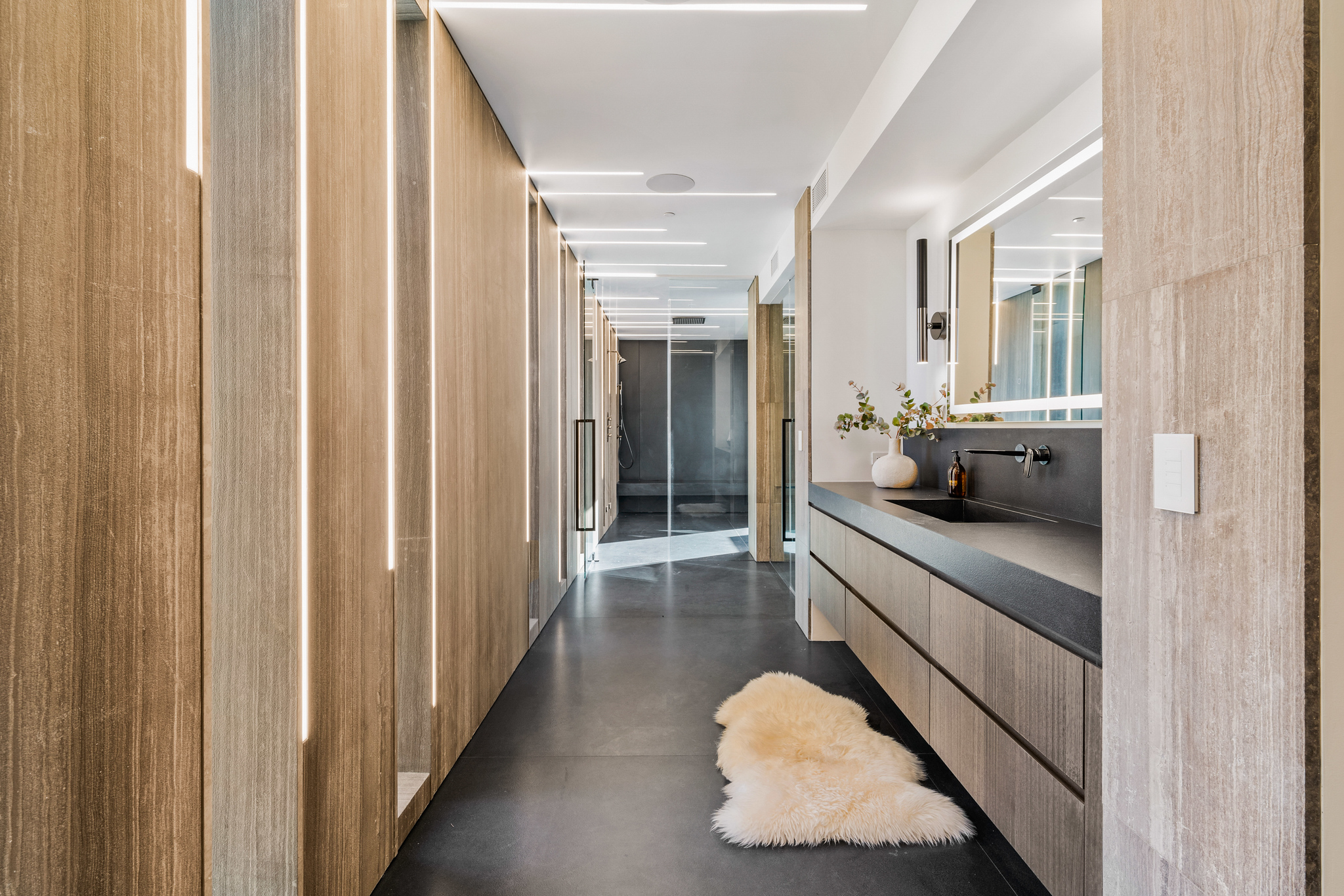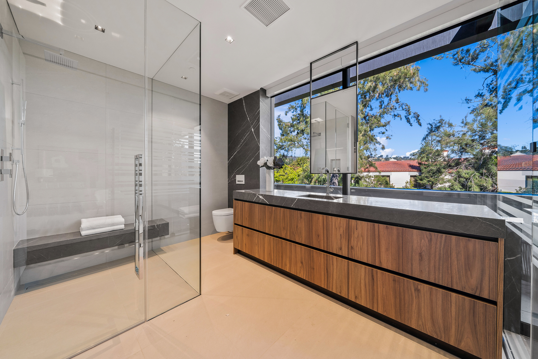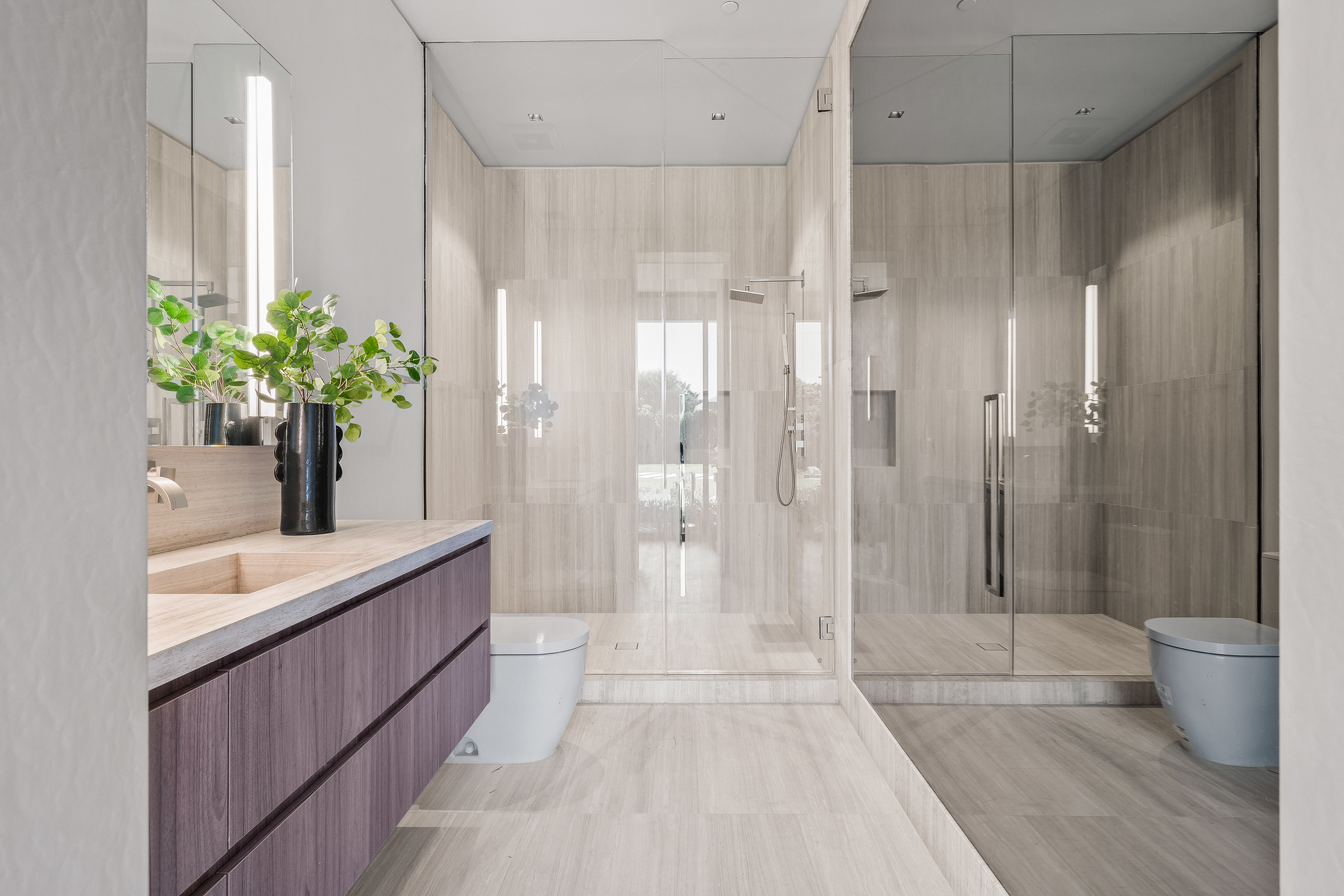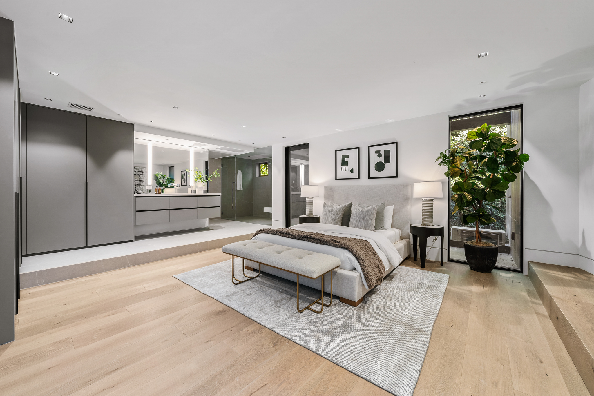 The lower level is a haven for entertainment, offering a stylish bar, a resort-style gym, and a spa that includes a pool, a yoga and massage room. Outside, the manicured grounds feature a pool and spa area alongside a complete BBQ kitchen setup. Situated within a 10-minute radius of Harvard-Westlake Middle School, Westwood, and Beverly Hills, Forza Modern offers a blend of sophistication and convenience in an idyllic location.