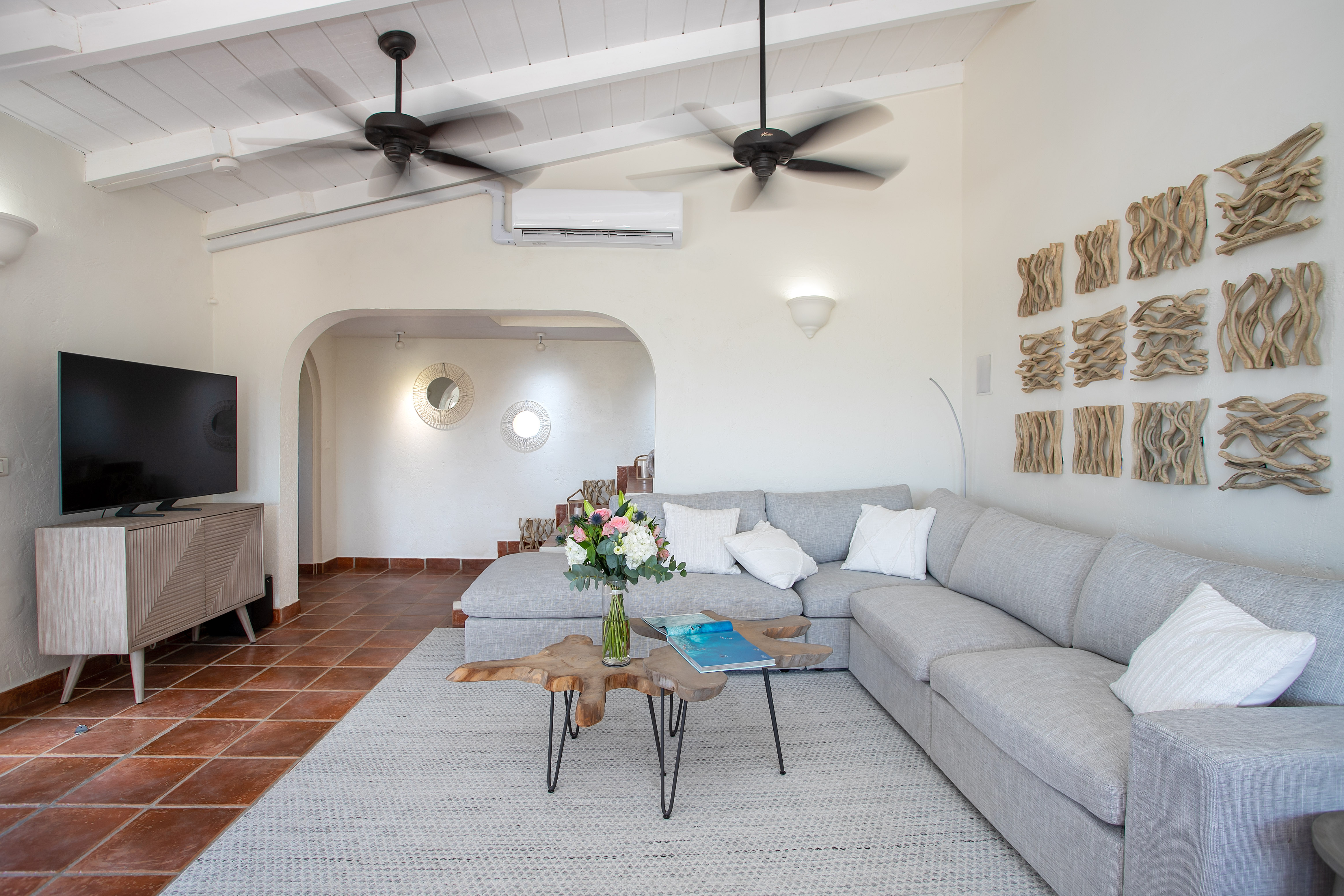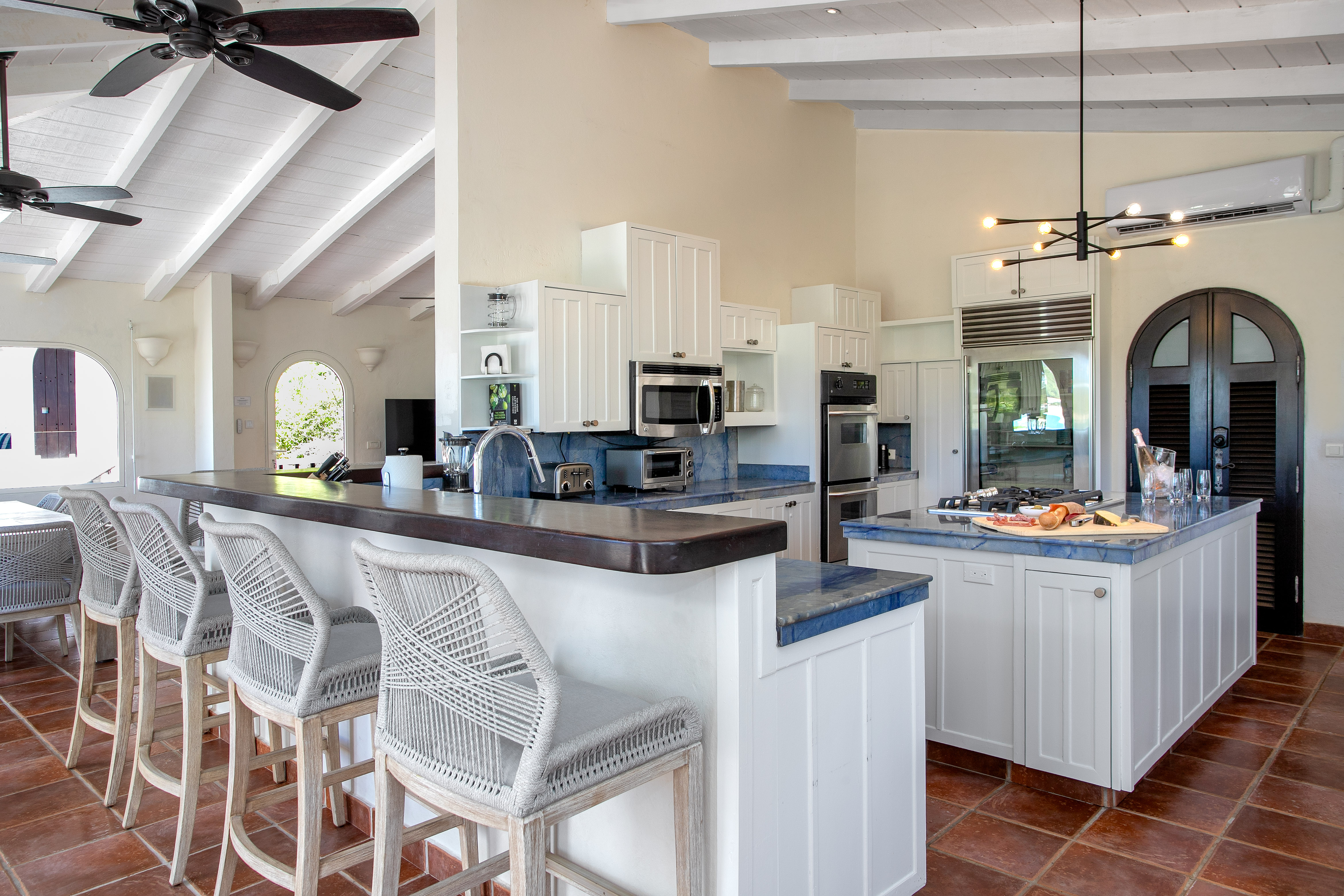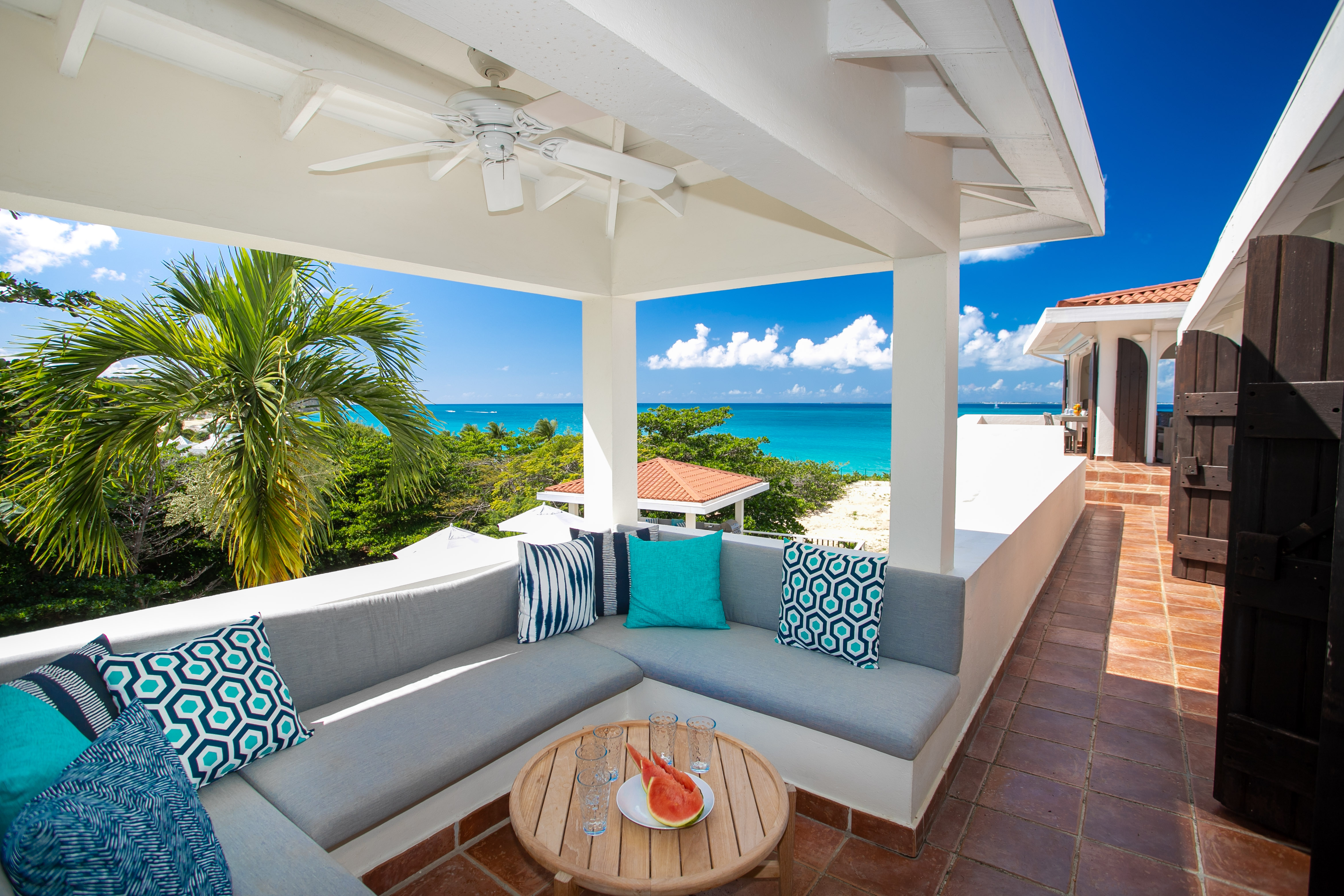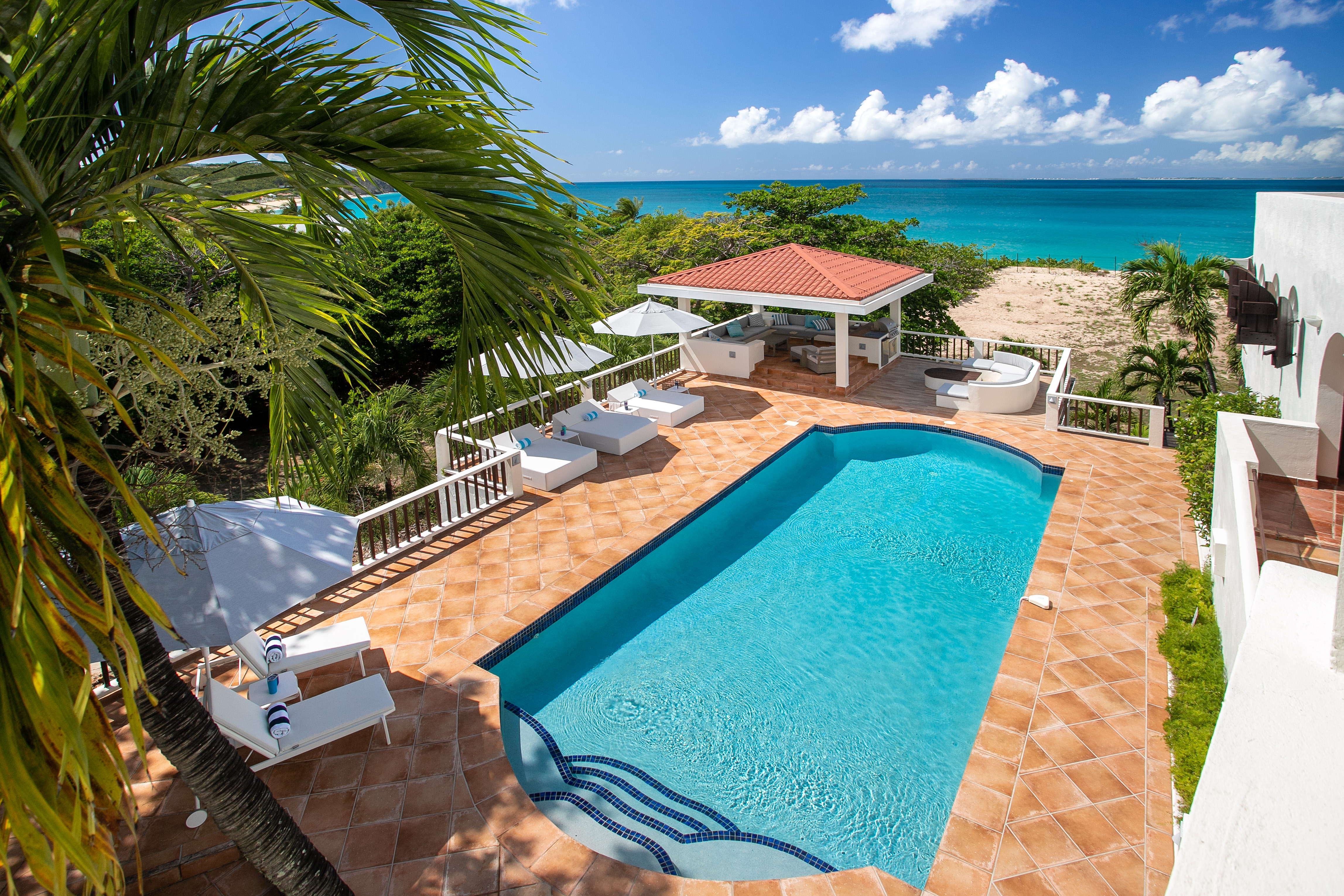 This stunning Villa is fully air conditioned, with a fully refurbished multi level layout and a modern coastal aesthetic to complement its Mediterranean architecture. The main living area is comprised of an open-plan living and dining area with a fully-equipped kitchen featuring stainless steel appliances, gas range, wine fridge, and coffee / espresso bar. Step outside to discover one of the three covered gazebos for alfresco dining or lounging on one of the multiple plush seating options.