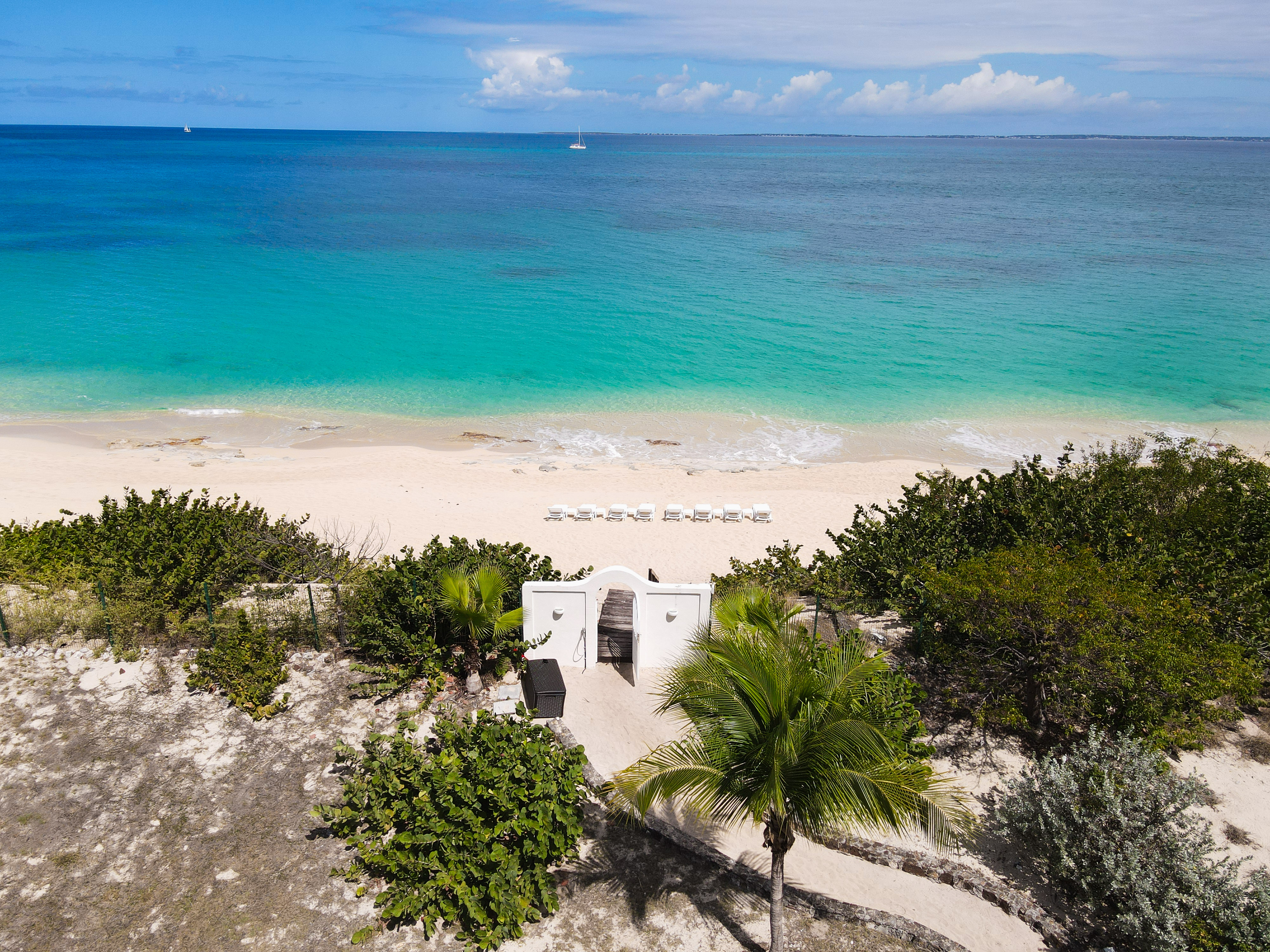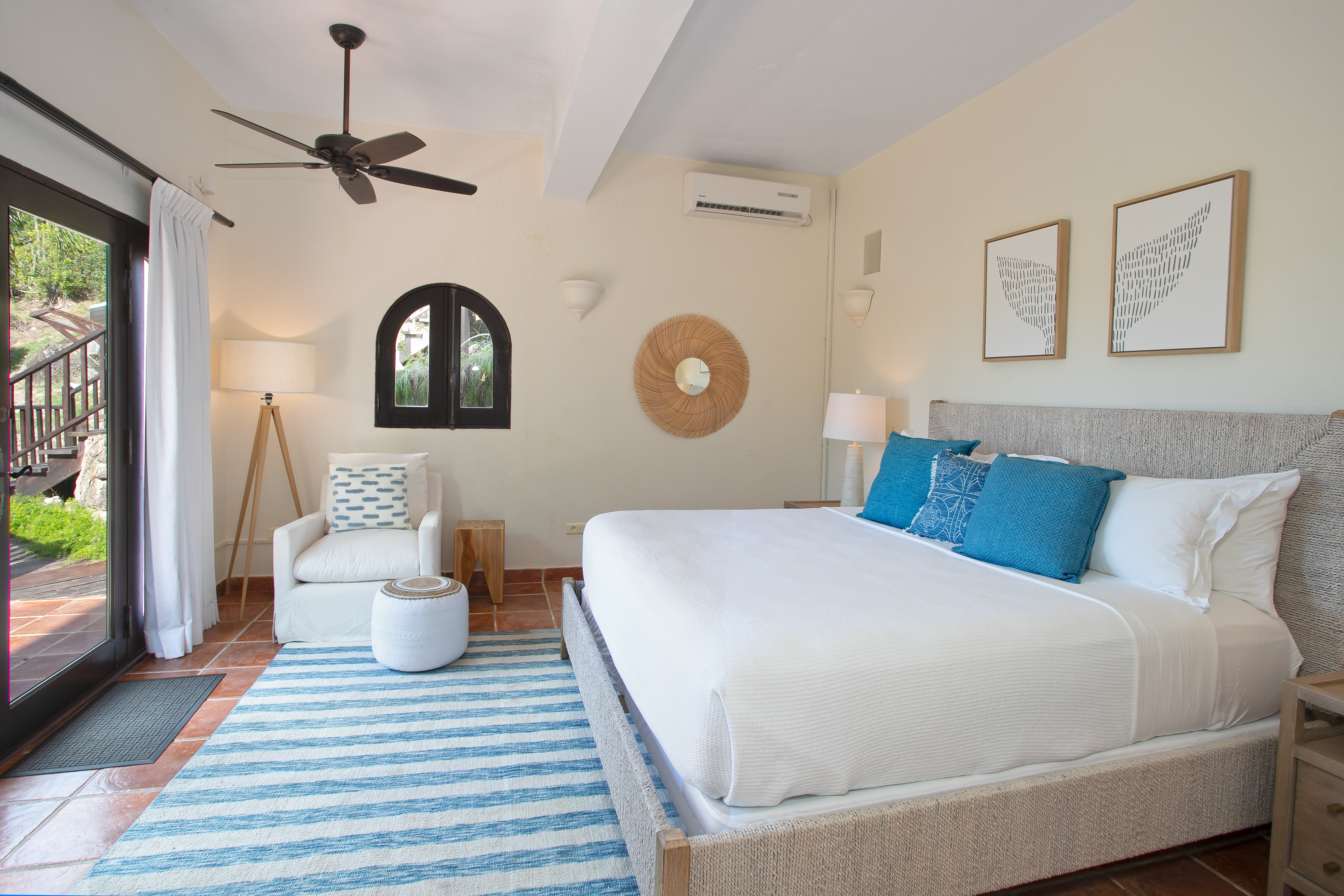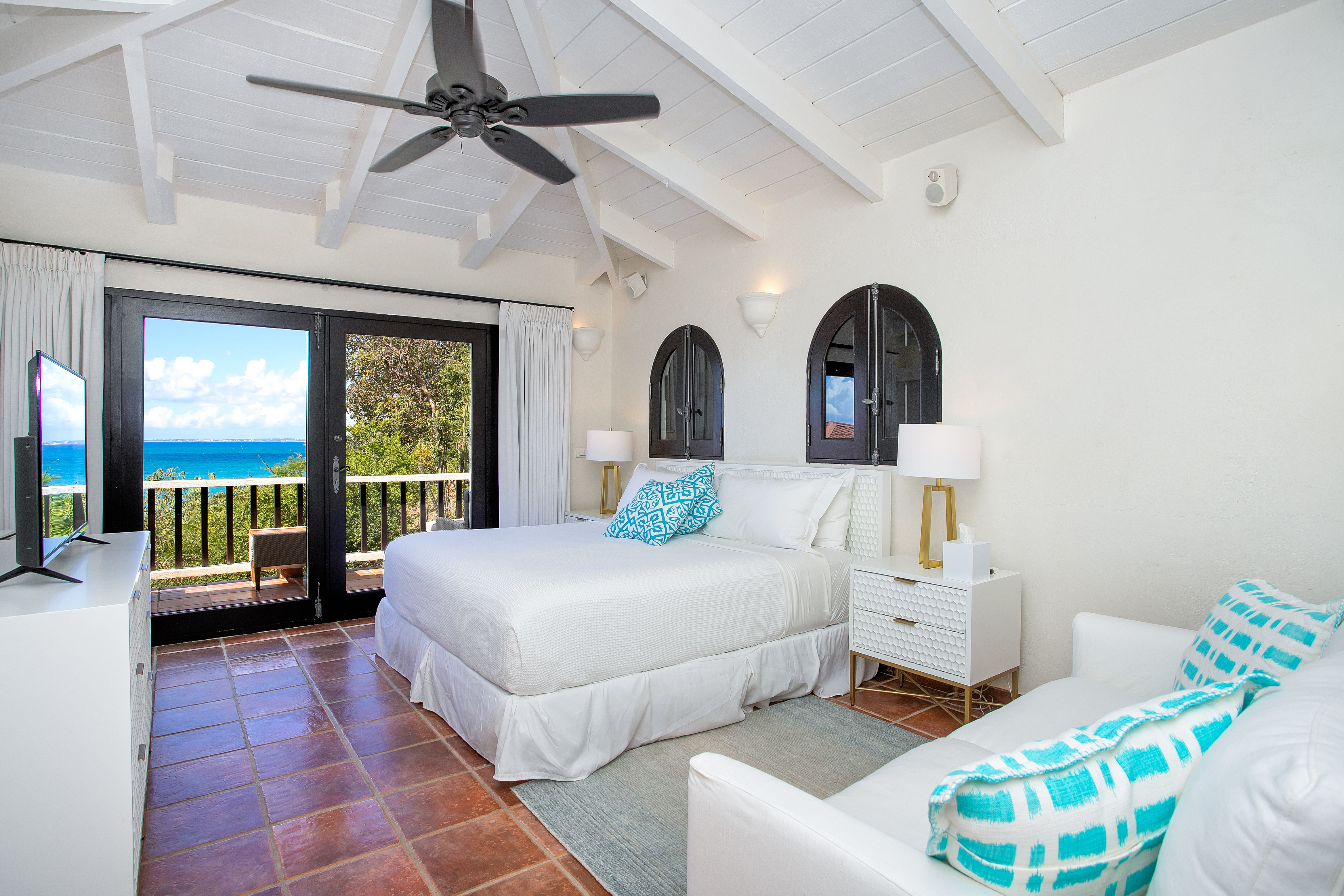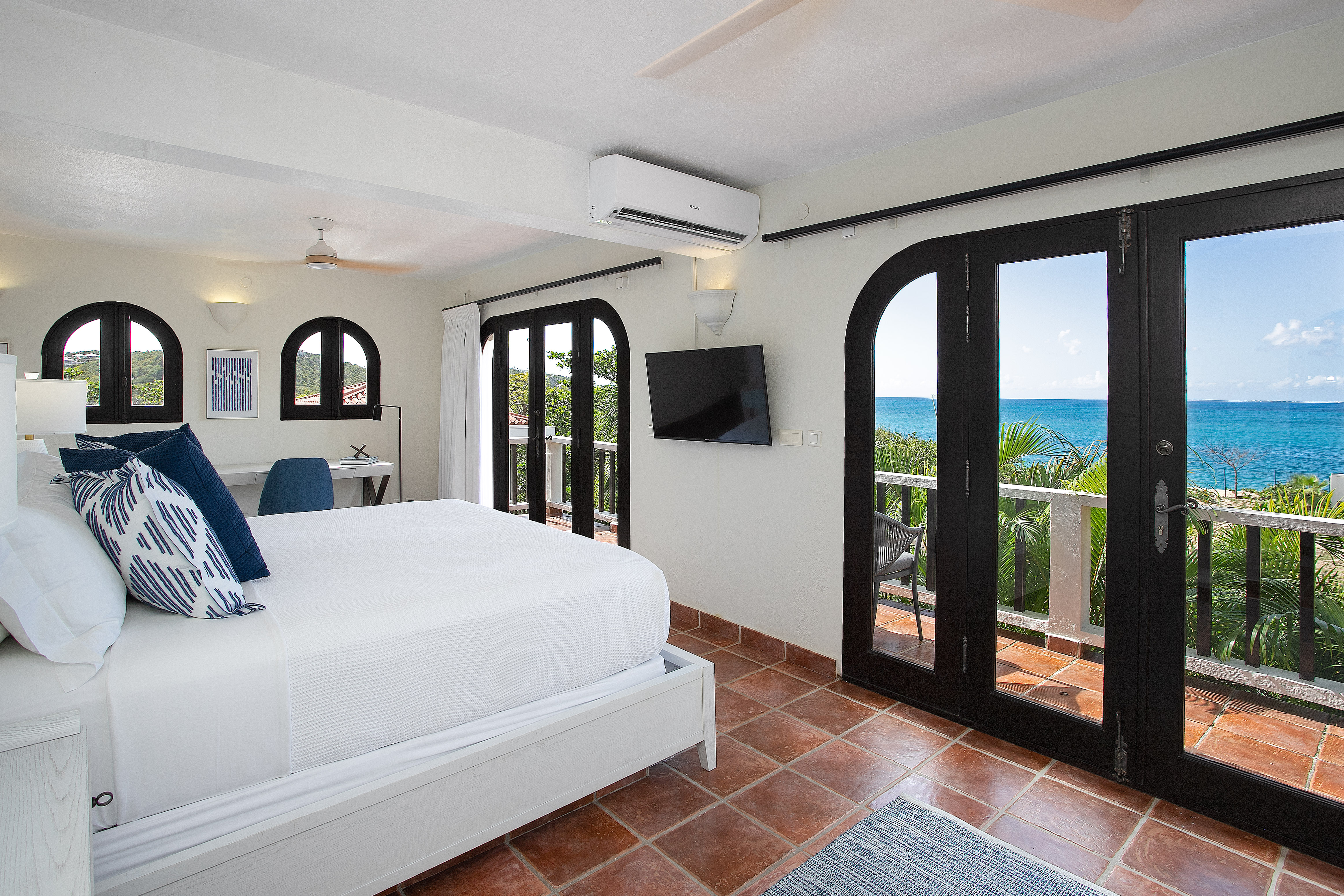 Ideal for a group of friends or family, offering three king-size bedrooms and a new private Cottage. The main house offers three luxurious bedrooms, each with a balcony overlooking the ocean, walk-in closets, safes, and en suite bathrooms featuring double vanities and oversized showers. One bedroom also features a sleeper sofa, and two rooms have desks. All bedrooms and bathrooms in the main house are equipped with 110v/220v 60Hz outlets and USB connections.