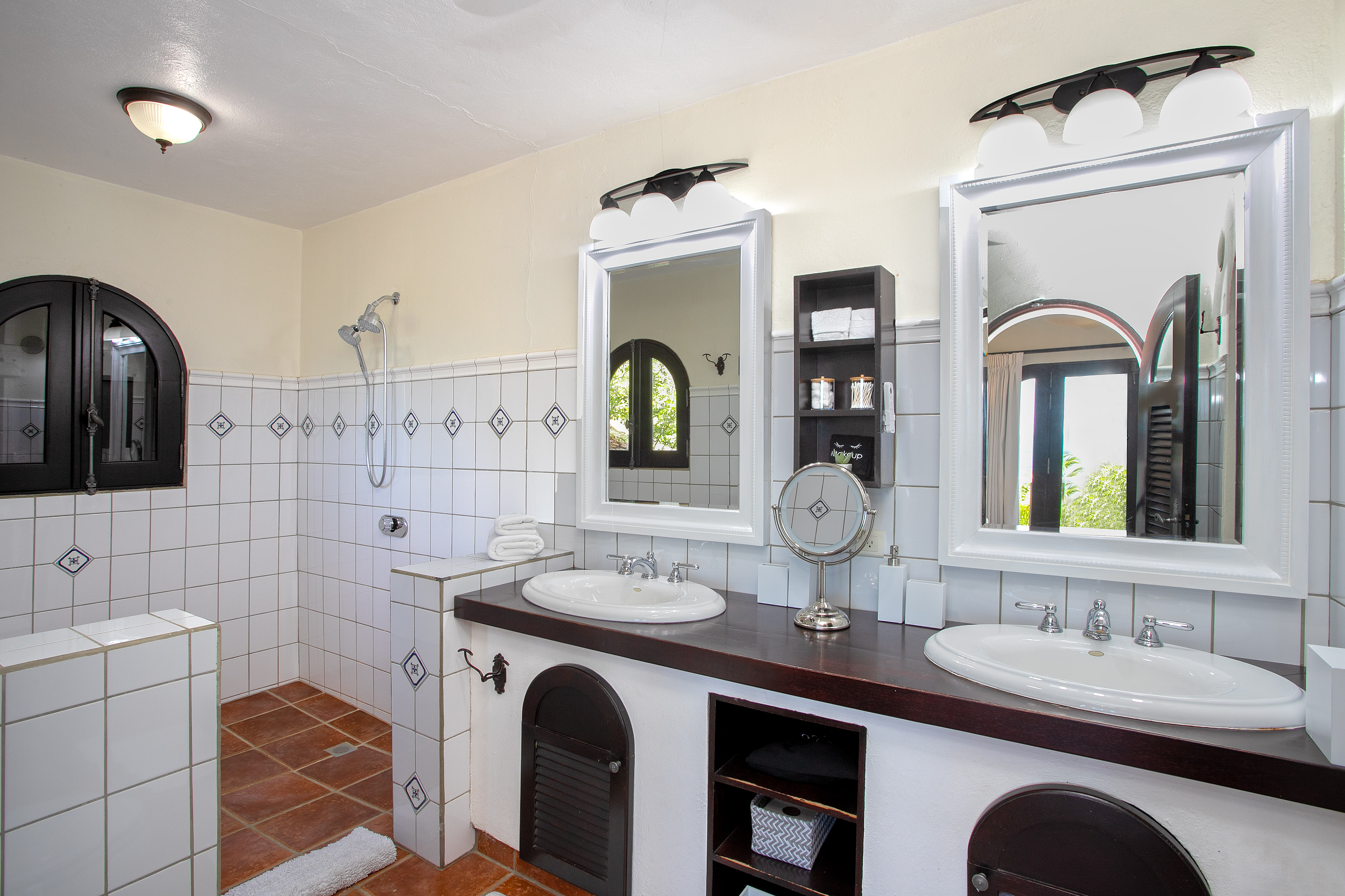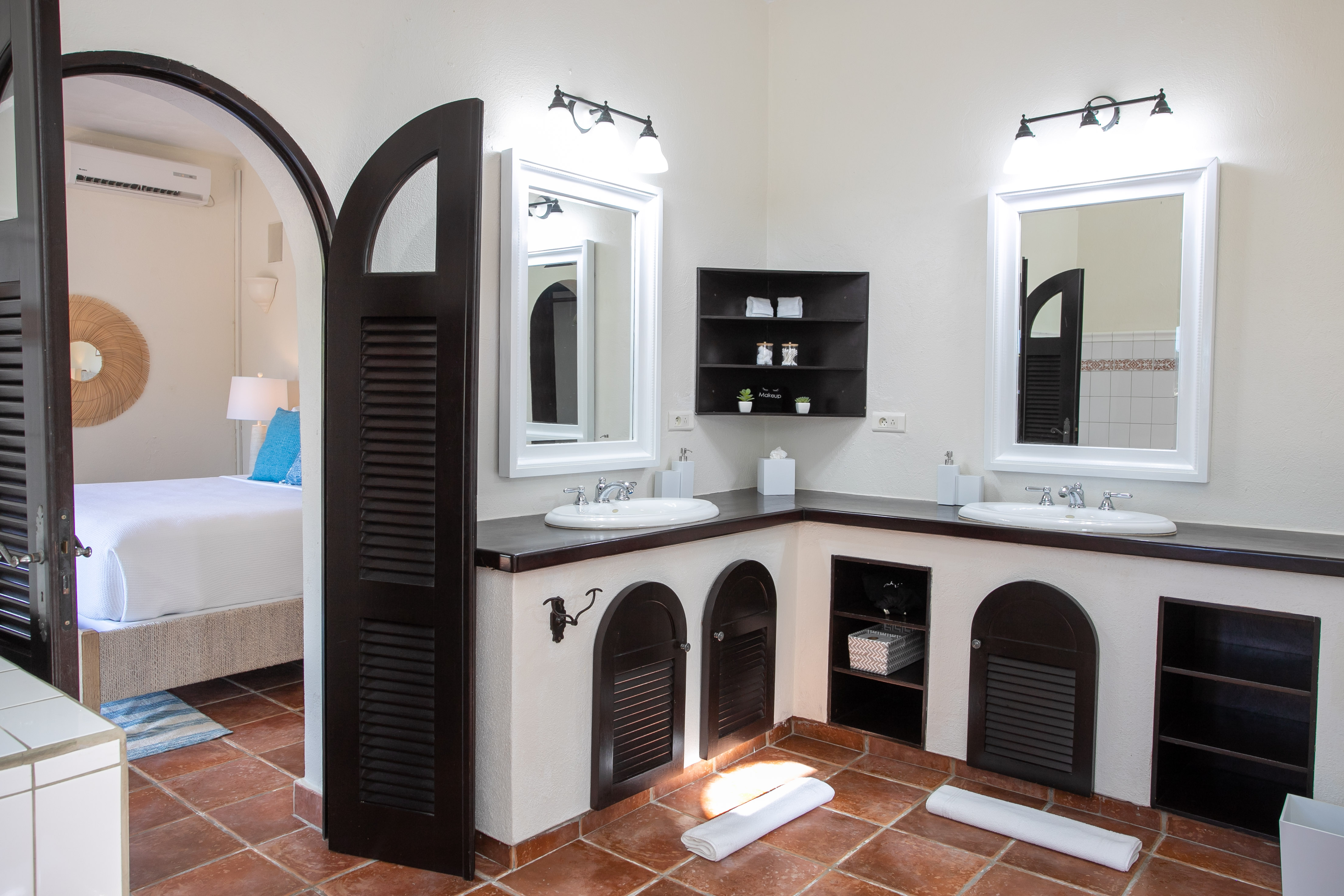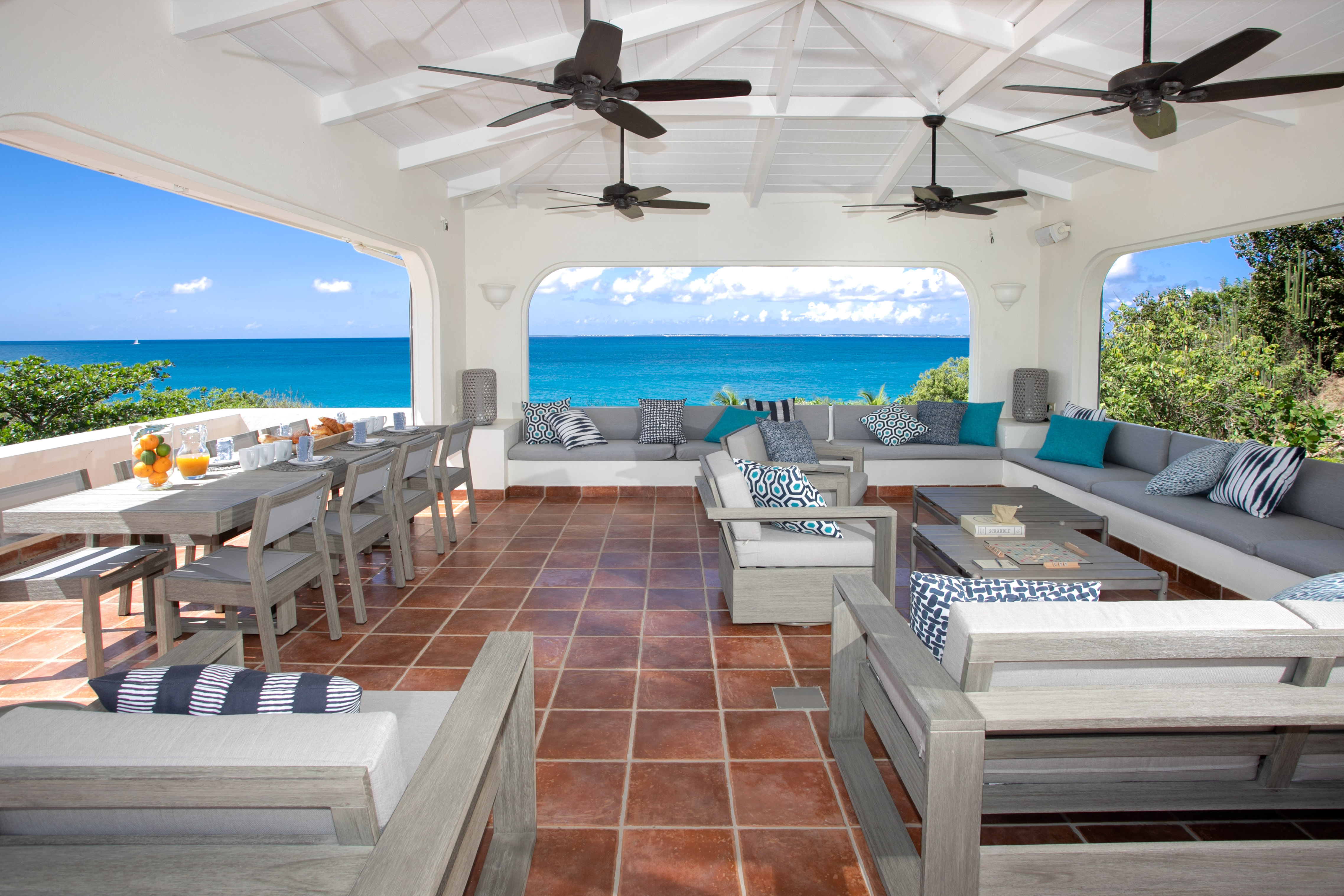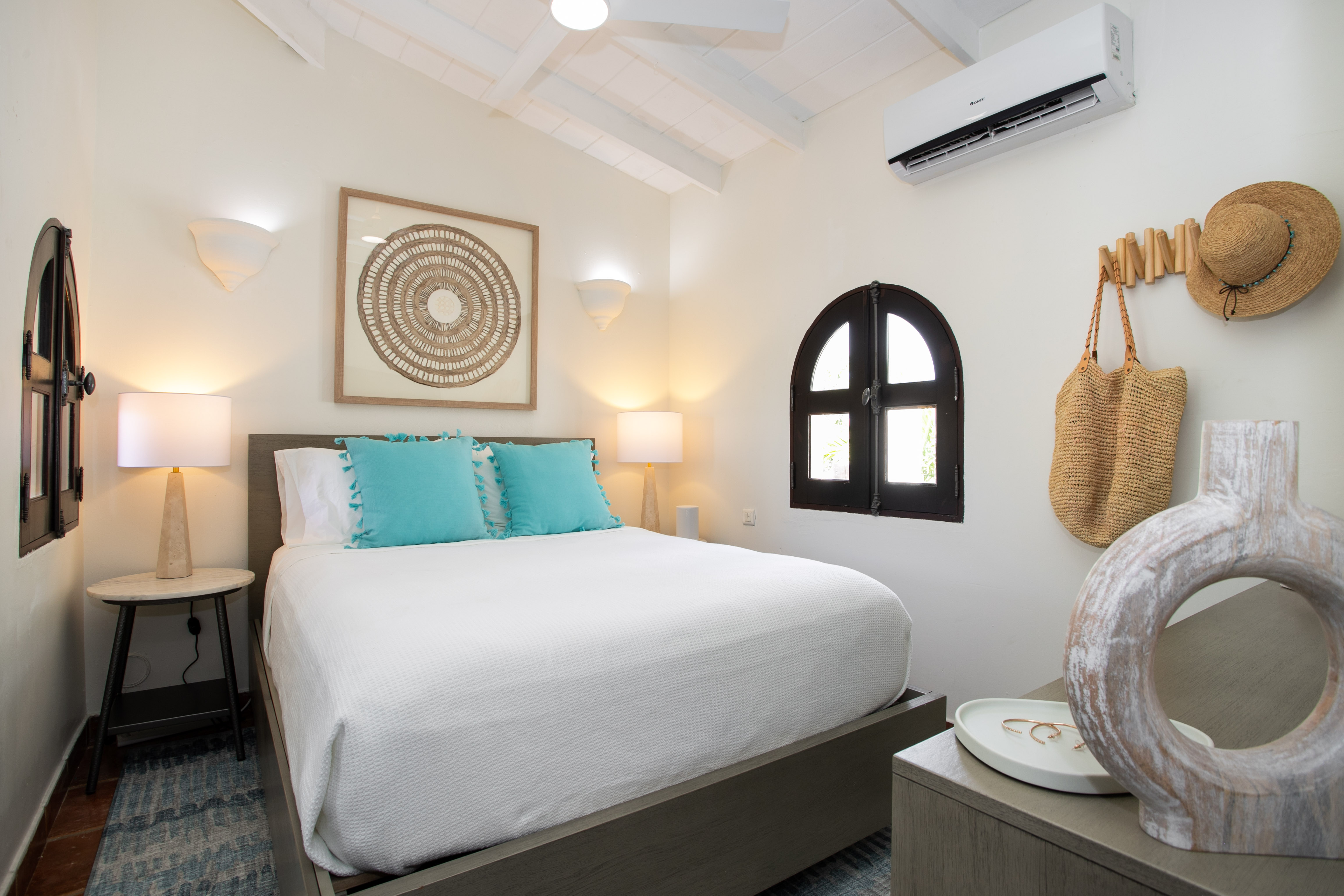Ideal for a group of friends or family, offering three king-size bedrooms and a new private Cottage. The main house offers three luxurious bedrooms, each with a balcony overlooking the ocean, walk-in closets, safes, and en suite bathrooms featuring double vanities and oversized showers. One bedroom also features a sleeper sofa, and two rooms have desks. All bedrooms and bathrooms in the main house are equipped with 110v/220v 60Hz outlets and USB connections.