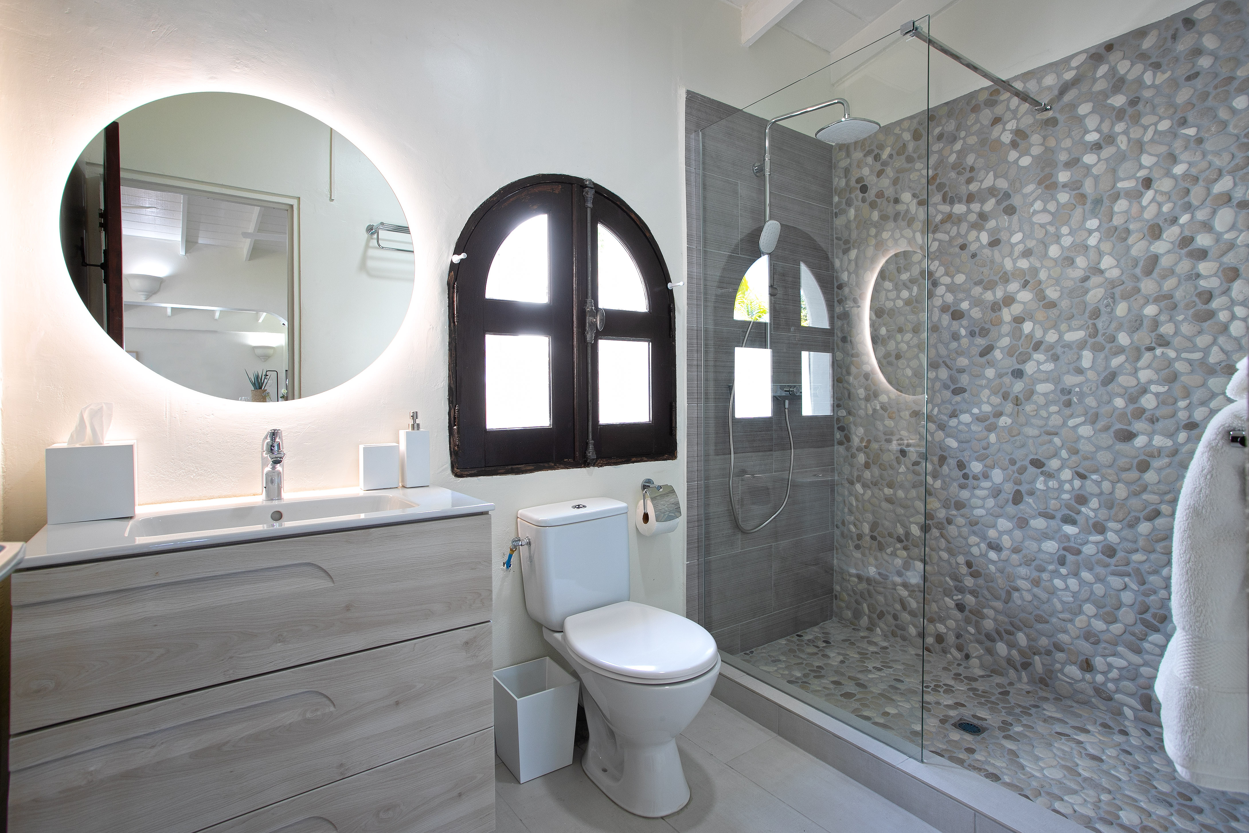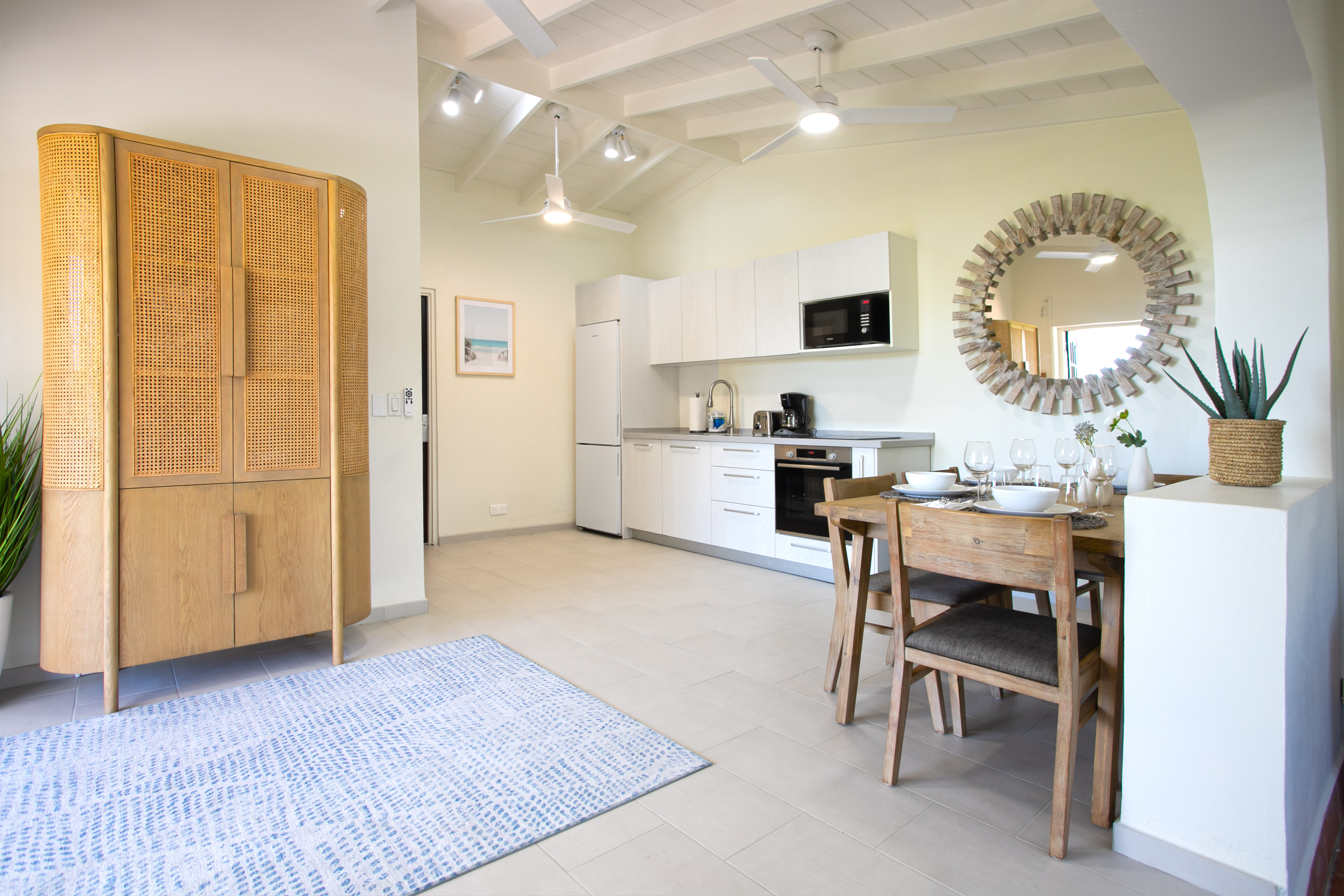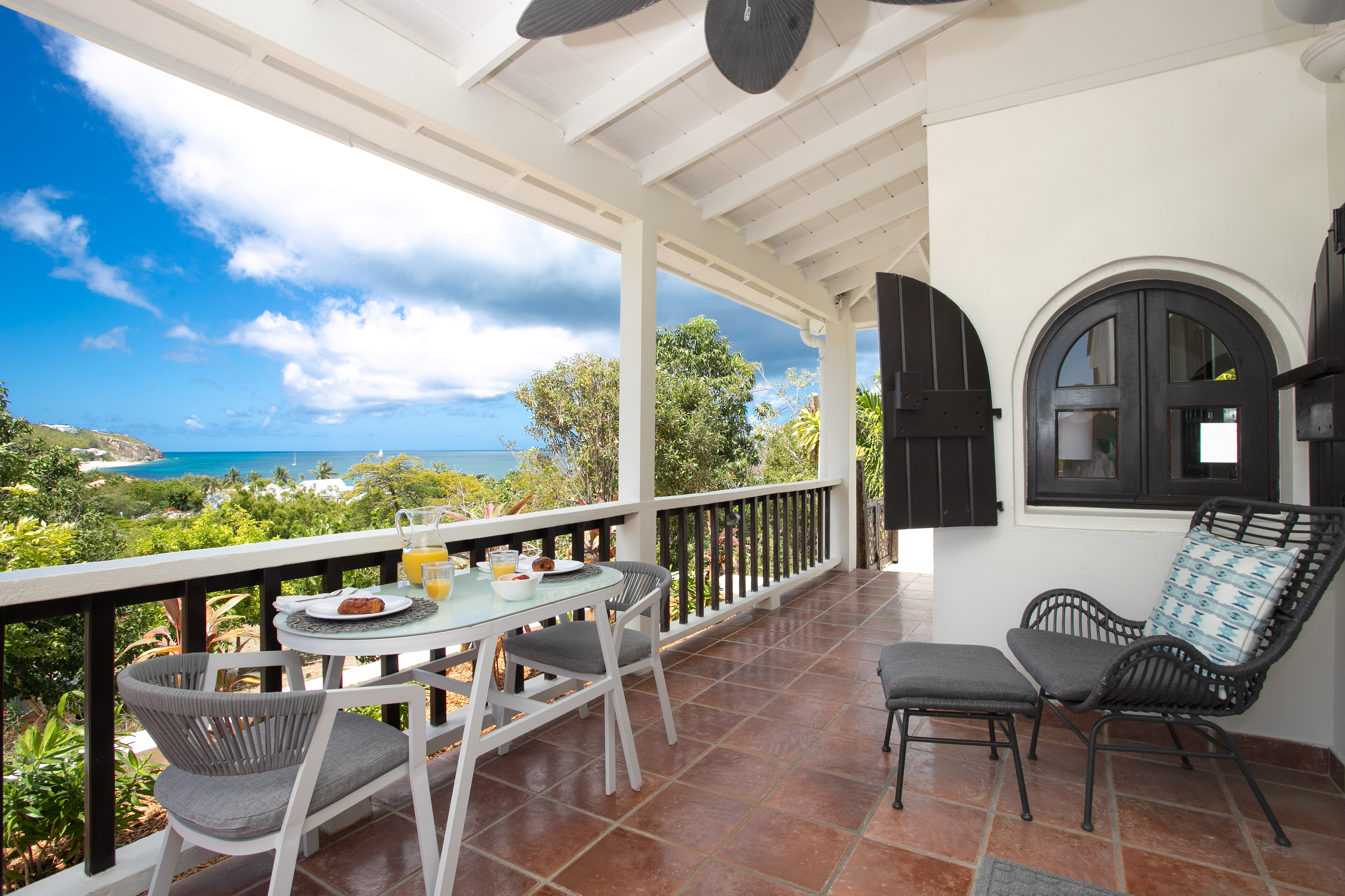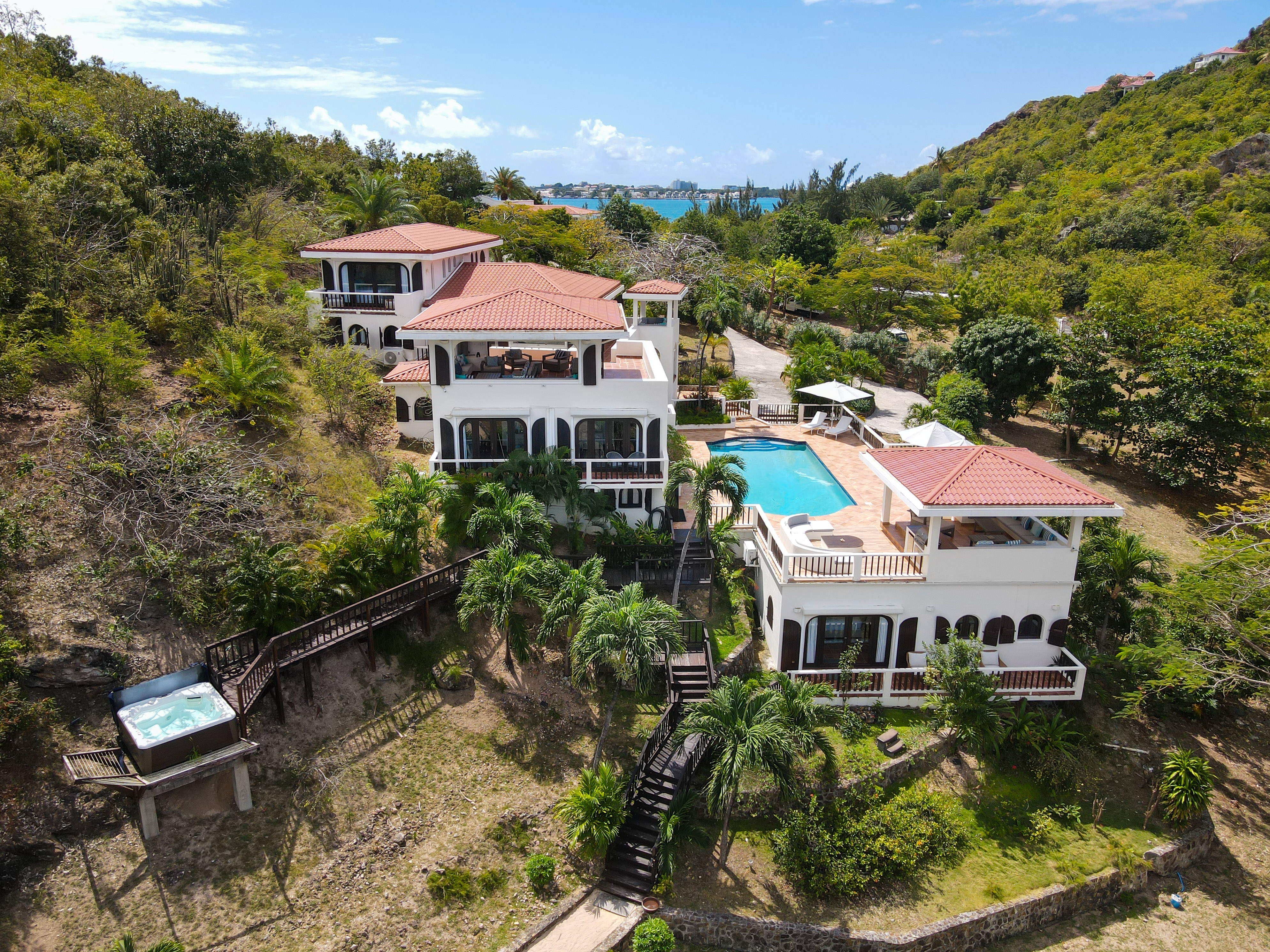 The newly added fourth bedroom is a beautifully remodelled 500-square-foot cottage, located just 150 feet from the main house. This standalone guest house has been completely transformed in the same contemporary style as the villa. Inside, you’ll find a queen-size bed, an en-suite bathroom, a kitchen equipped with modern appliances, and a cozy living room with a sofa bed—ideal for a couple and a small child. Adding to its charm, the front porch offers stunning ocean views, while the back sundeck overlooks the tranquil waters of Simpson Bay, creating the perfect setting to relax and unwind.