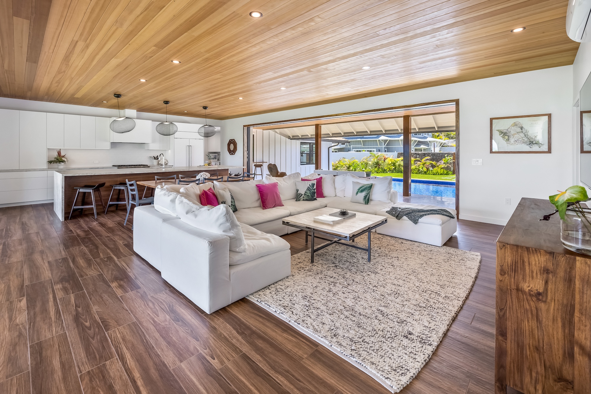 The generous common area encompasses a well-appointed kitchen with stainless steel appliances and a sizable countertop with barstools, creating the perfect space for any chef to feel at home while entertaining guests. Adjacent to the kitchen, the dining table with seating for 8 complements the living area, featuring a plush couch and a flatscreen television. Through open-face doors, the common area seamlessly flows onto the large covered lanai (porch), furnished with chaise lounge chairs and tables, offering breathtaking views of the lush flora and the ocean beyond. This is an ideal spot to bask in the tropical sunshine during the day or unwind while watching the vibrant Hawaiian sunset. Around the corner, the large private swimming pool, surrounded by tropical plants, beckons with deep and shallow water levels.