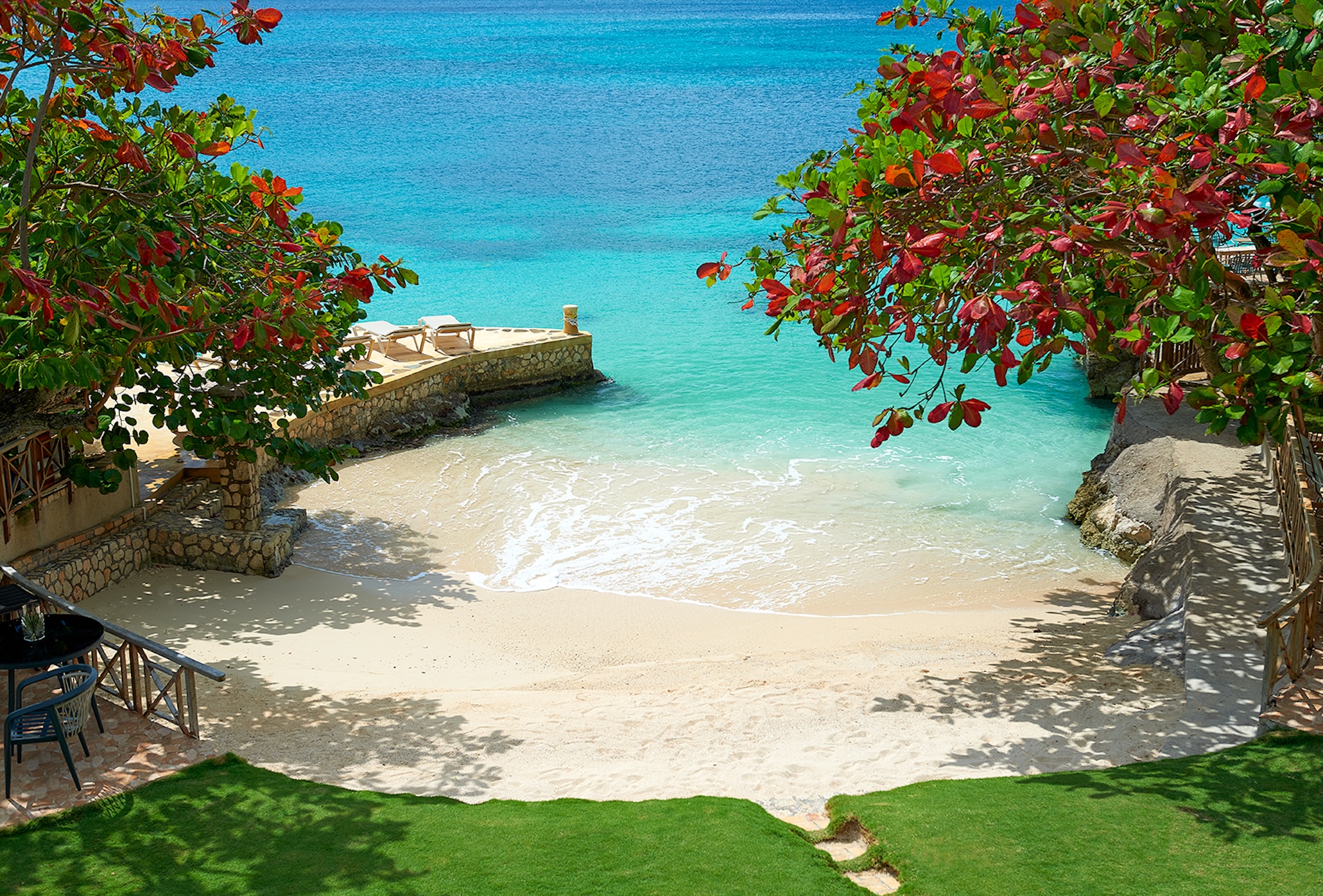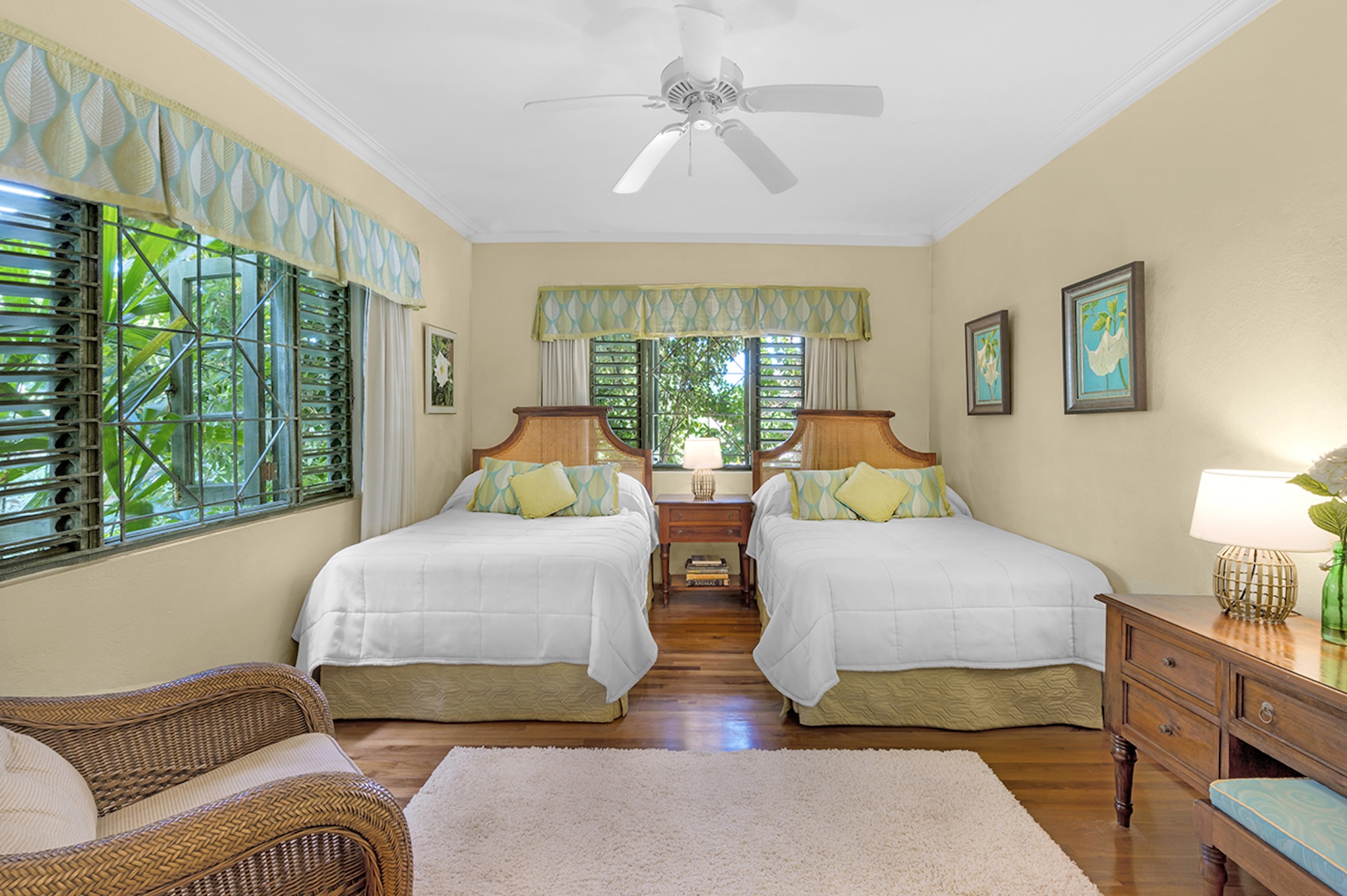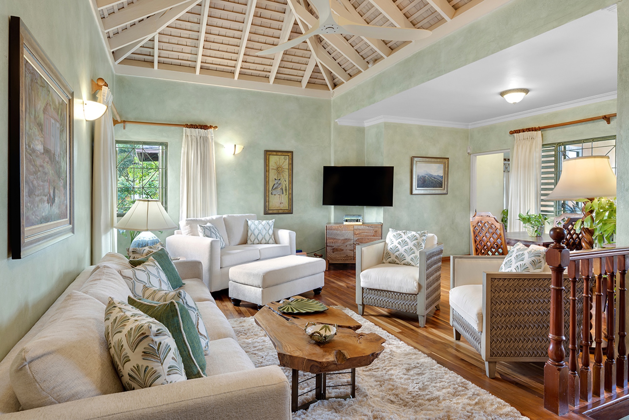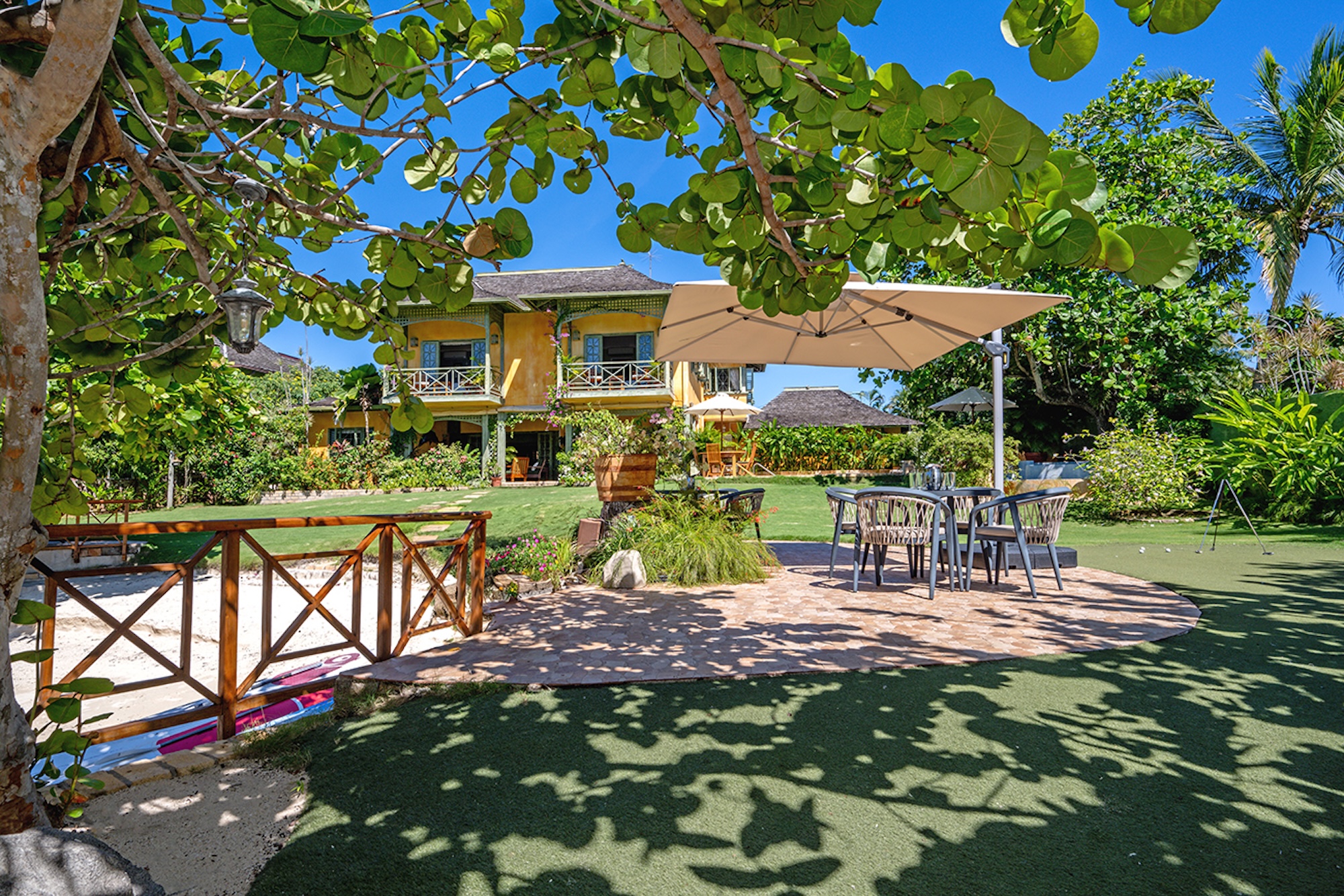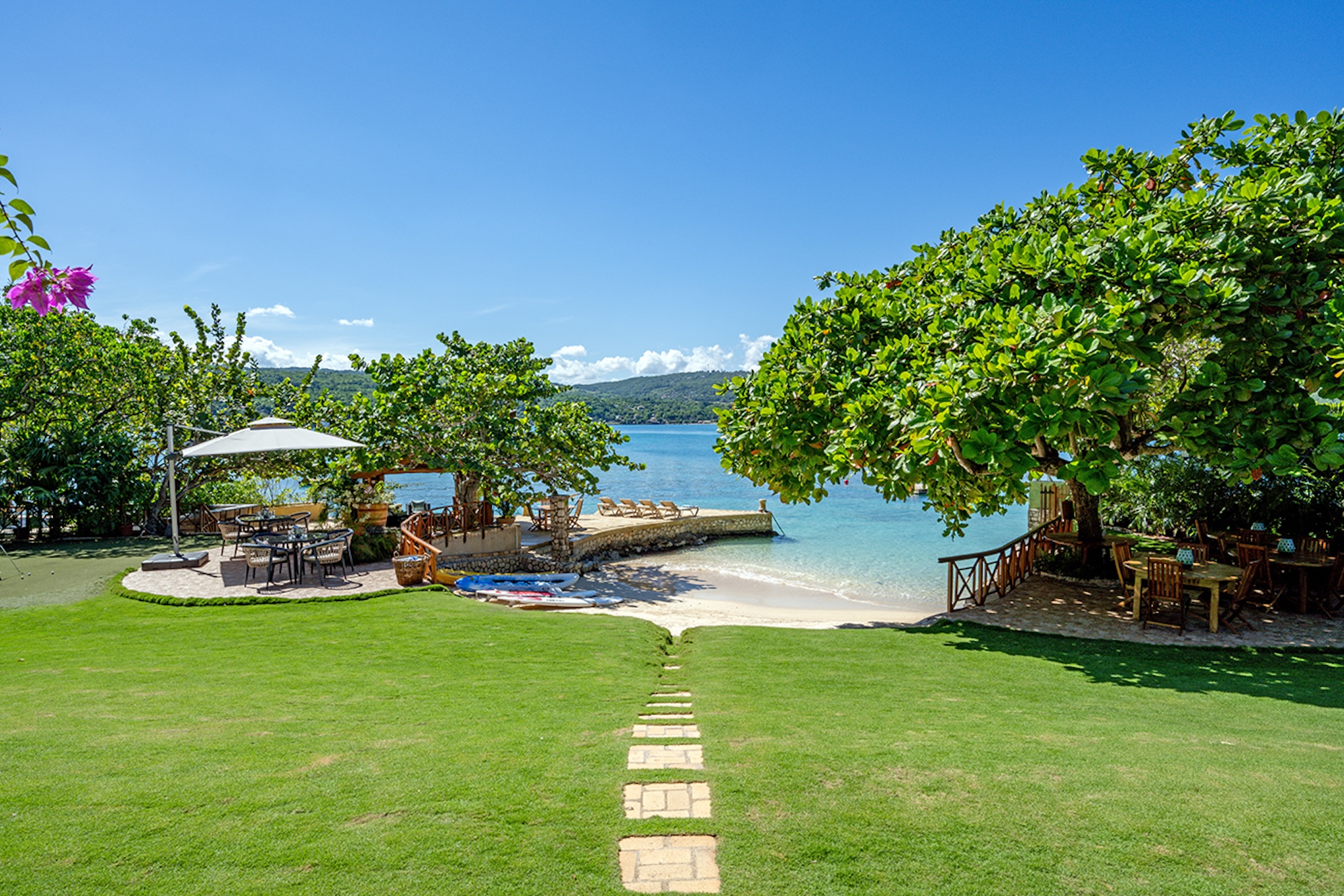 Flowering vines spill across windows and trellises—bougainvillea, hibiscus, shrimp flower, and oleander—drawing hummingbirds and the island’s famed yellowbird. Inside, vibrant tropical hues and curated artwork create a relaxed yet refined ambiance. A path of stepping stones crosses the lush lawn to Keela Wee’s 100-foot ribbon of soft sand and crystalline sea, where complimentary kayaks and an offshore sunning platform invite long, unhurried days on the water just steps from the verandah.